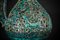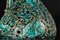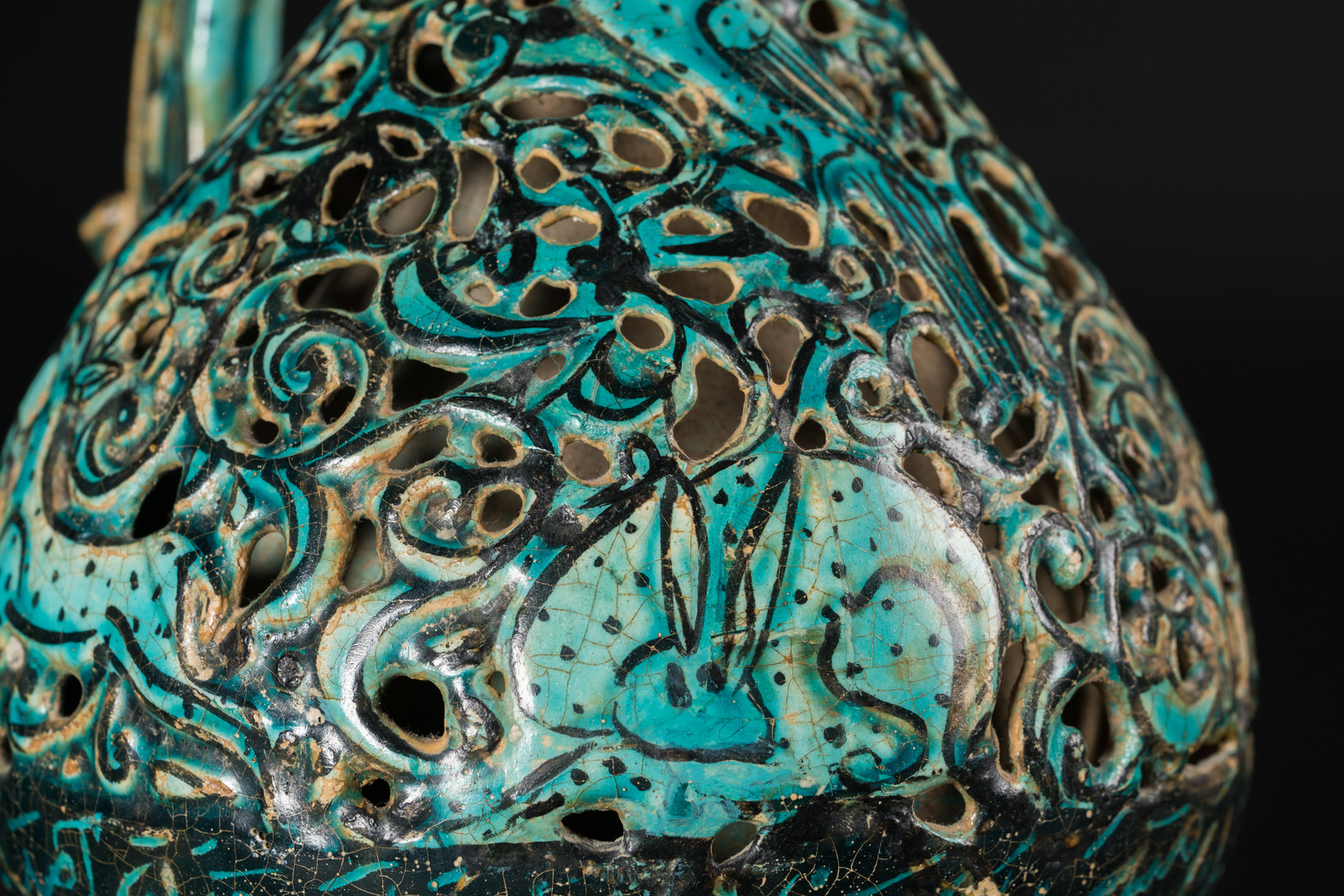 Il corpo è finemente lavorato a traforo secondo una tecnica tipica della lavorazione del metallo coeva. In questo esemplare la decorazione aperta segue uno schema di volute vegetali interrotte da animali dipinti in nero, Banda calligrafica in riserva su nero in prossimità del margine inferiore dell'oggetto. L'oggetto è ricoperto dalla caratteristica invetriatura turchese che lascia scoperto solo il piede.