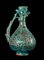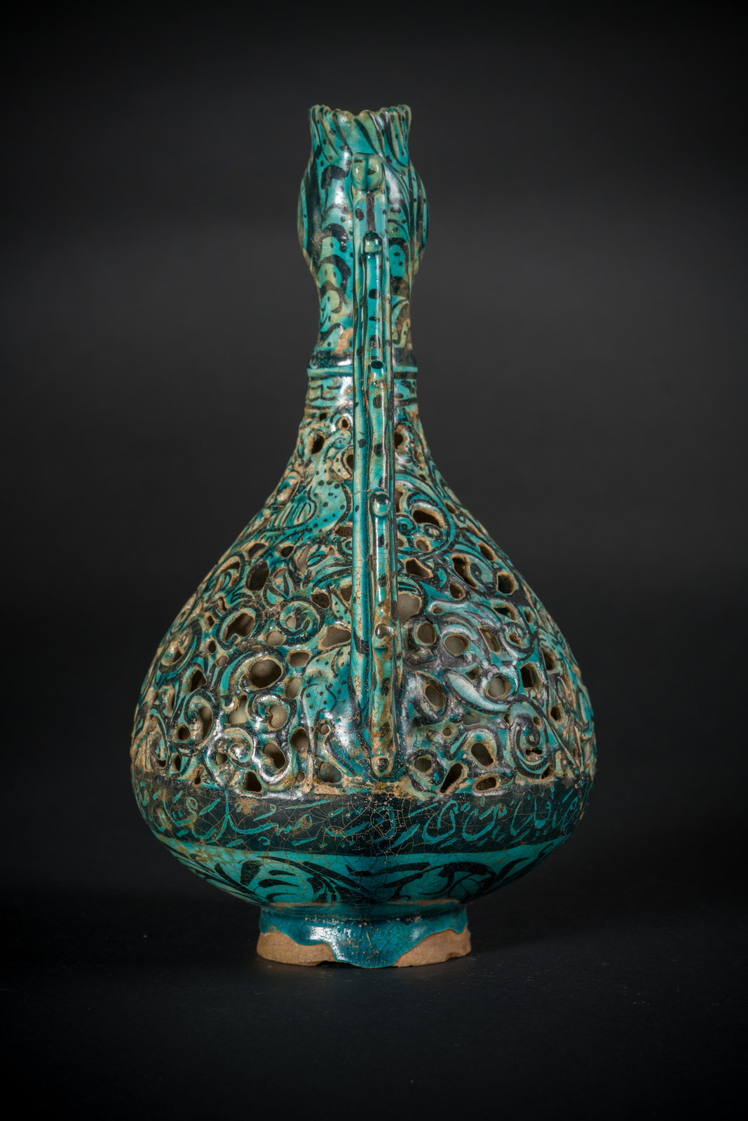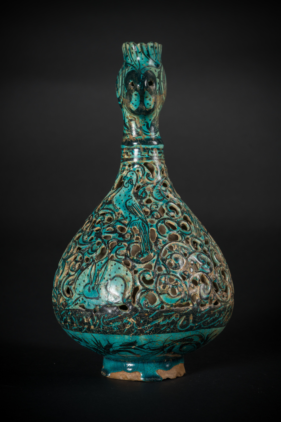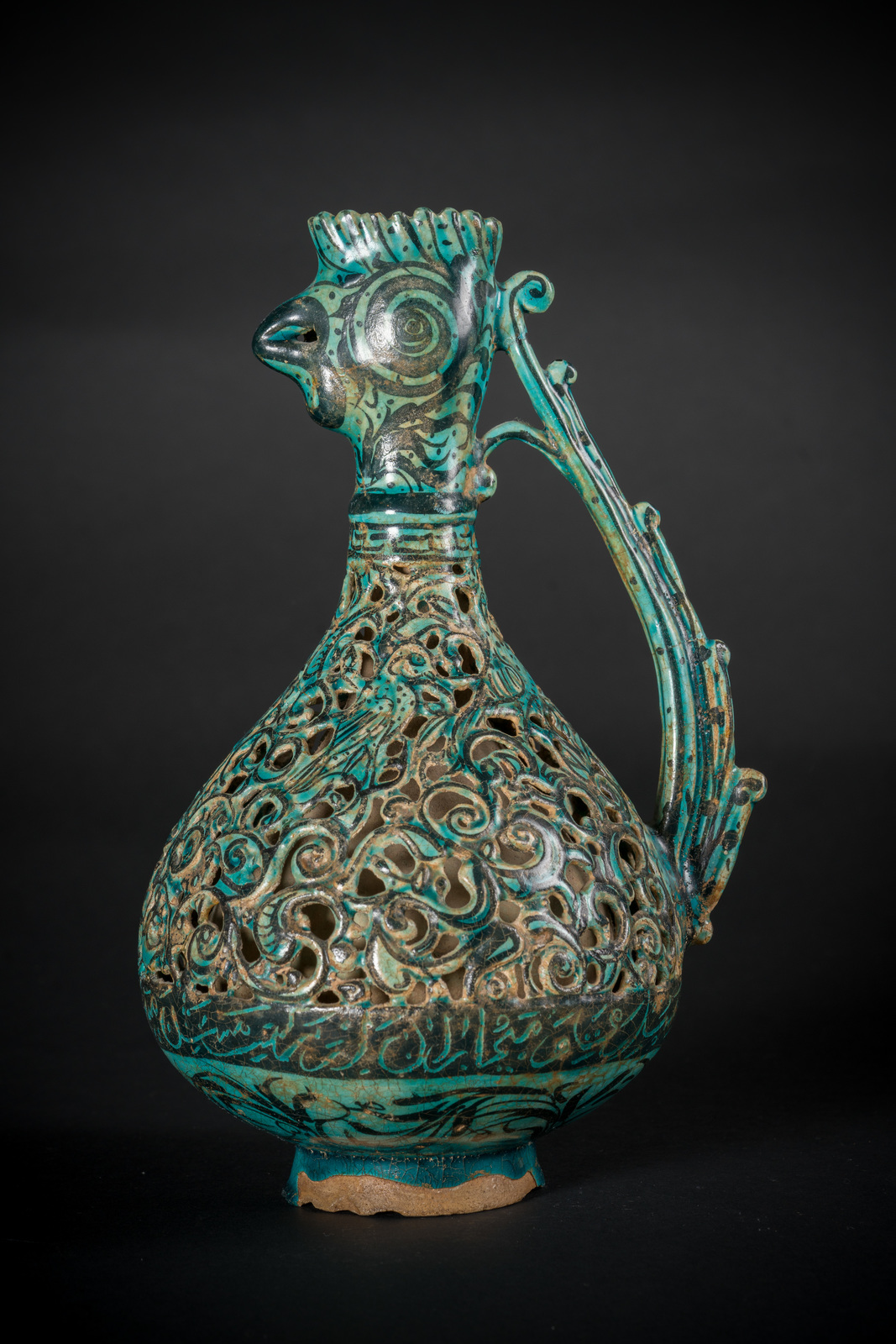 Iran, Kashan, inizio XIII secolo . . Cm 9,50 x 28,00. Oggetto composto nella tecnica del doppio guscio, ovvero con un contenitore interno atto a contenere i liquidi ed un guscio esterno traforato. Corpo piriforme in pasta silicea poggiante su disco, finale superiore in forma di testa di gallo e manico stampato con le piume della coda in rilievo.