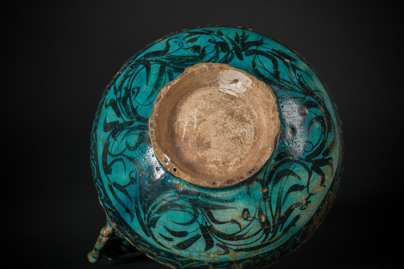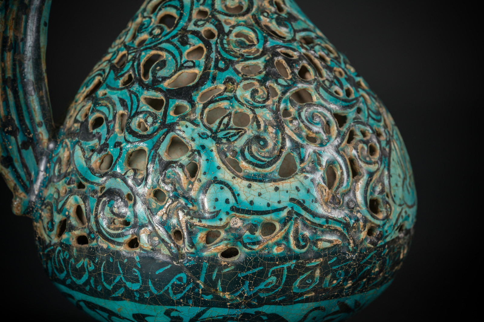 The body is characterized by a fine openwork, created through a coeval metal working technique. The decoration follows a pattern of vegetal motifs interspersed with animals painted in black. Calligraphic inscription on black enclosed by a reserve close to the lower margin of the item. The item is covered with the typical turquois glaze which leaves only the foot bare.