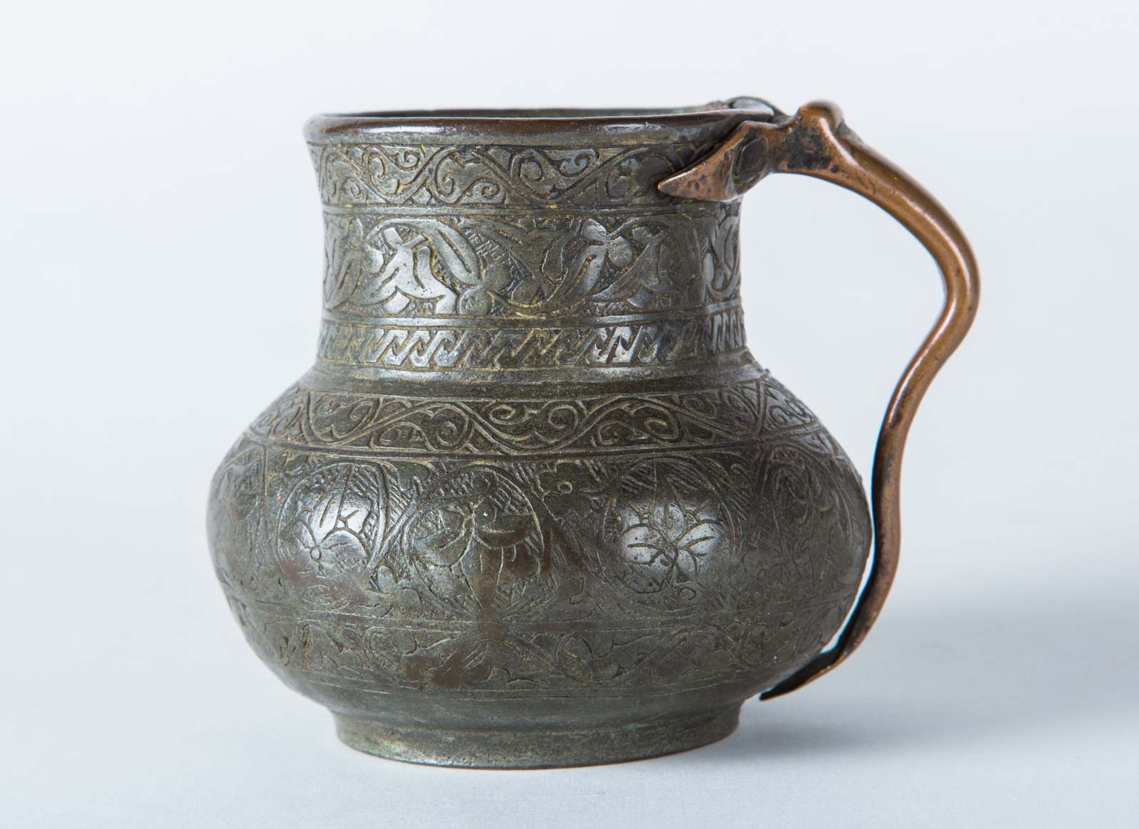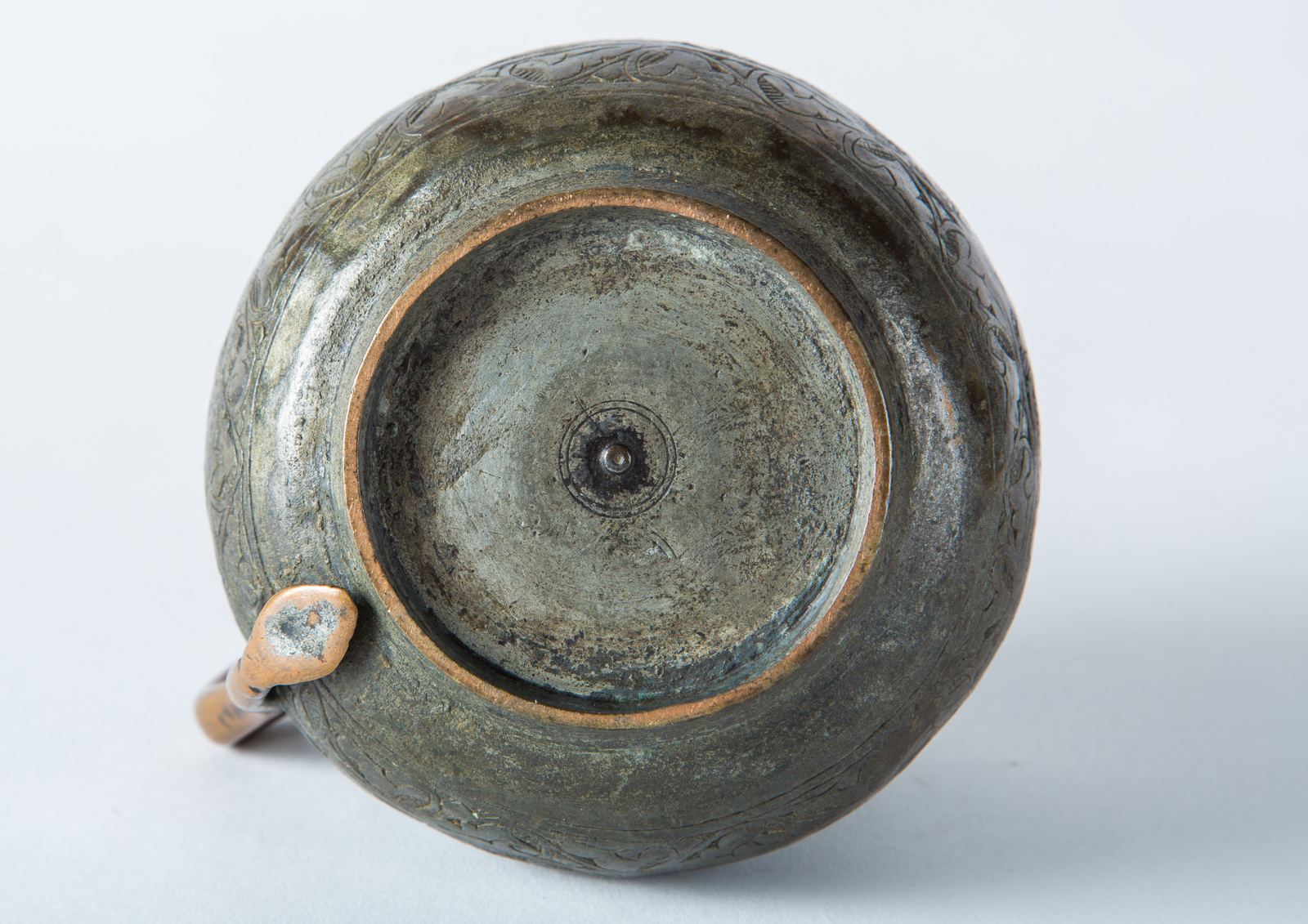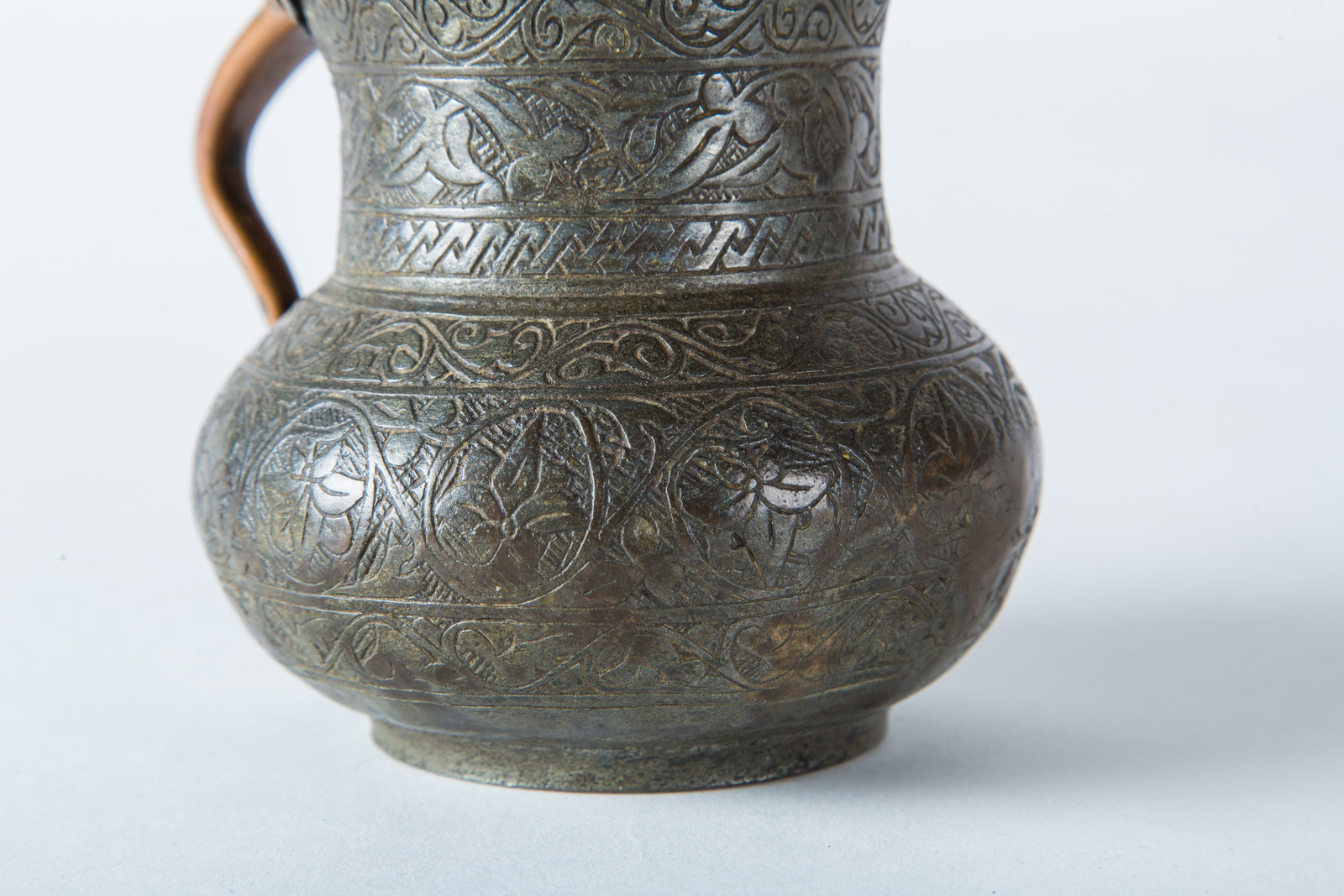Iran, seconda metà XV secolo . . Cm 10,50. poggiante su disco con corpo globulare e largo collo su cui si innesta un manico dalla sinuosa forma di dragone stilizzato. La superficie incisa con due ampie fasce contenenti motivi floreali intrecciati contenute entro bande più sottili decorate con elementi vegetali e geometrici stilizzati.