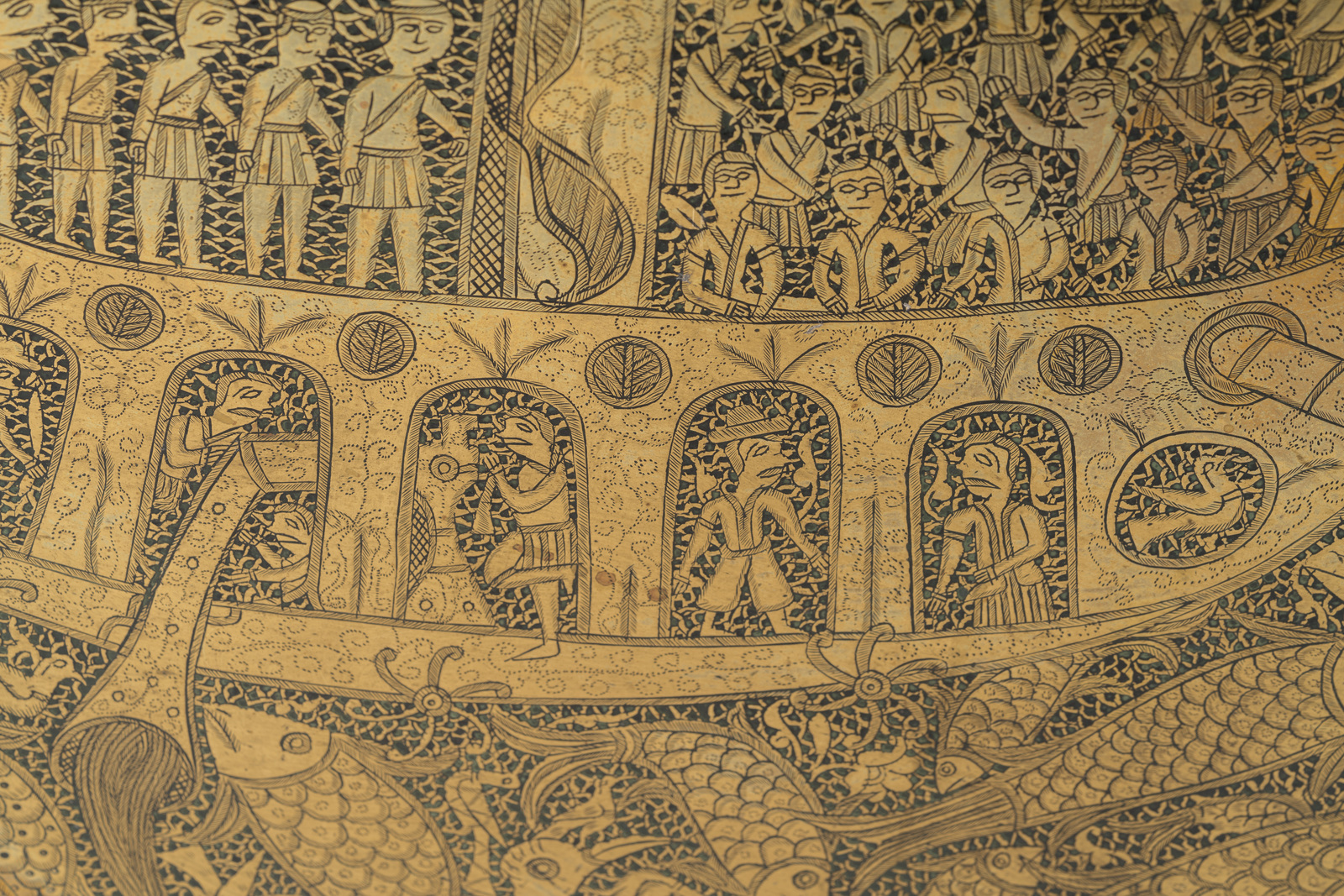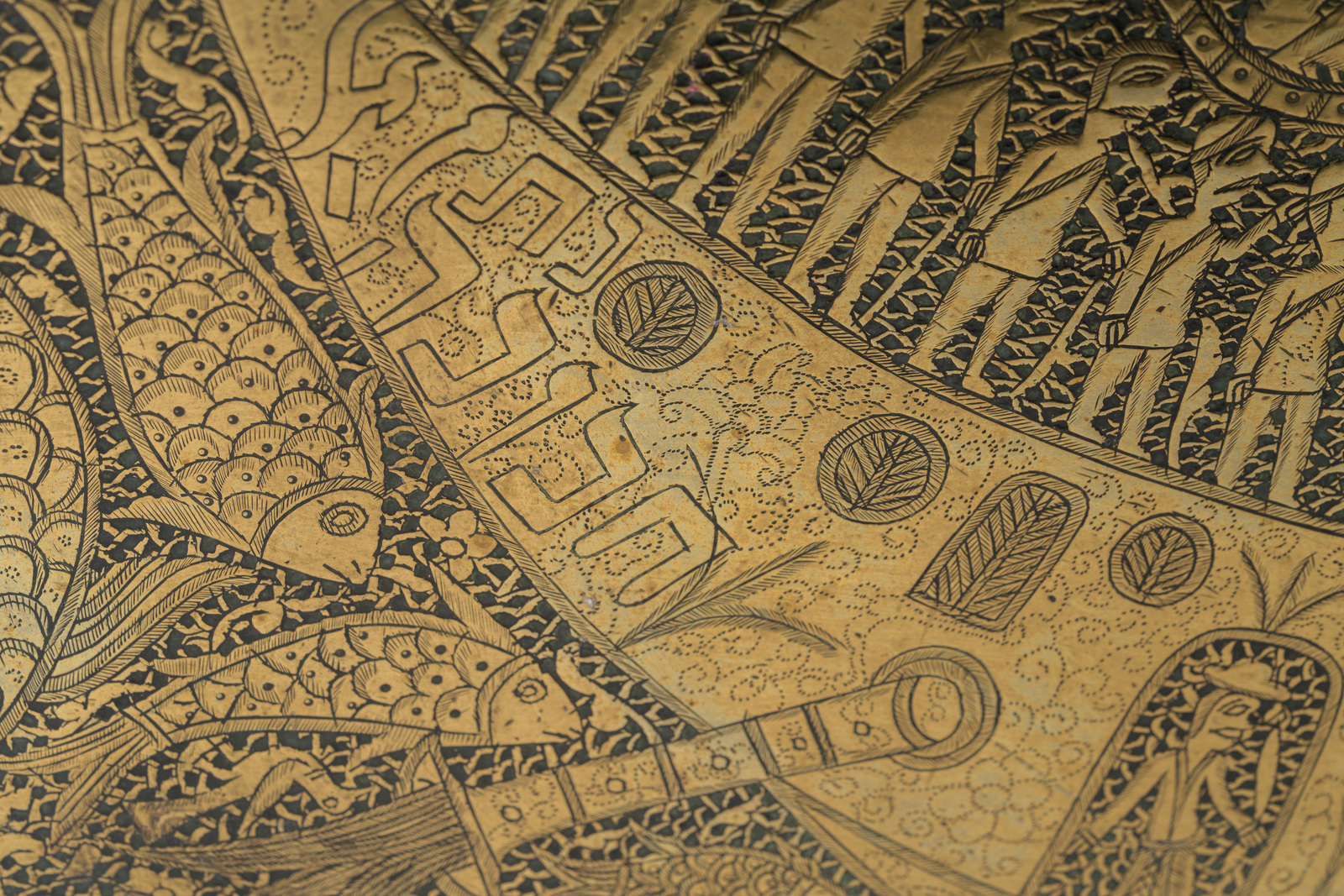 Arte Islamica Grande vassoio in ottone Vicino Oriente, XIX secolo . . Cm 80,50. a sezione circolare, l'affollata decorazione, incisa e niellata, si sviluppa con andamento narrativo e prevede mostri marini, personaggi su una barca, alberi, un grifone ed un'iscrizione in ebraico sulla parte sinistra dell'imbarcazione. Tesa decorata con motivi vegetali. Per un esemplare comparativo si veda quello pubblicato nel catalogo della mostra curato da Marthe Bernus-Taylor"L'étrange et le mervailleux en terres d'Islam" Paris, Musée du Louvre, 23 aprile-23 luglio 2001, oggetto n.181