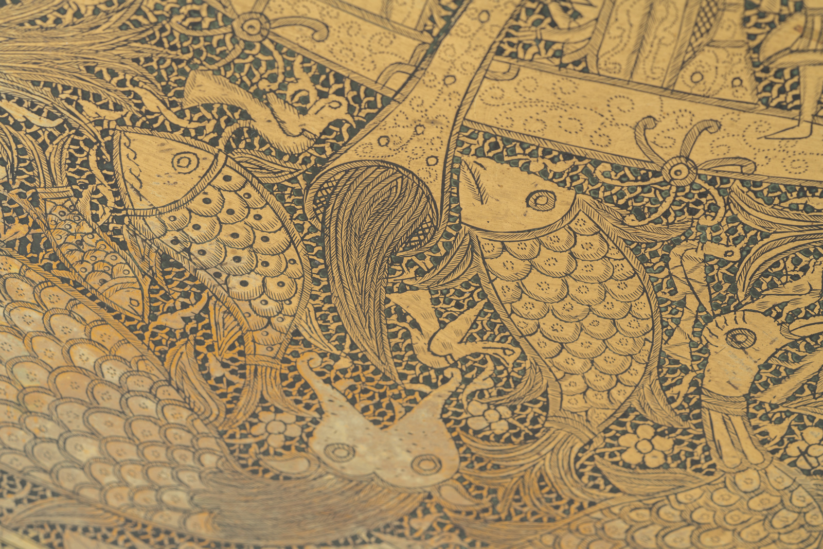 Islamic Art A large brass nielloed tray Near East, 19th century . . Cm 80,50. A highly decorative round tray, narratively decorated with sea monsters, people on a boat, trees and phoenix and a Hebrew inscription on the left side of the boat. Floral decorated edge. For a closely related example see the pne published in the catalogue of the exhibition "L'étrange et le mervailleux en terres d'Islam" edited by Marthe Bernus-Taylor, Paris, Musée du Louvre, 23 April-23 July 2001, plate n.181