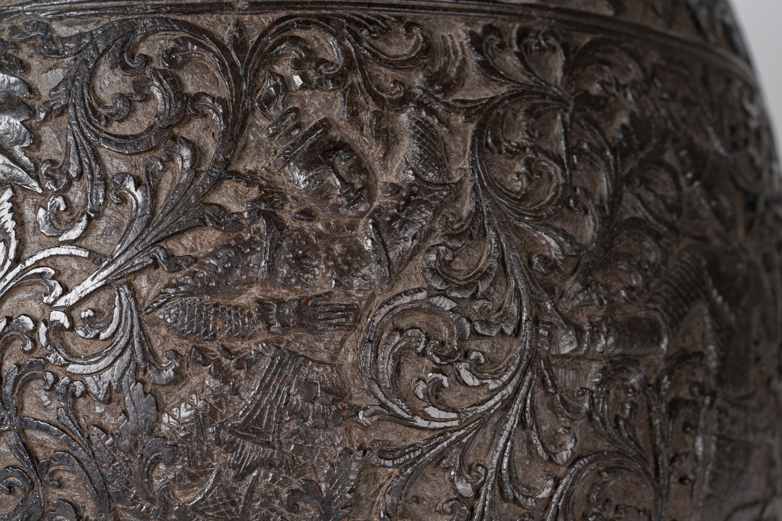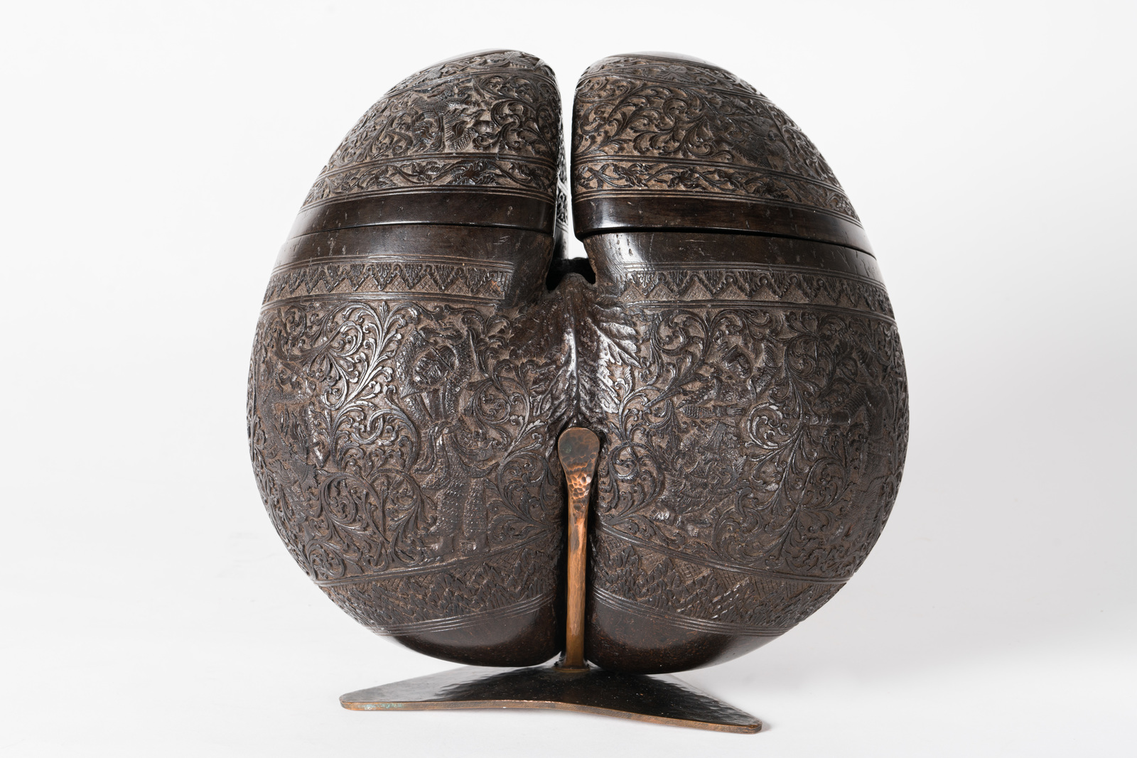 Arte Islamica Raffinato kashkul coco de mer intagliato Indonesia, XIX secolo . . Cm 28,80 x 27,00. finemente intagliato con volute floreali e personaggi nella resa scultorea tipica indonesiana.