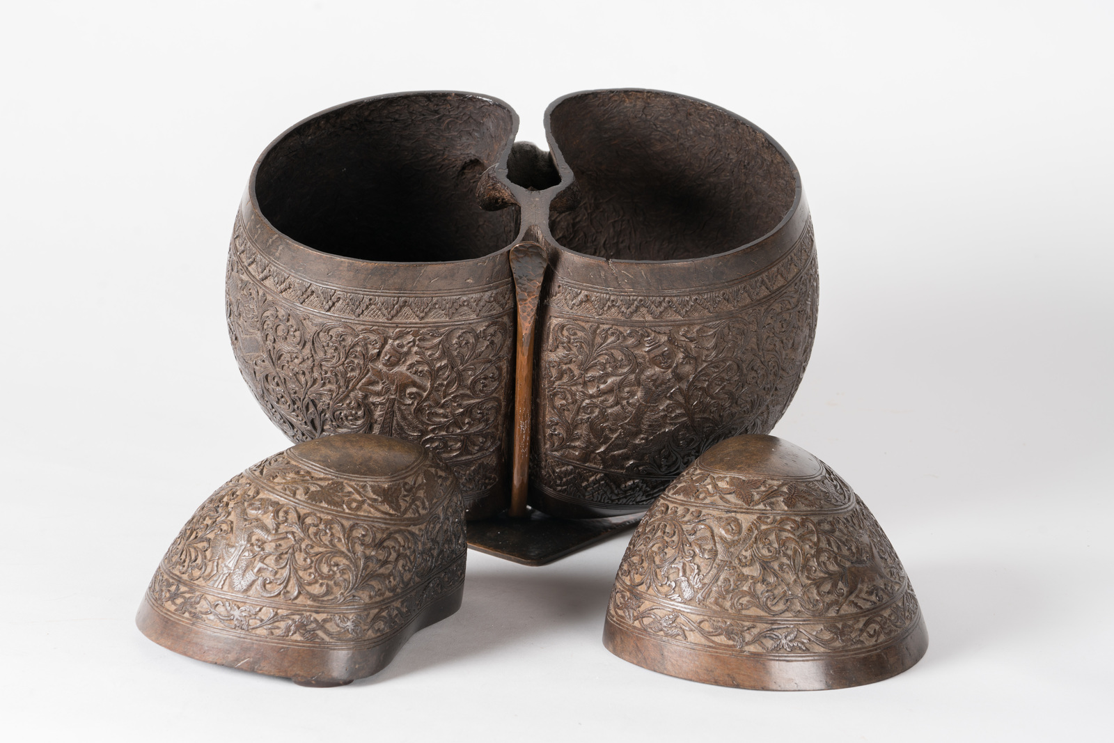 Islamic Art An extremely fine carved Coco de mer kashkul Indonesia, 19th century . . Cm 28,80 x 27,00.