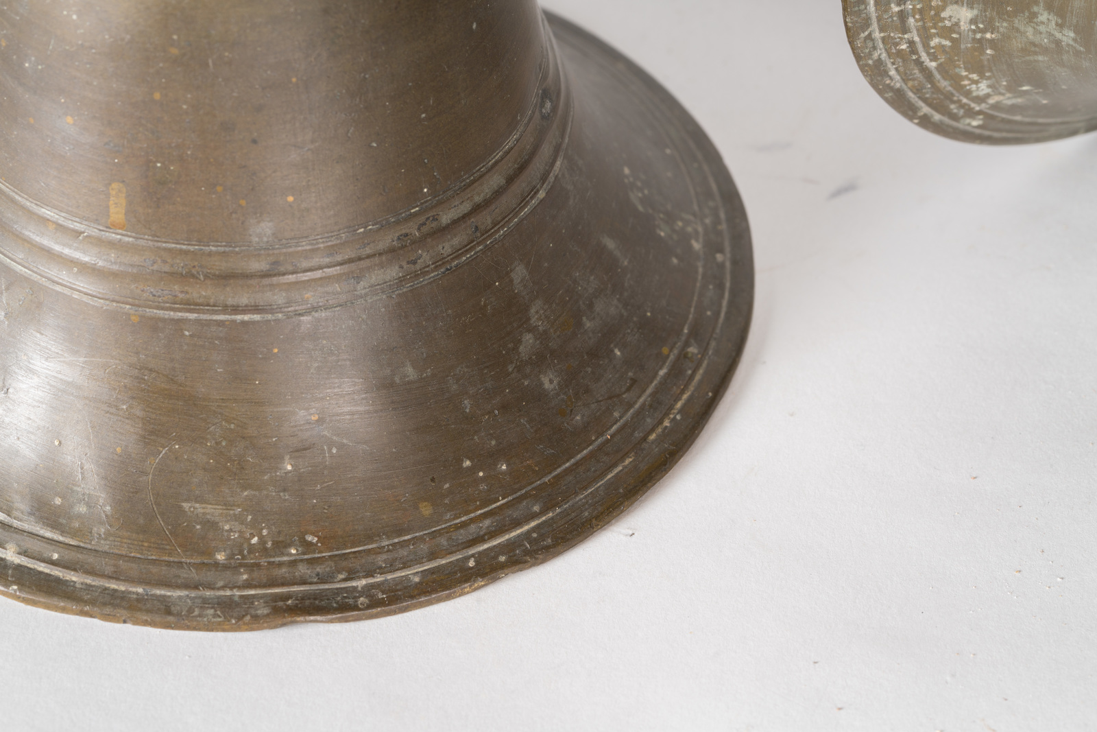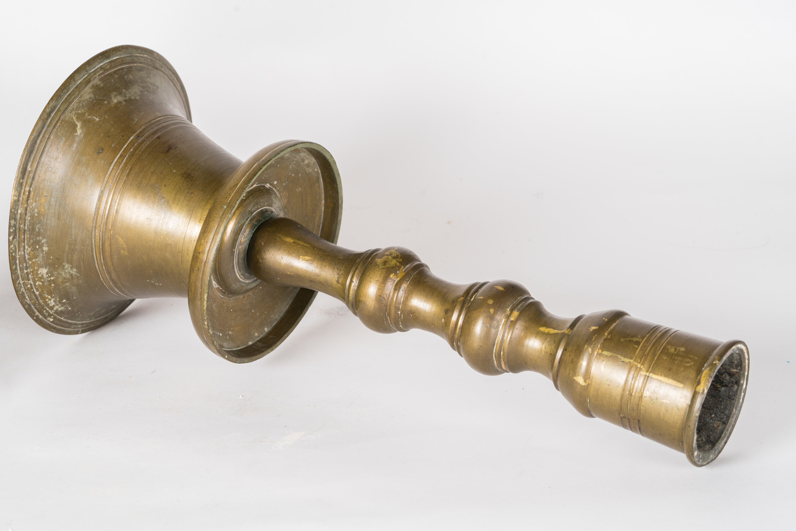 Turchia ottomana, XVIII secolo . . Cm 17,00 x 43,50. fusione in ottone con base a campana decorata con righe parallele, vassoio raccogli goccia con bordi rialzati ed alto stelo con due nodi sormontato da reggi-candela cilindrico.