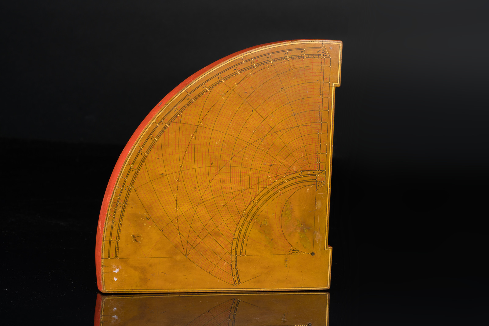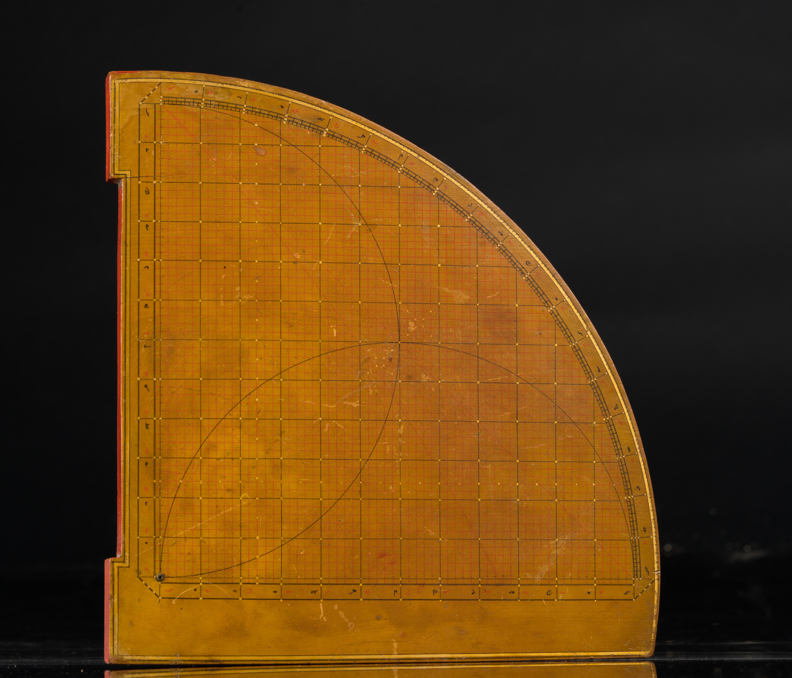 Turchia, datato 1253 H (1837). . Cm 18,70 x 20,00. Quadrante a spicchio, mostra segni, simboli, quadrettatura, diagrammi e parole iscritte in rosso e nero, profili dorati e margini laccati in rosso.