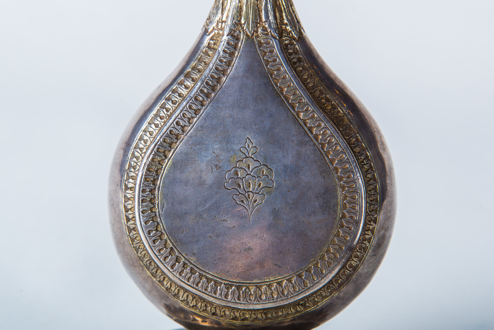 India, dinastia Moghul, XVIII secolo . . Cm 9,00 x 30,00. poggiante su base a forma di fiore rovesciato, il corpo a goccia ed il lungo collo rastremato terminante con aspersorio sagomato ad elemento floreale. Foglie d'acanto decorano la zona di raccordo tra il collo ed contenitore, le cui due pareti sono ulteriormente decorate con un fiore centrale inciso e dorato.
