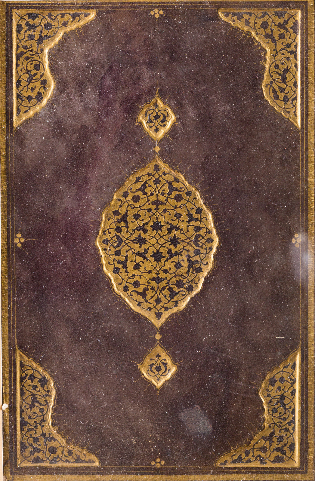 Persia Safavide, XVII secolo . . Cm 16,00 x 25,50. in pelle stampata con medaglione floreale dorato in posizione centrale. Cornice presente