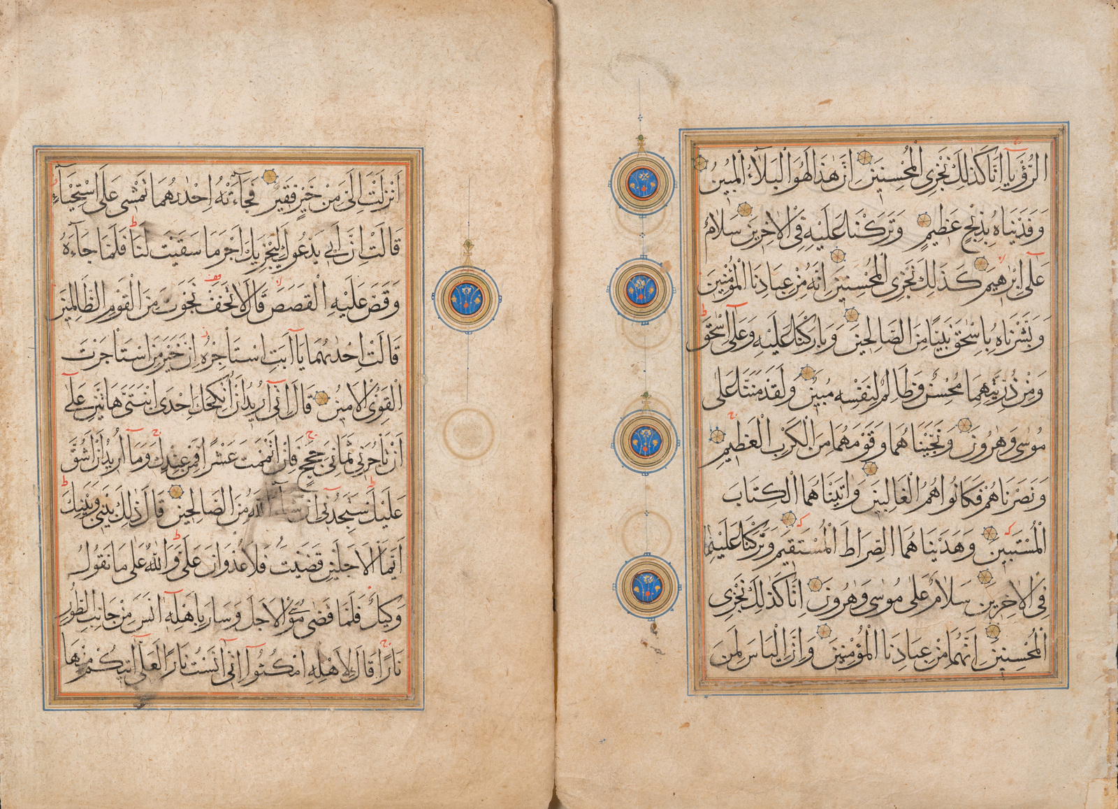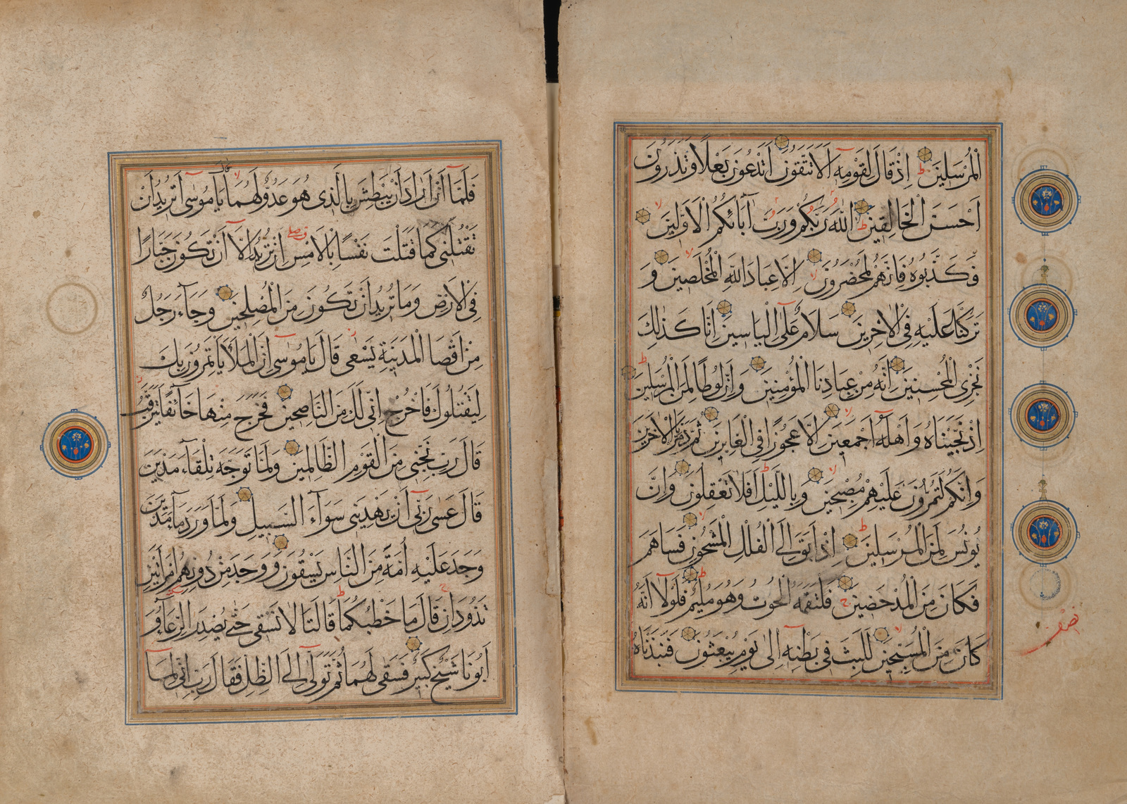 Safavid Iran, 16th century. . Cm 23,00 x 33,00. Arabic text on paper, 10 lines to the page written in naskh script with black ink, vocalized in red and gilded rosettes as text marks. Round floral cartouches in the margins.