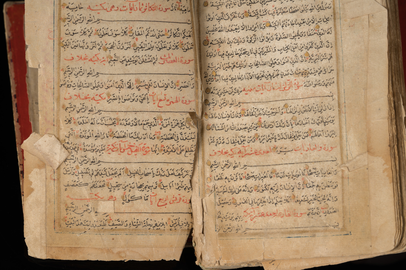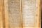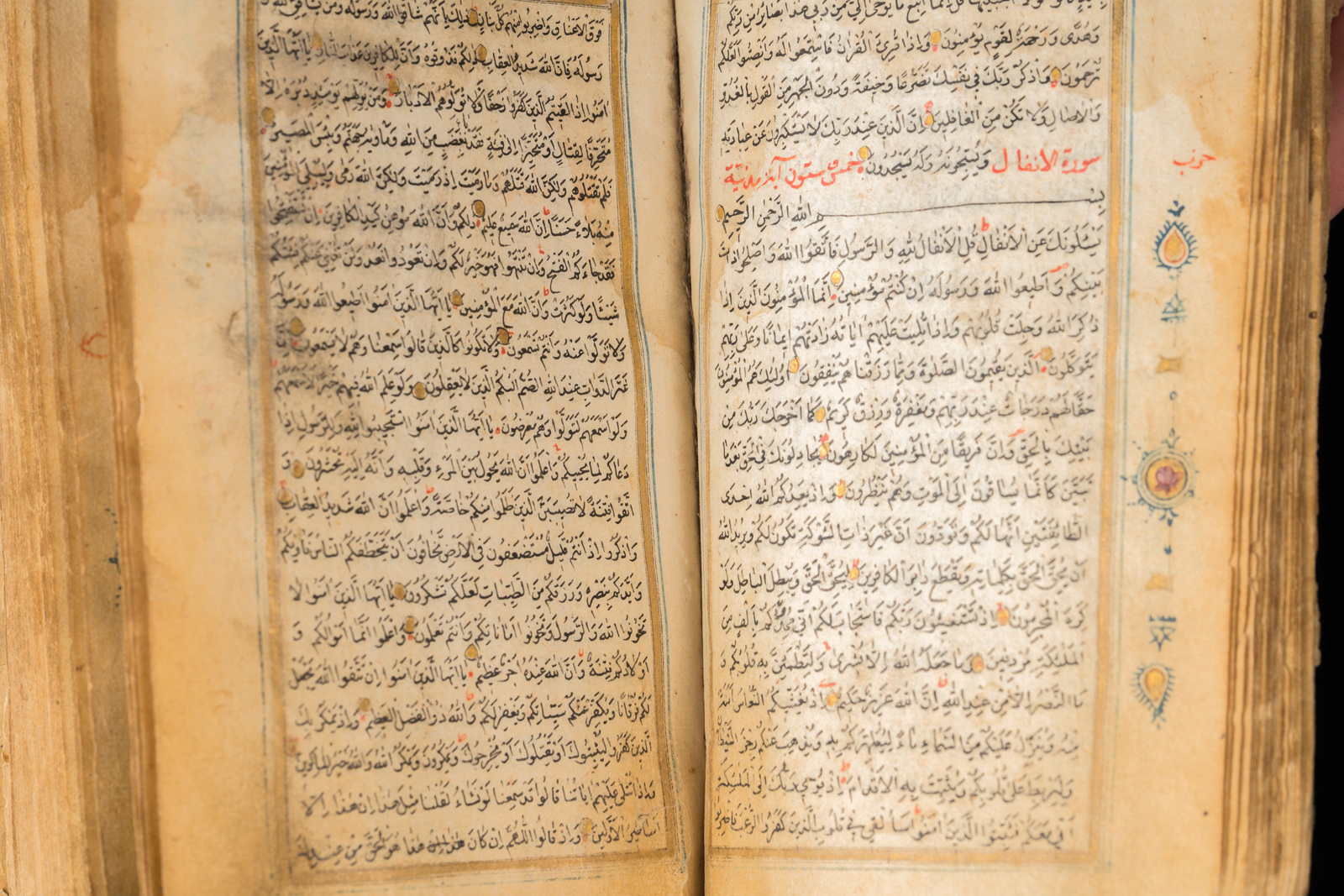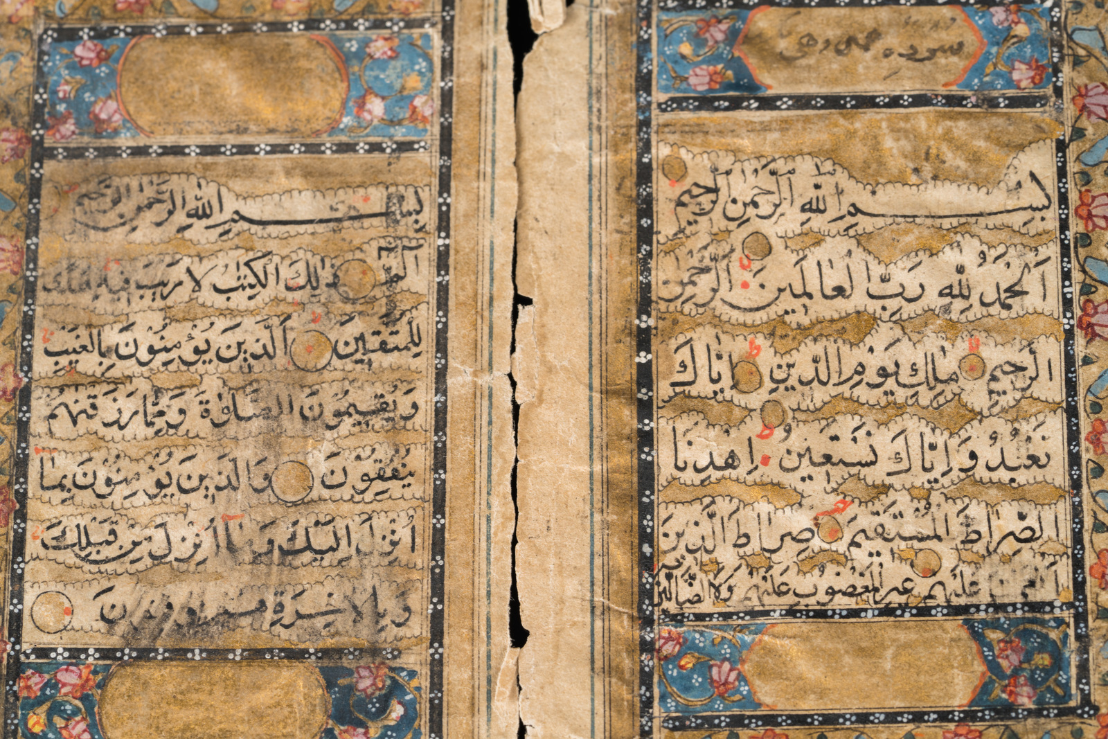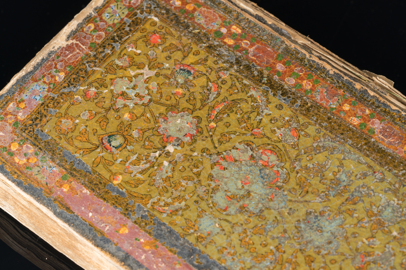 Persia, XIX secolo . -. Cm 10,00 x 15,50. Manoscritto in arabo su carta composto da 153 carte. Specchio di scrittura 112 X 57 mm delimitato da filetto dorato e blu. Testo in grafia naskh scritto in inchiostro nero con qualche lettera in rosso, arrangiato su colonna singola composta da 21 righe. Fine doppio frontespizio (unwan) con margini miniati con arabeschi colorati su sfondo blu o dentro cuspidi su sfondo dorato, testo con interlinea dorata. Marcatori testuali in forma di piccoli cerchi e marcatori di sezione dipinti con elementi floreali blu e dorati pendenti. Rilegatura scomposta in cartone pressato e laccato, l'esterno finemente dipinto con arabeschi e tralci floreali dorati su fondo verde entro cornice vegetale, l'interno dipinto con fiore su sfondo rosso.