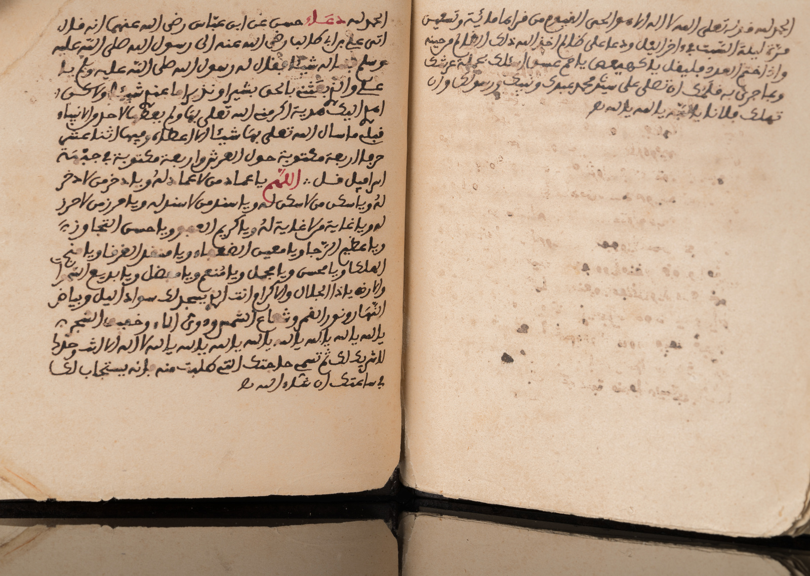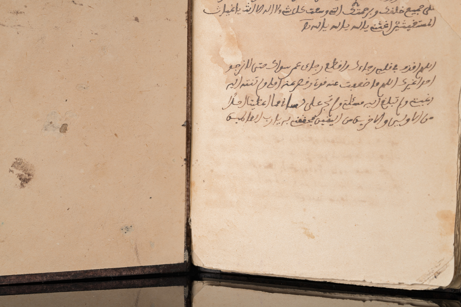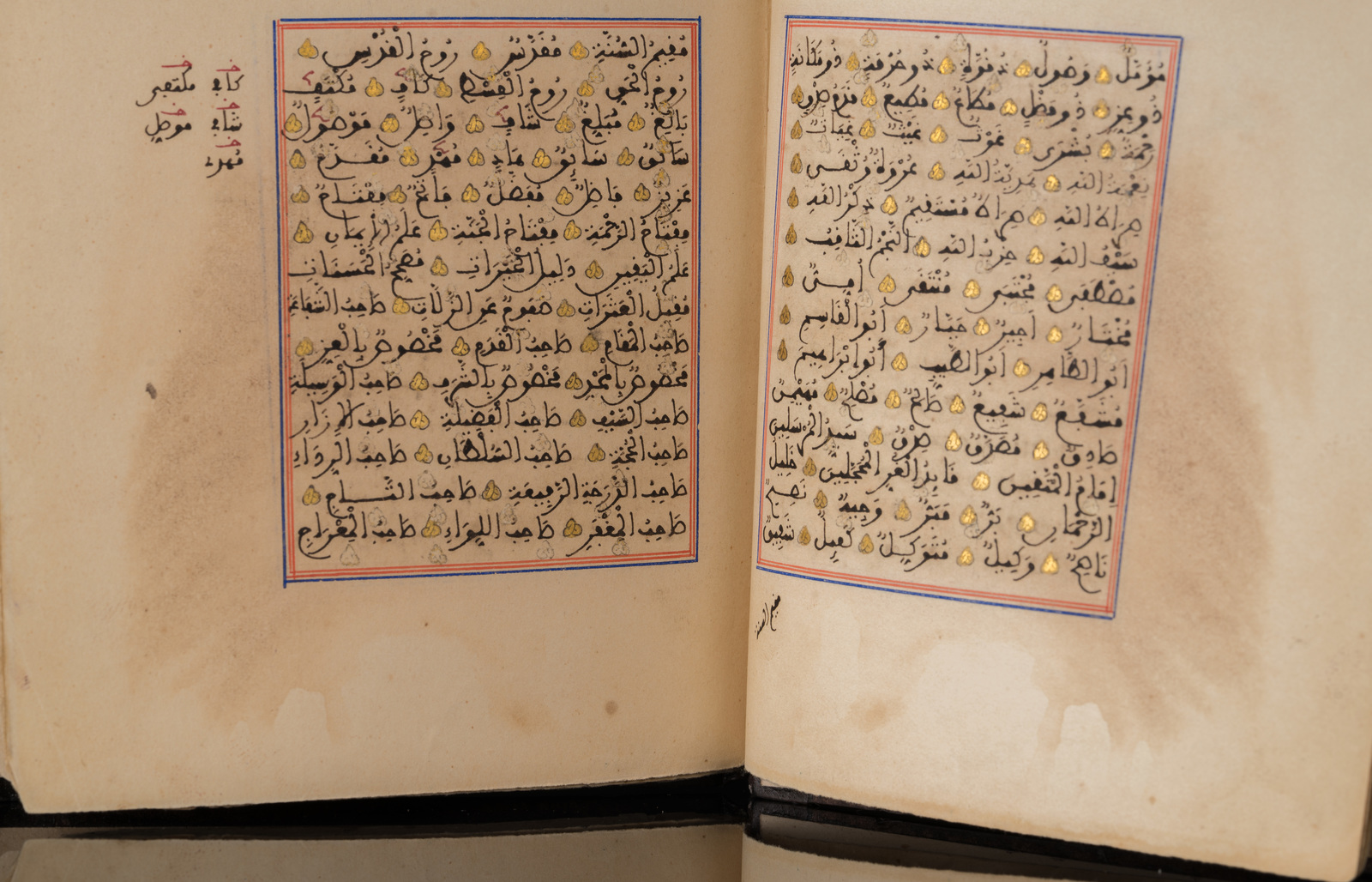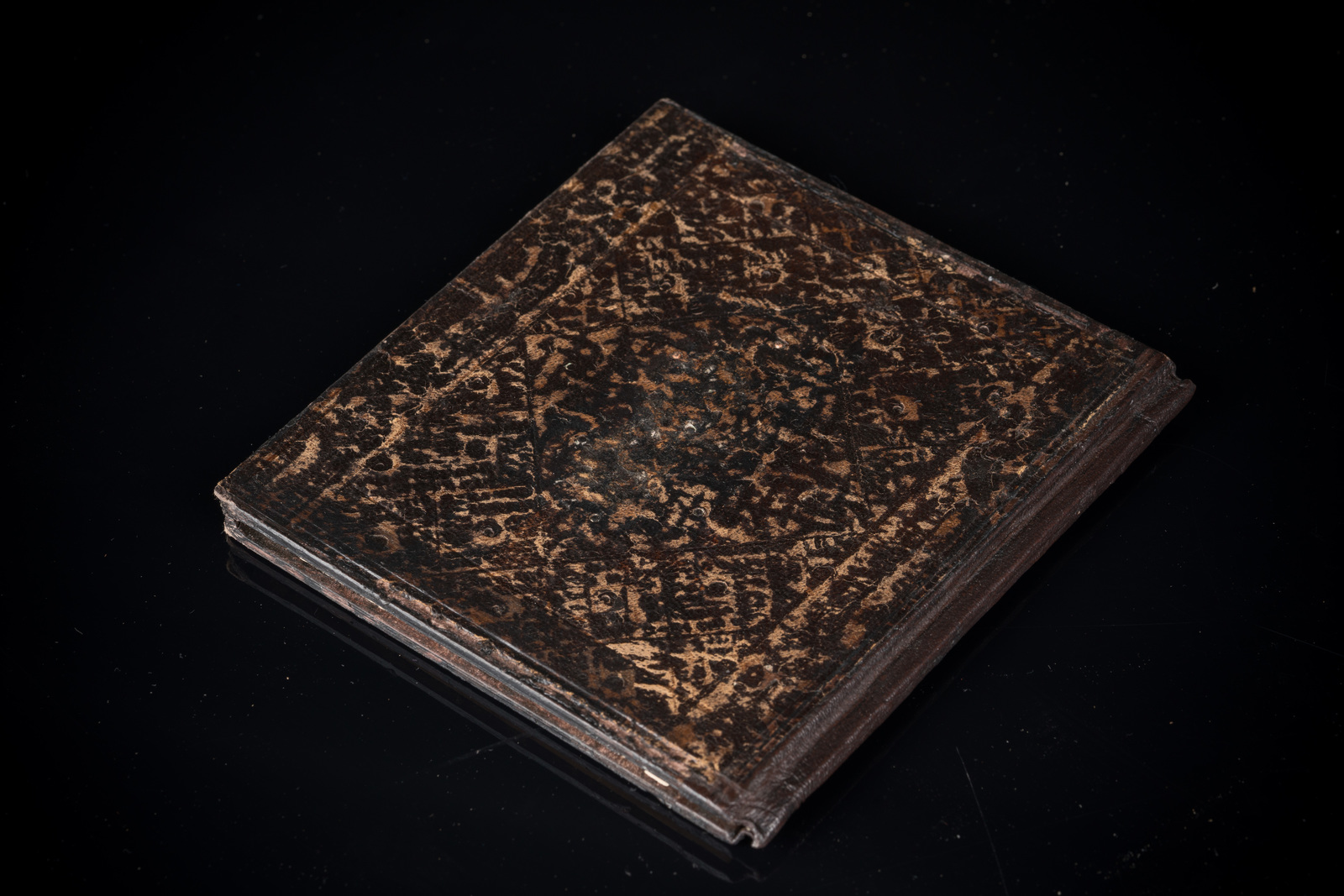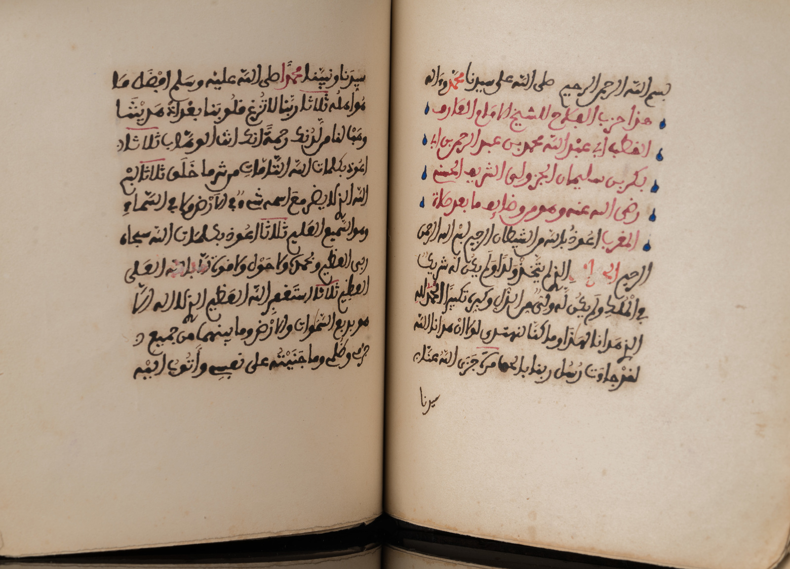 Marocco, XIX secolo . -. Cm 11,70 x 12,20. Manoscritto in arabo su carta composto da 23 carte. Frontespizio finemente illuminato con iscrizioni ed arabeschi dorati su fondo blu, rosso e verde. La maggior parte del testo è scritto in Maghrbi, su colonna singola di 14 righe entro specchio di scrittura 77 X 61 mm, delimitato da triplo filetto rosso e blu. Sono presenti note a margine, lettere e parole in inchiostro dorato, verde, e rosso. Dalla pagina nove inizia un altro testo con diversa calligrafia, 10 righe per pagina, scritte in inchiostro bianco e rosso.