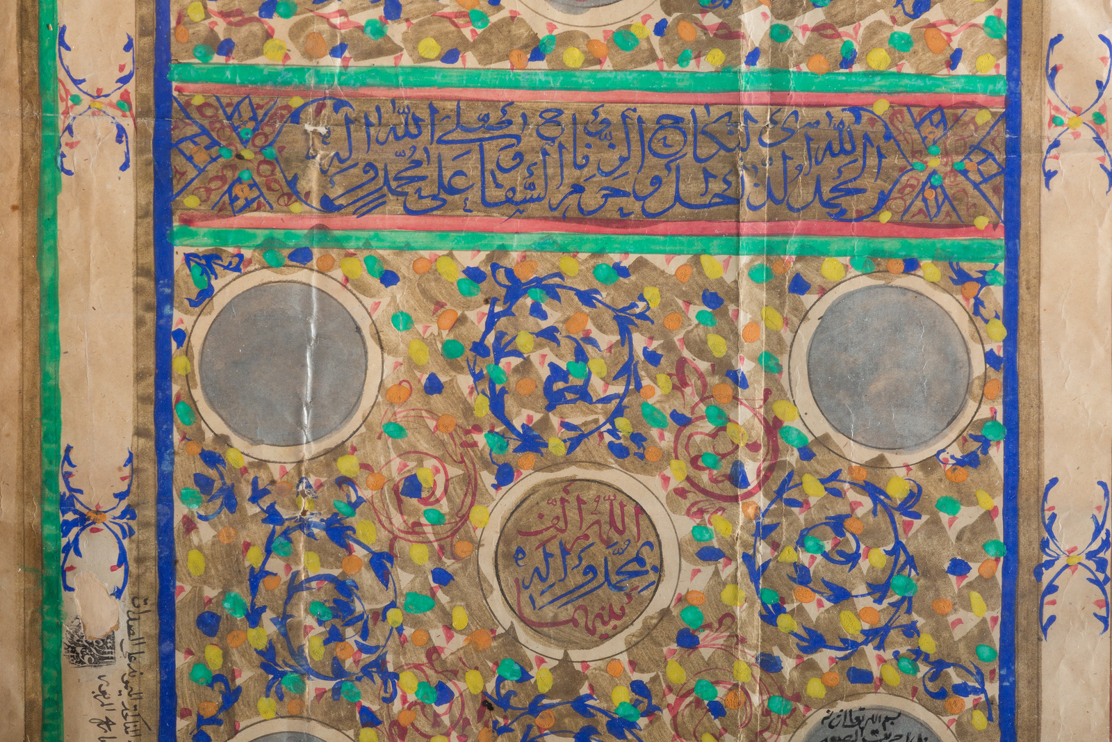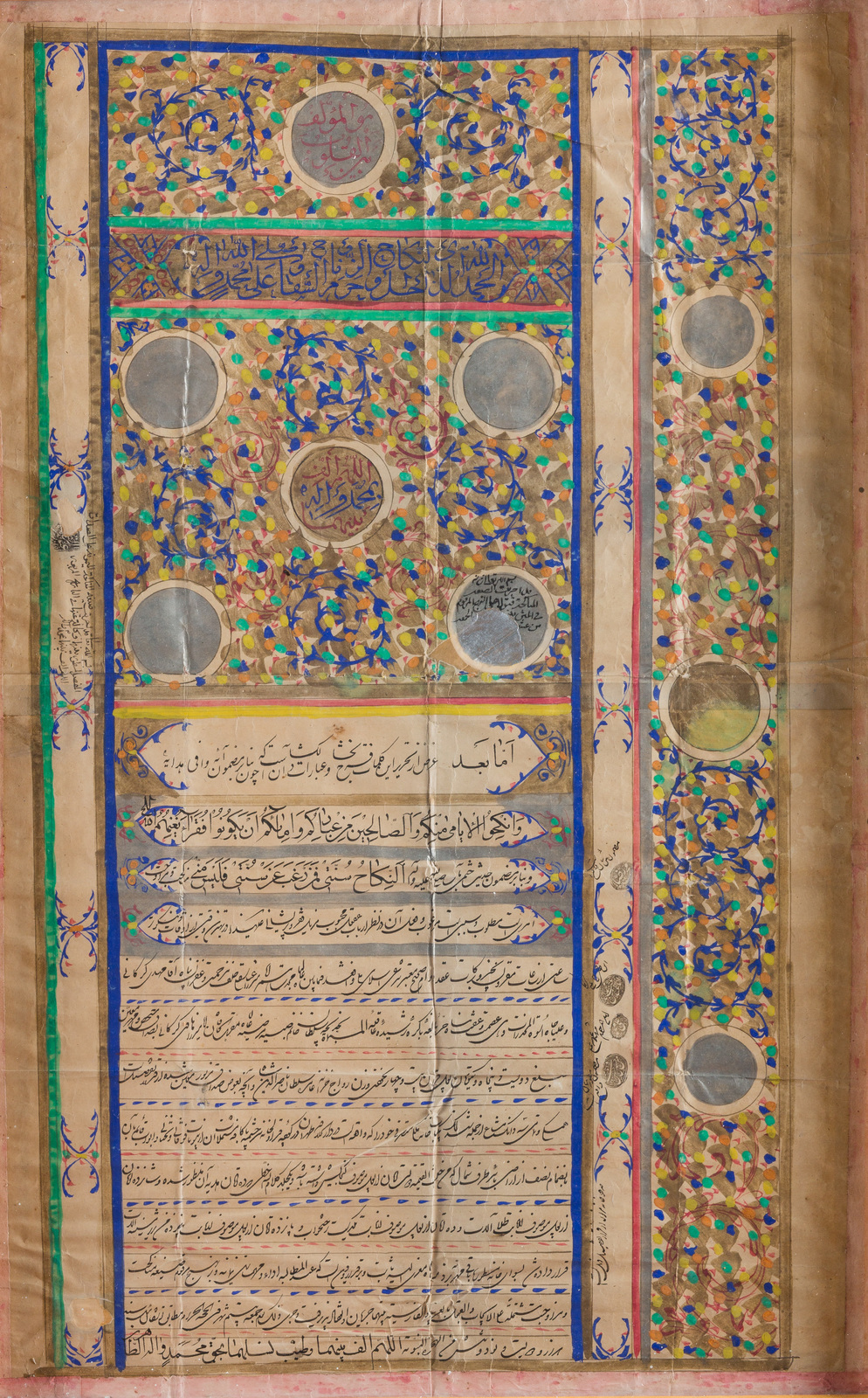Iran, datato 1296 H (1879). -. Cm 43,50 x 69,00. Testo persiano su carta, composto da 13 righe, scritte in nastaliq con inchiostro nero, separate da segni rossi e blu. La carta è decorata con spirali vegetali blu su sfondo dorato ravvivato da piccoli tocchi colorati ed elementi circolari dorati o argentati, due dei quali contenenti iscrizioni. Titolo in ampi caratteri in inchiostro blu entro cartiglio e note a margine.
