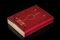 Copertina con aletta in pelle rossa stampata con medaglione lobato centrale decorato con palmette e profili dorati.