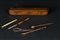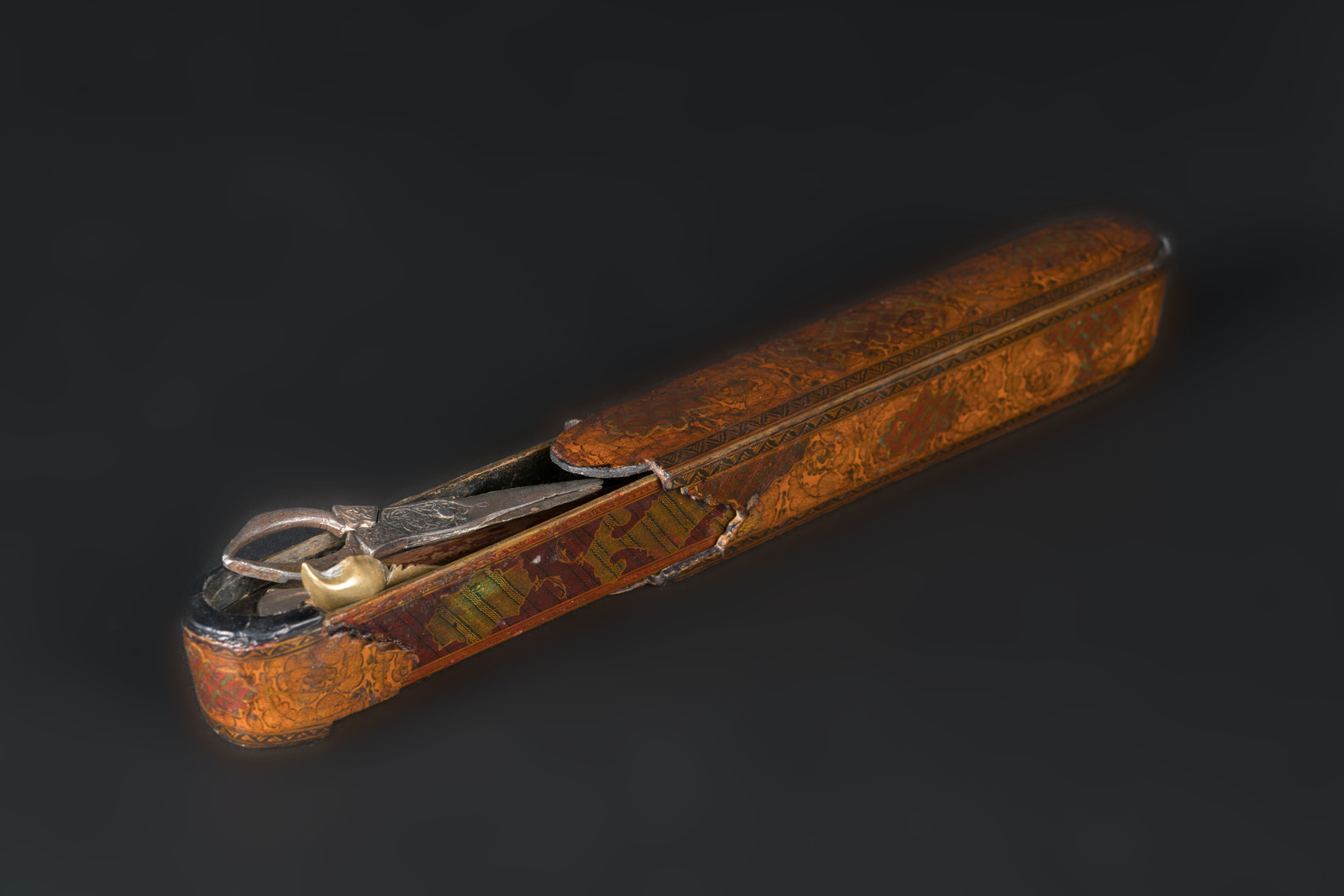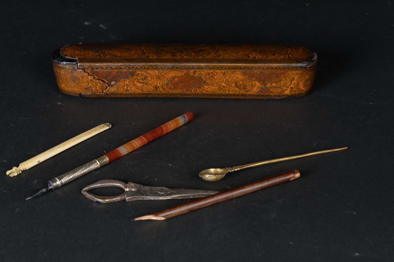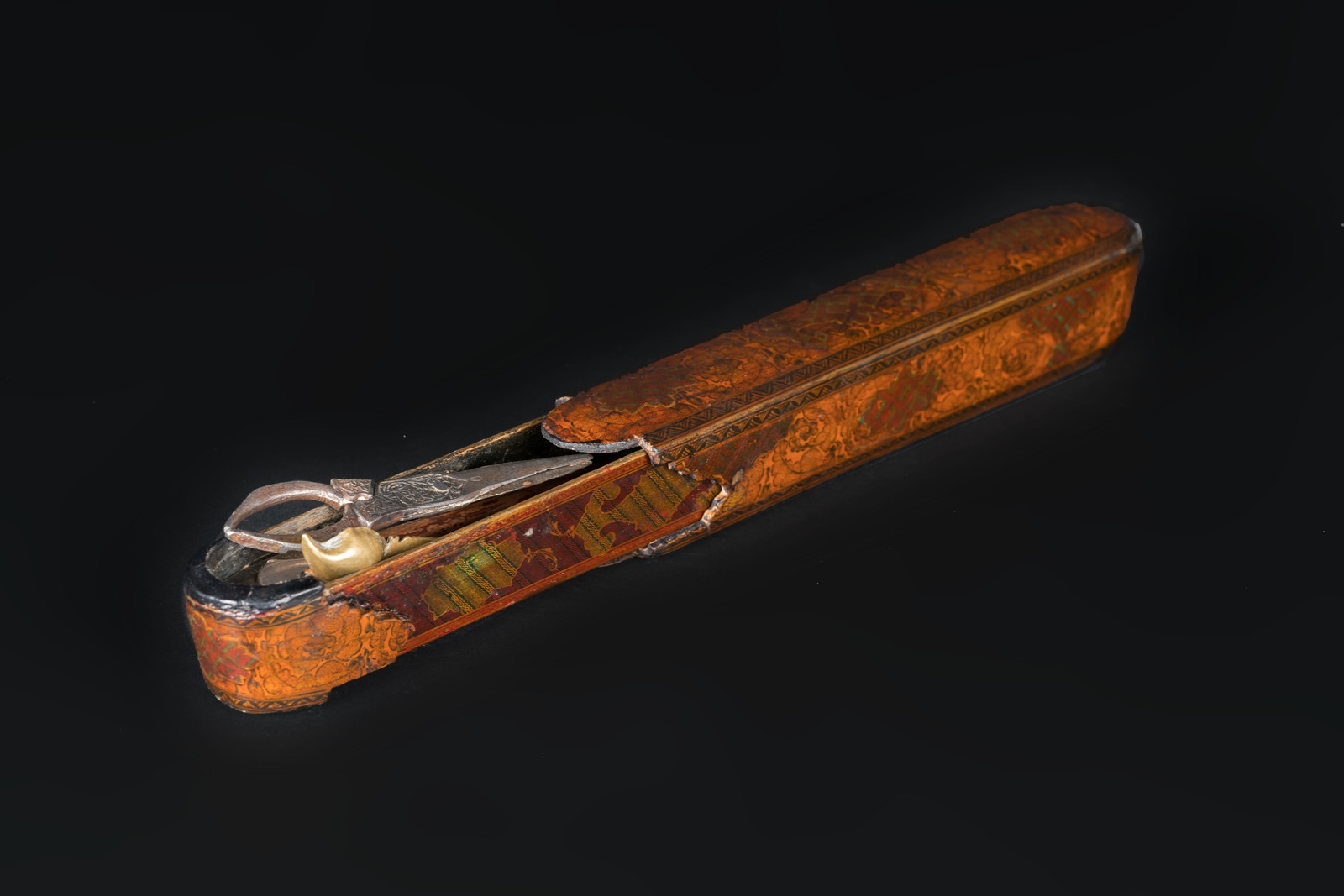 Islamic Art A papier maché lacquer pen case (qalamdan) with calligrapher tools