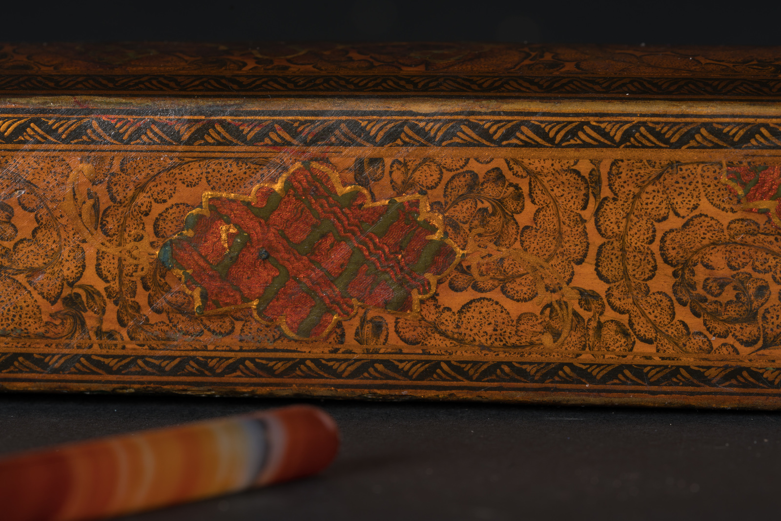 Iran, school of Abu Talib Al Mudarris, 19th century . . Cm 4,50 x 21,00. With curved sides and sliding tray, painted with cusped cartouches on a vegetal decorated ground. The exterior decorated with similar cartouches on a red ground.
