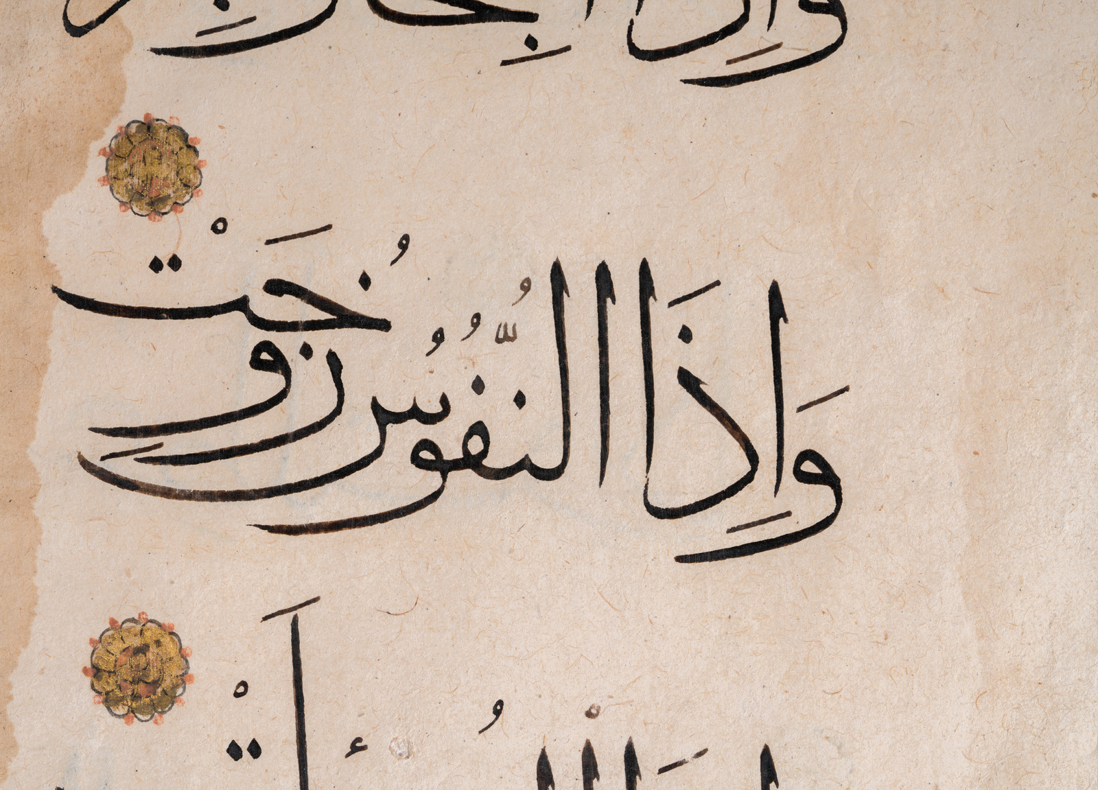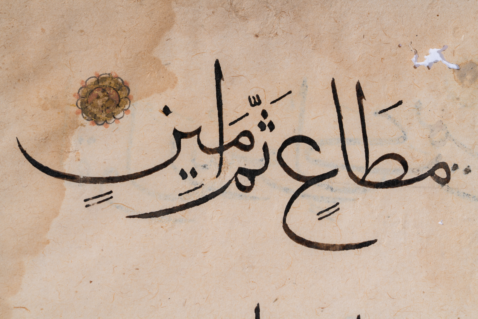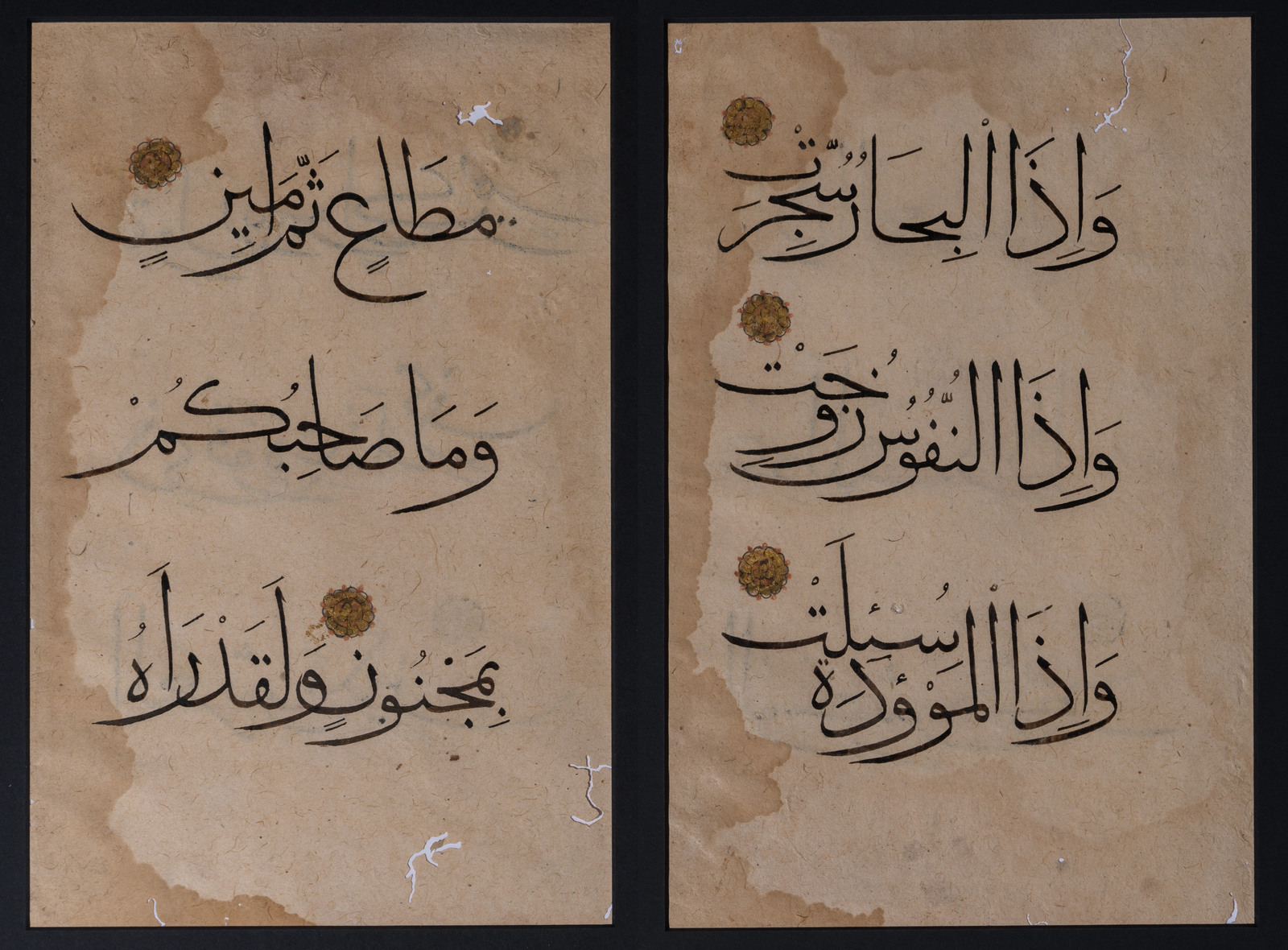 Domini Mamelucchi, XIV secolo . -. Cm 17,00 x 25,70. Due fogli tratti dallo stesso manoscritto, ma non consecutivi. Arabo su carta, tre linee scritte in thuluth in inchiostro nero sul fronte e tre sul retro. Rosette dorate.