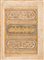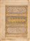 Domini mamelucchi, XV secolo . . Cm 27,50 x 36,50. Recto e verso, testo in arabo su carta, titoli in cufico nel cartiglio centrale con sfondo dorato e decorato con motivi vegetali; gli altri cartigli dipinti con spirali floreali. Il testo si riferisce alla Sura n. 3.