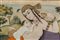 Pigmenti naturali e oro su carta . -. Cm 21,00 x 31,50. Raffinato dipinto raffigurante una donna a petto scoperto, adagiata sul terreno, appoggiata ad un cuscino e con un bambino in grembo. La donna ha coperto le gambe con un drappo arancione e mostra una bottiglia di vino nella sua mano destra ed una coppetta per berlo nella sinistra. Intorno ai due protagonisti alberi, prati e colline di evidente stampo europeo.