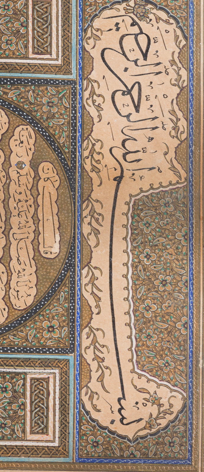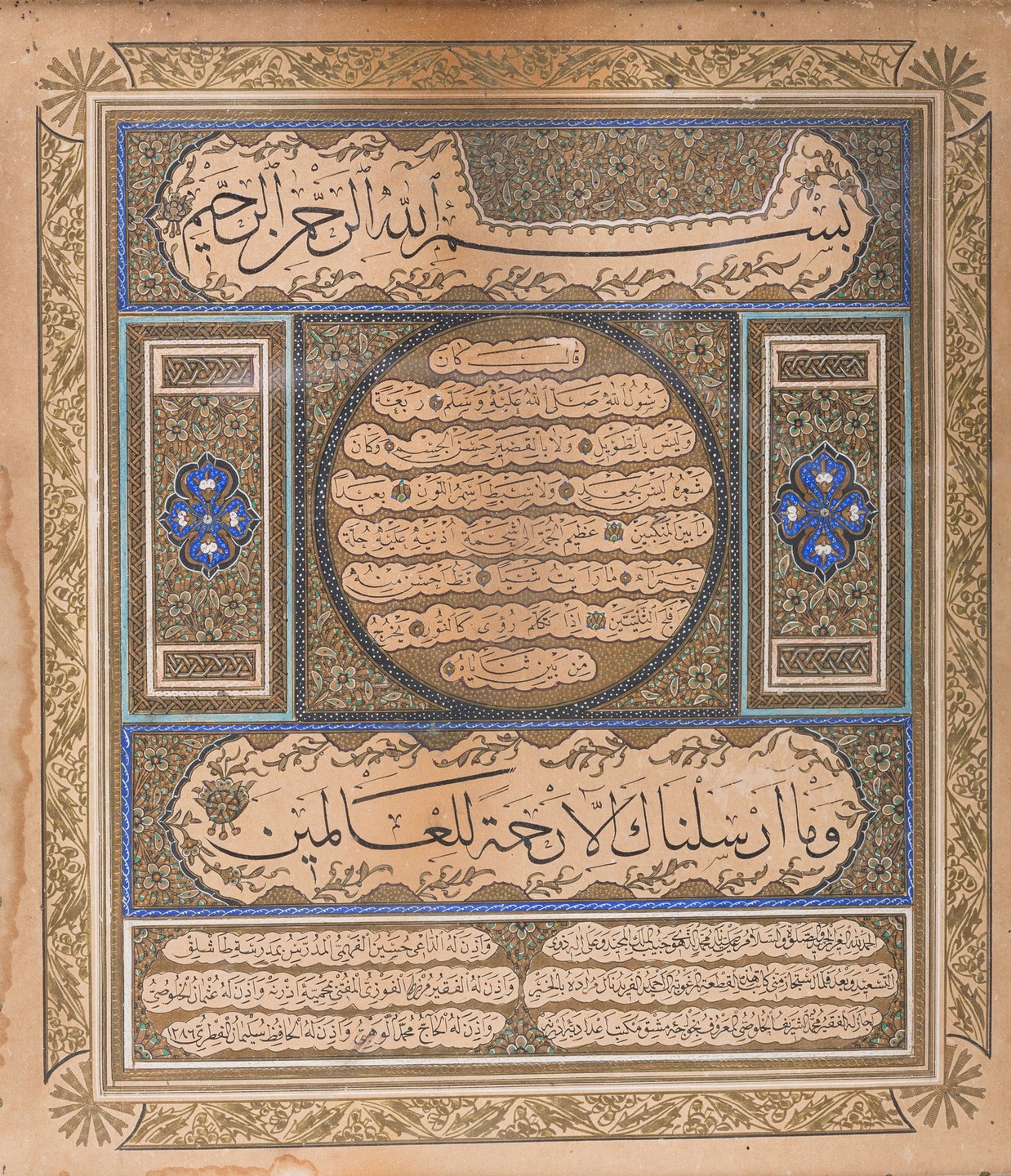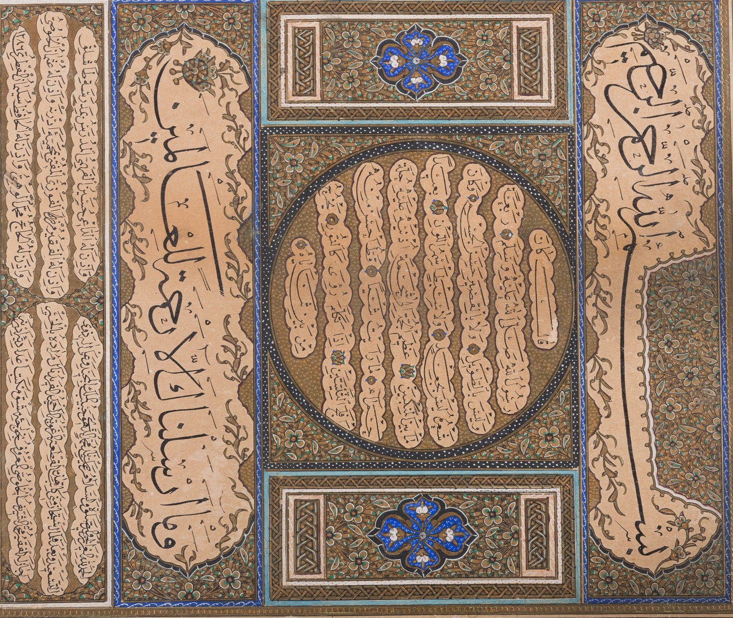 Turchia ottomana, datata 1286 H (1869). . Cm 27,00 x 30,50. Testo in arabo su carta su sfondo dorato dipinto con piccoli fiori intrecciati e due pannelli verticali che affiancano un tondo centrale riportante 8 righe entro cartigli lobati con rosette dorate come marcatori testuali. Titoli in thuluth e sei righe di testo sottostante in naskh arrangiate su due colonne.
