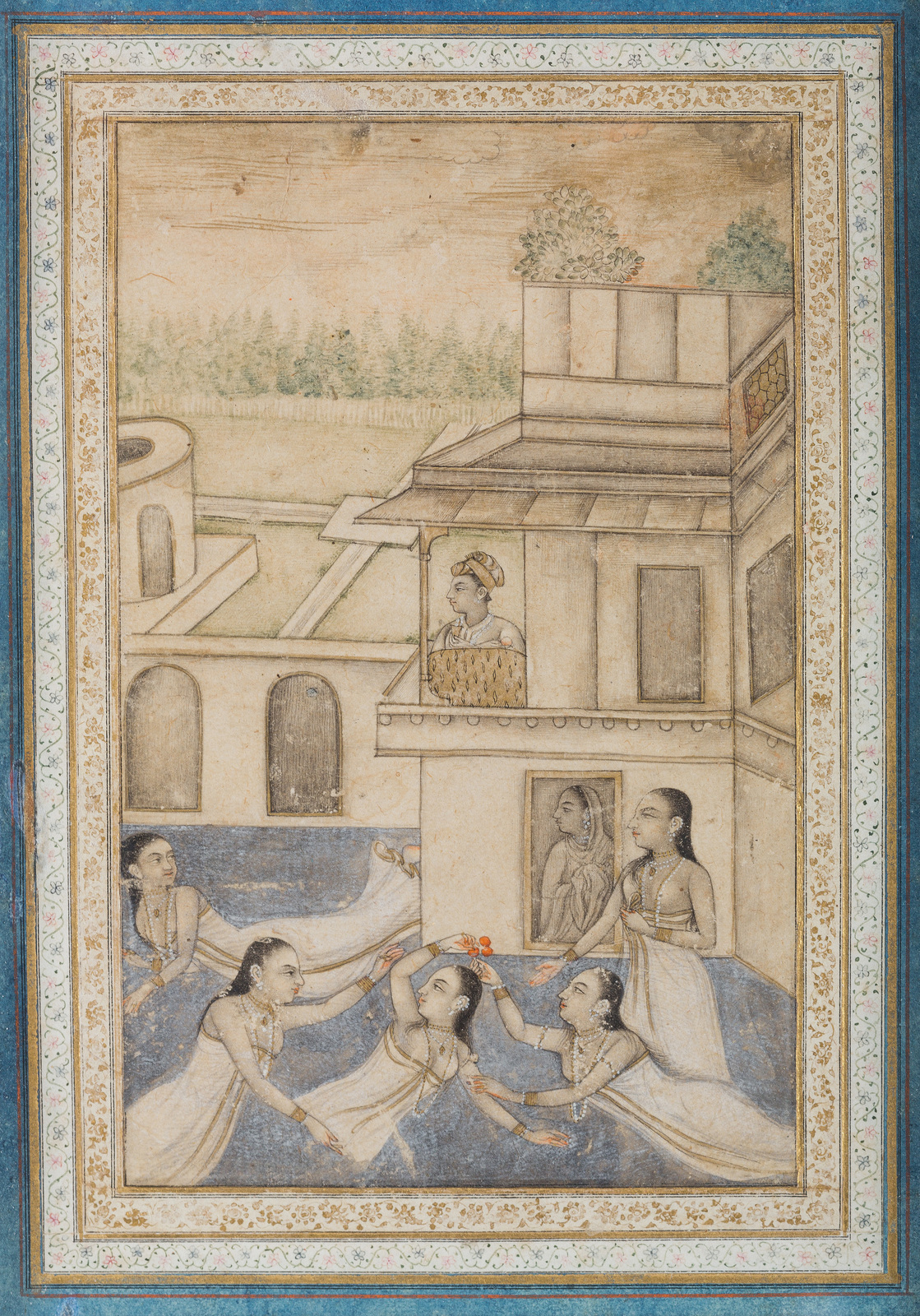 Arte Indiana Disegno raffigurante il bagno di una principessa disegno, gouache e oro su carta India, dinastia Moghul, XVIII secolo . . Cm 14,50 x 21,00. Nella piscina del giardino di un palazzo, una nobildonna fa il bagno con le ancelle mentre un uomo guarda da un parapetto. Cornici dei margini e dettali in oro. . Cornice presente