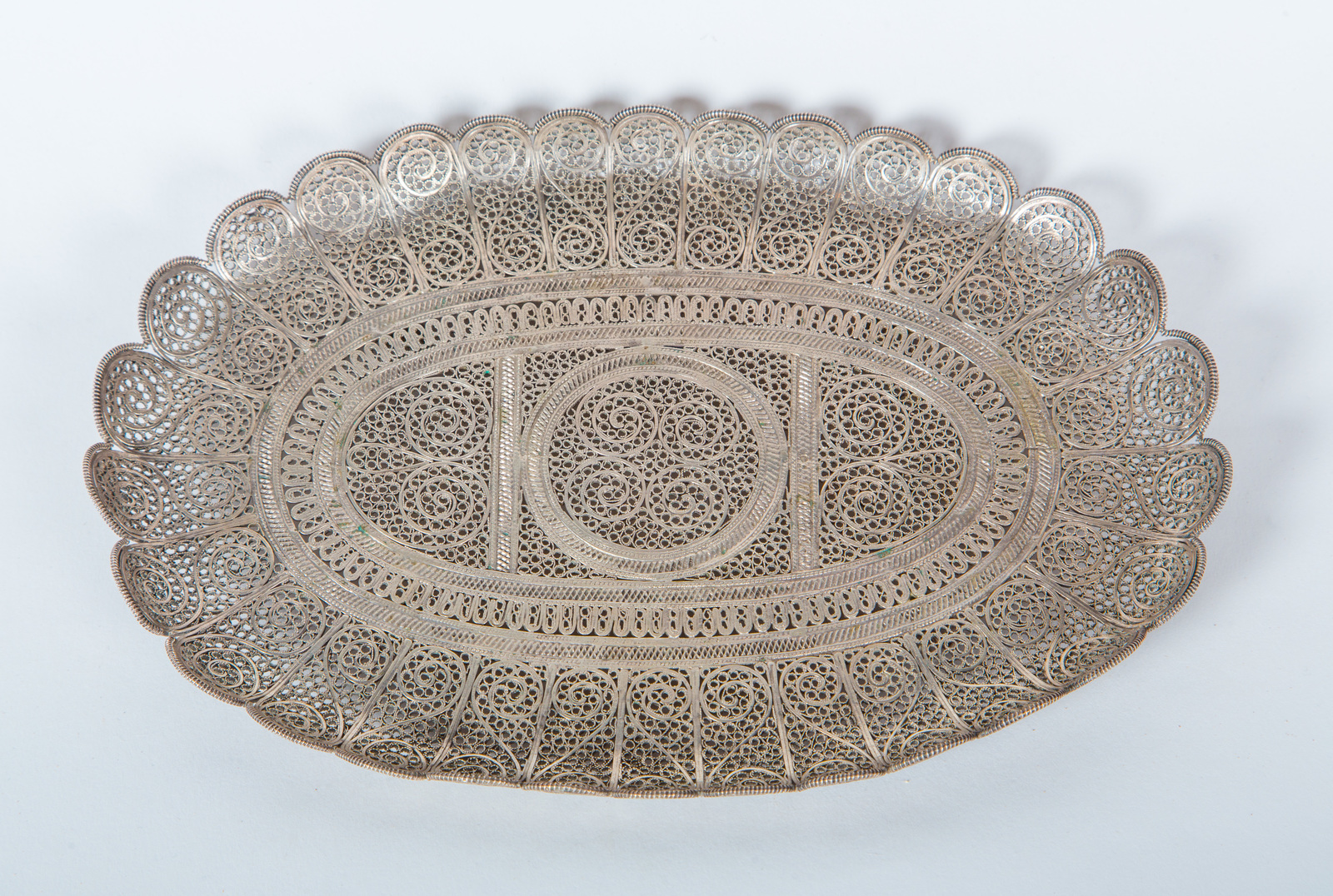 India, Karimnagar, XIX secolo . . Cm 24,00 x 16,50. di forma ovale, poggiante su quattro piedini in forma di fiore, lavorato a traforo con fiori e rosette.