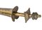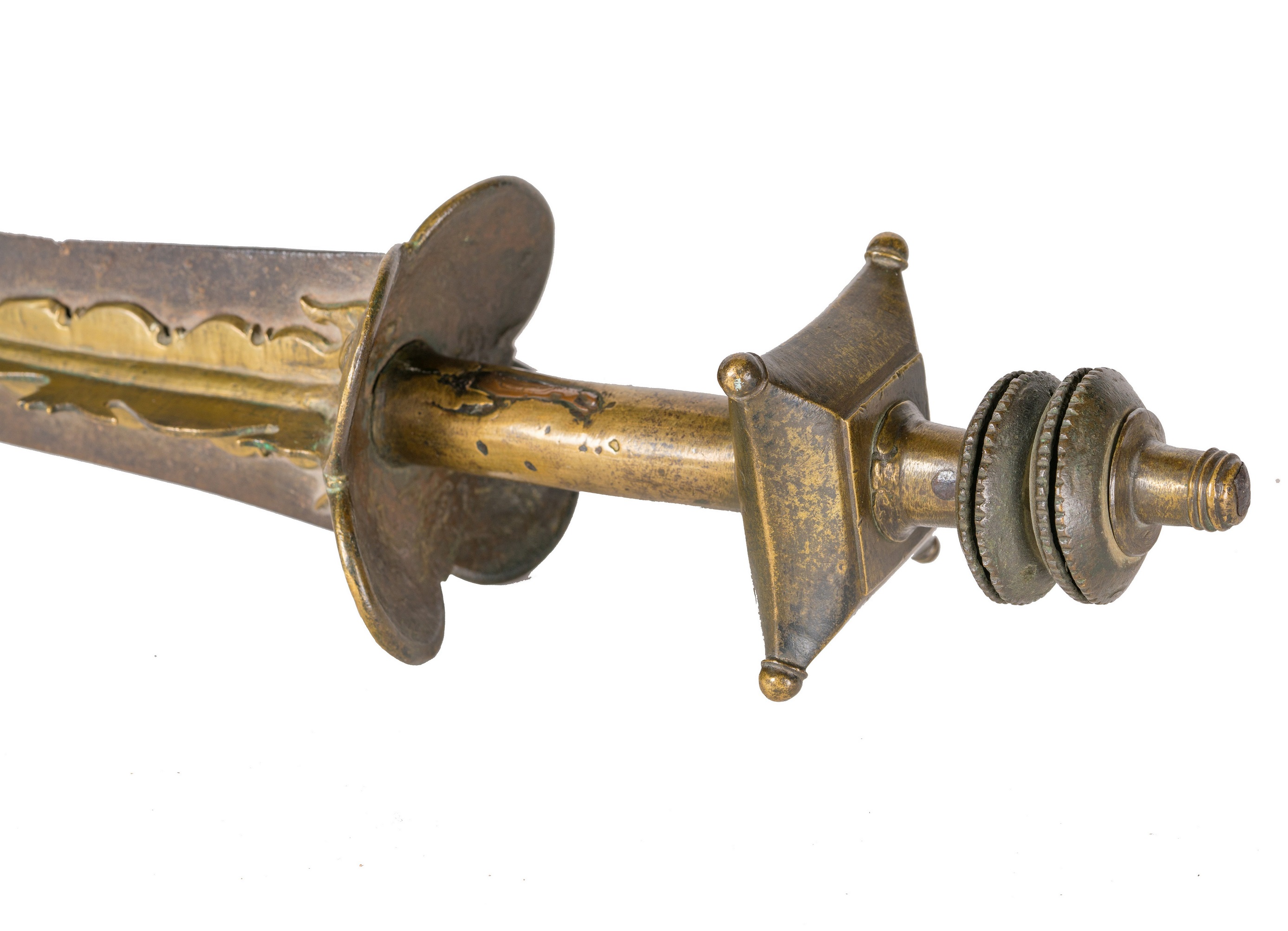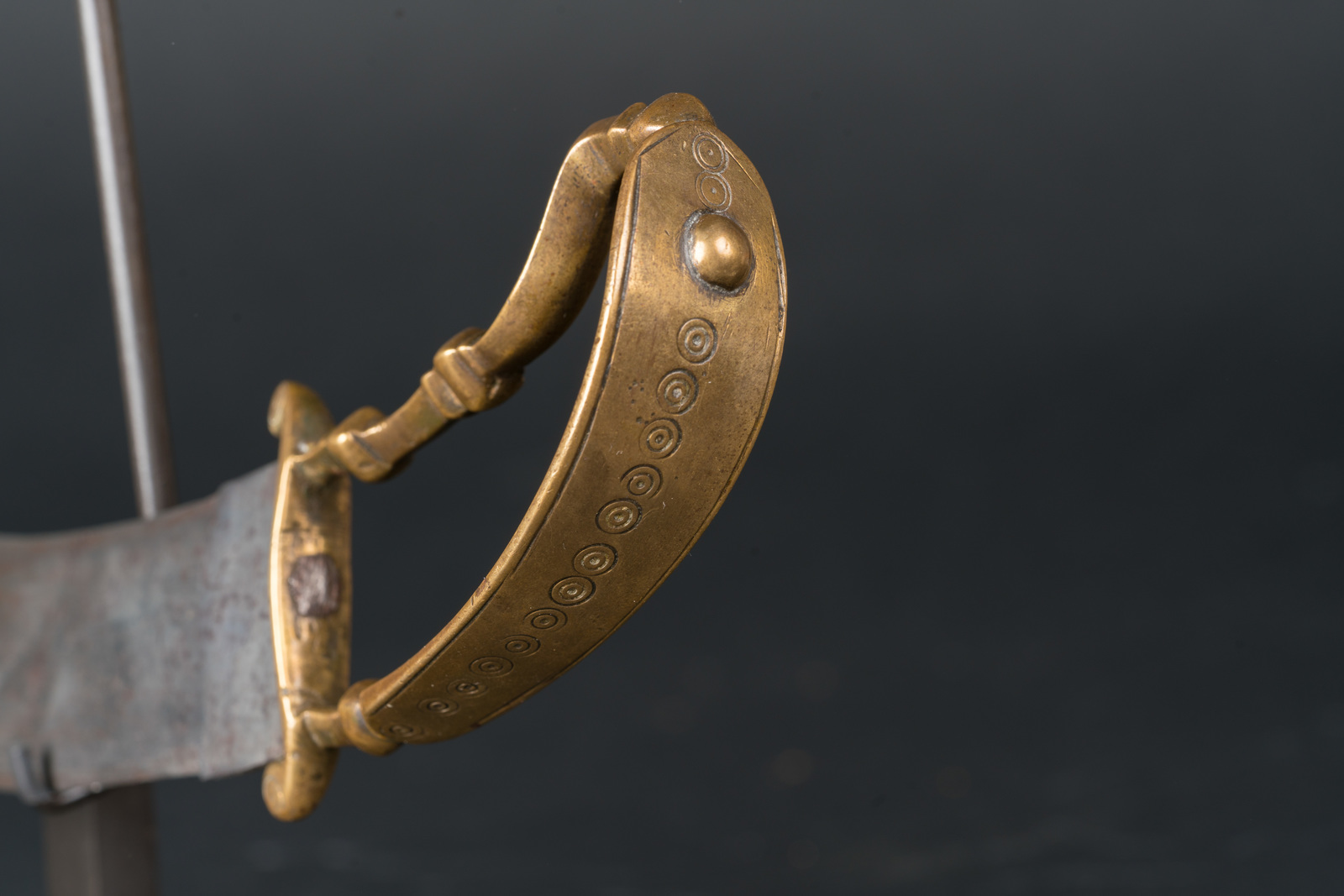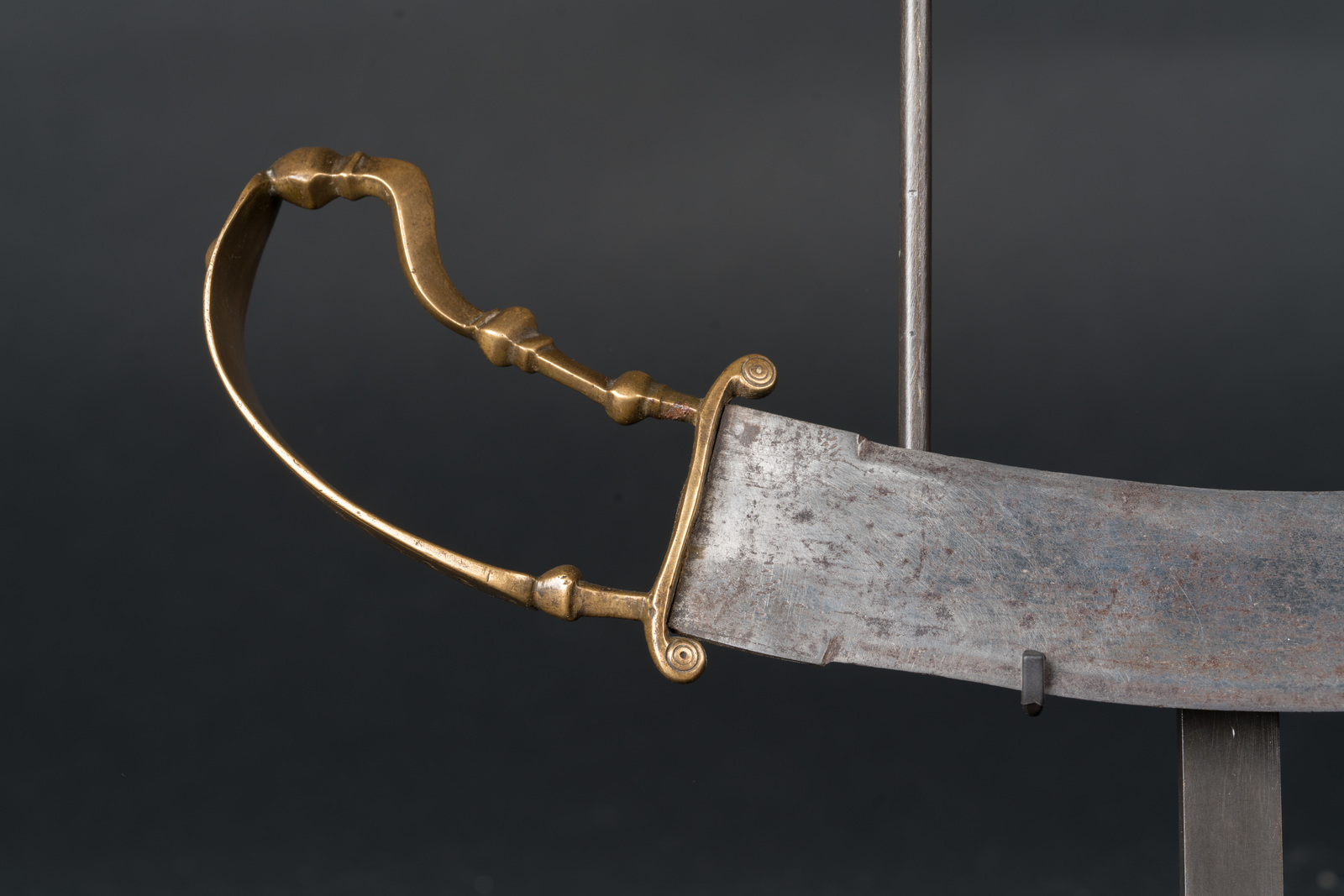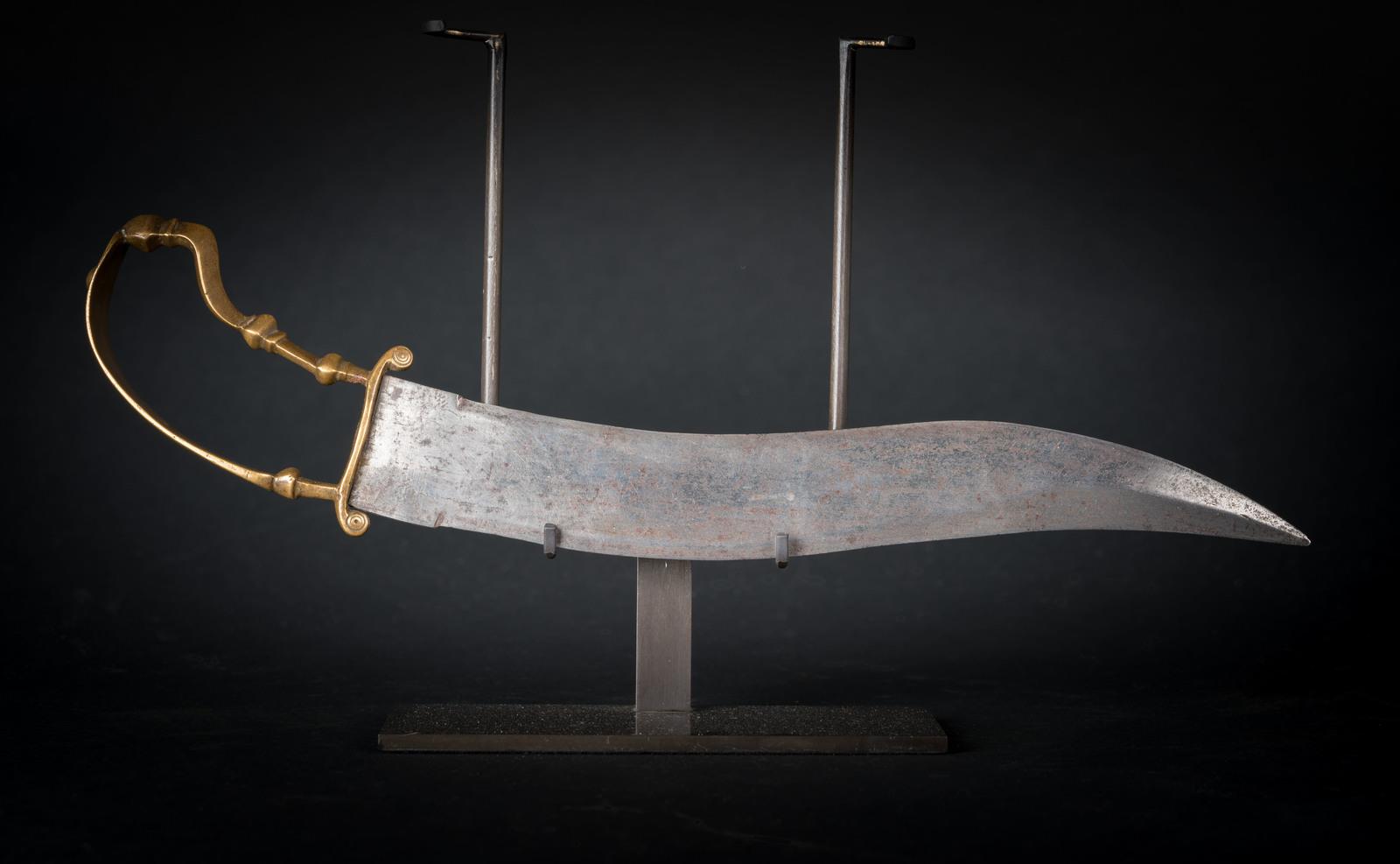 Arte Indiana Rara spada Vijayanagara o Nayak India meridionale, XVI-XVII secolo . . Cm 67,00. Lama ricurva in ferro a filo singolo, impugnatura in ottone decorata con due elementi circolari ruotanti con sonagli e con un elemento squadrato con angoli terminanti in piccole sfere. La guardia, anch'essa in ottone, sagomata in forma di piccoli dischi.