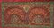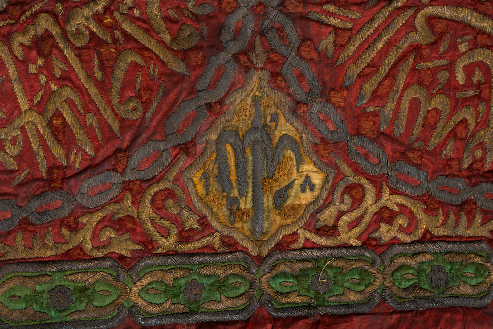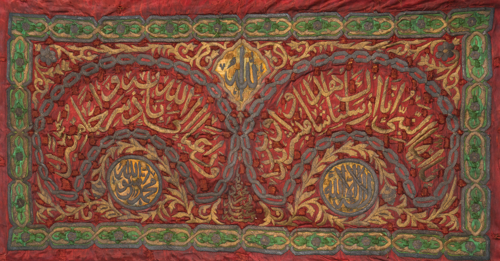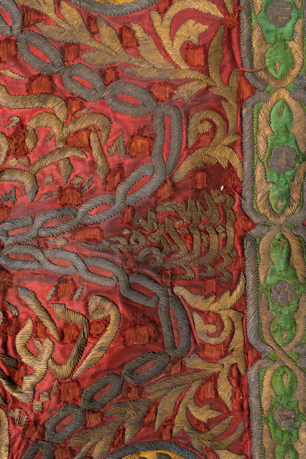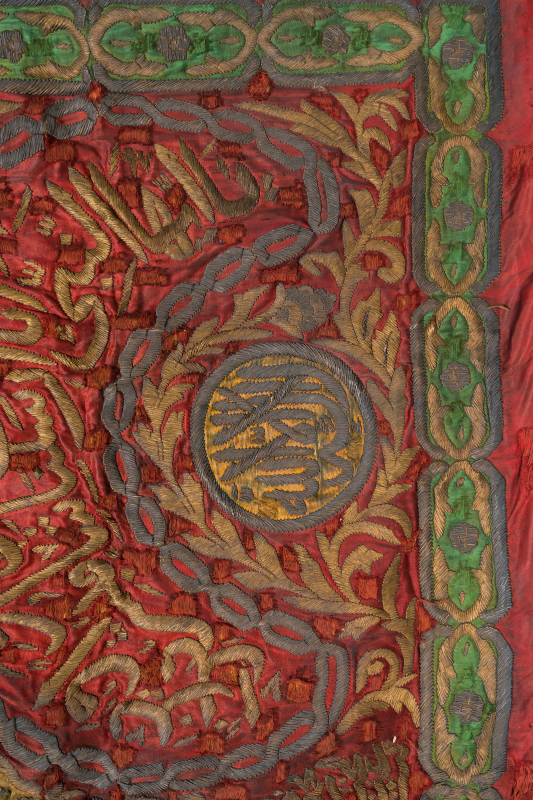 Turchia Ottomana, XIX secolo . . Cm 154,00 x 84,50. Di forma rettangolare delimitato da una cornice decorata con elementi vegetali su sfondo verde, la parte centrale, su fondo rosso, ricamata con ampie iscrizioni entro semicerchi delimitati da motivo vegetale o a catena, entro cartigli circolari o cuspidati.