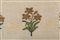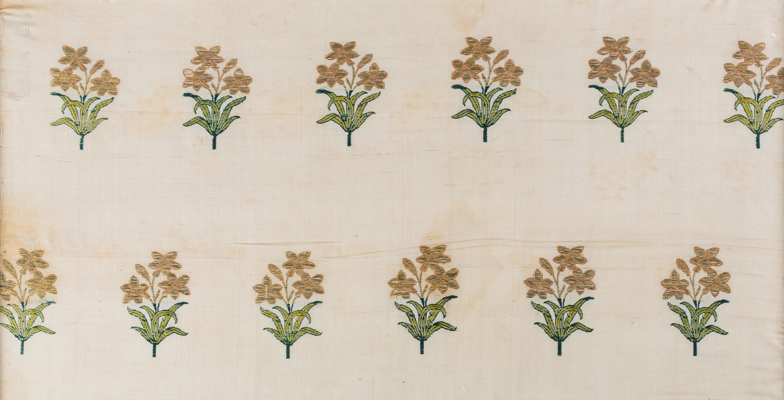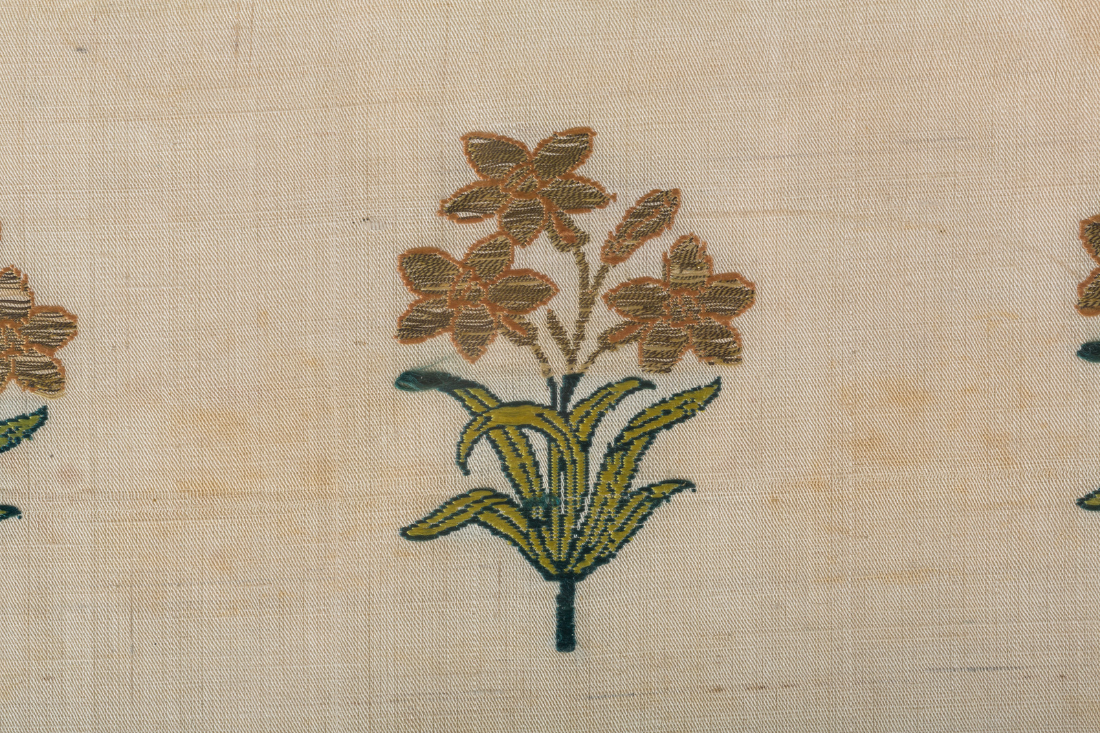 India Moghul, XVIII secolo . . Cm 51,50 x 27,00. Sfondo color crema decorato con due file di piante con tre fiori ricamate. Cornice presente