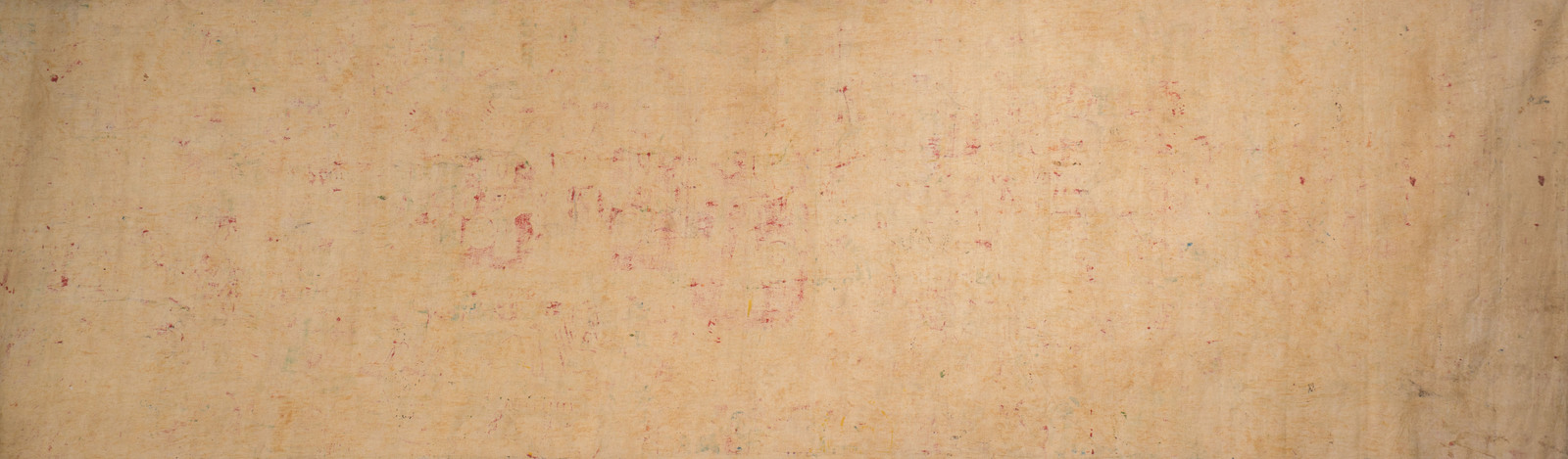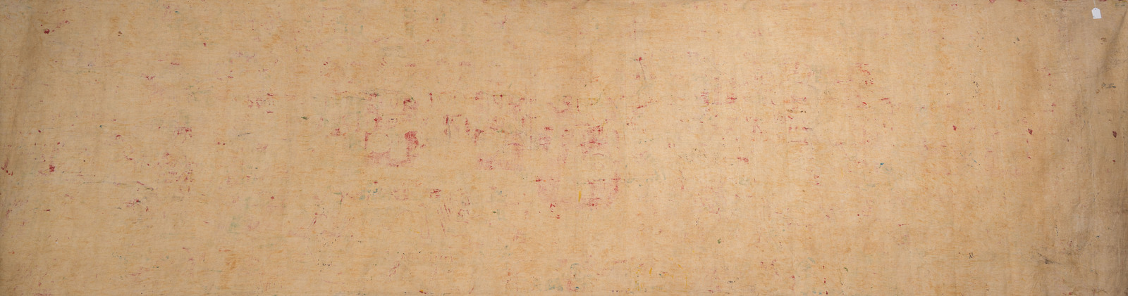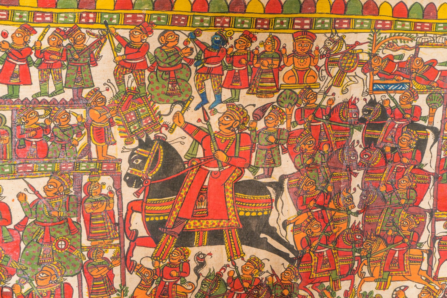 India settentrionale, Rajasthan, XX secolo . . Cm 480,00 x 130,00. Lungo tessuto religioso narrante le gesta epiche di Pabuji, un principe medievale rajasthano poi divinizzato ed adorato tutt'oggi soprattutto nelle campagne della regione. La narrativa di questo dipinto è contenuta nel testo"Pabuprakasa".