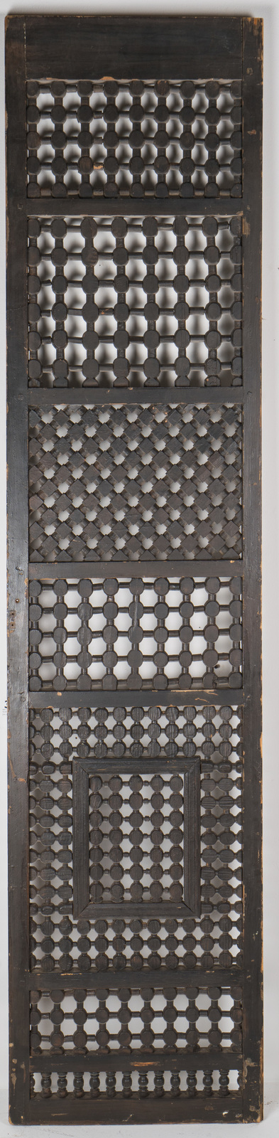 Near East, 16th-19th century. . Cm 48,50 x 209,00. The tallest, dating back to the 19th century, openwork decorated with different sort of geometric patterns coming form knots interlocking. The pair, always relying on a knot-pattern decoration, datable to the 16th-17th century (113 X 64 cm).