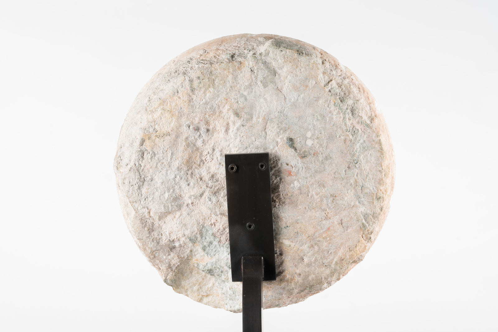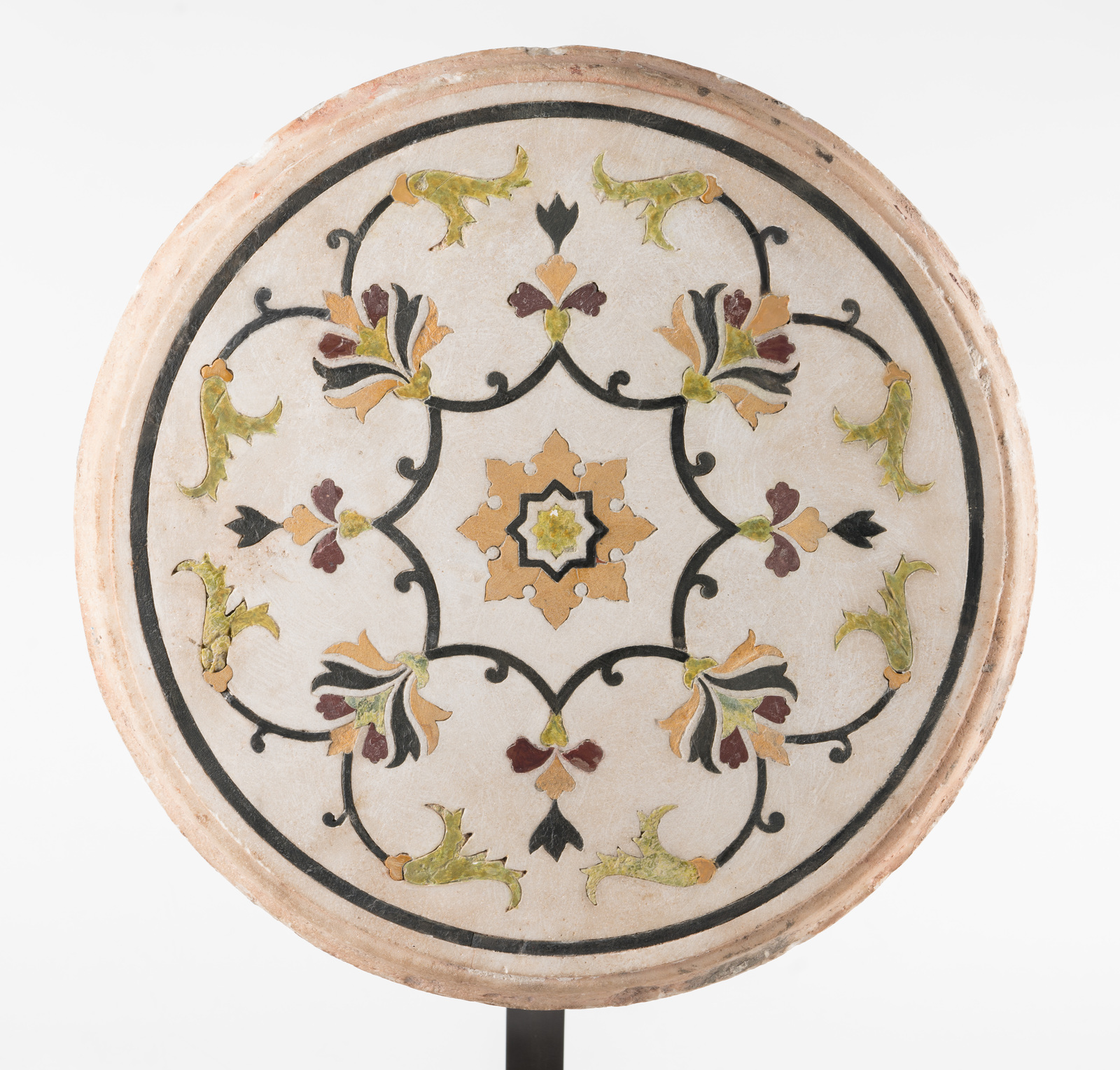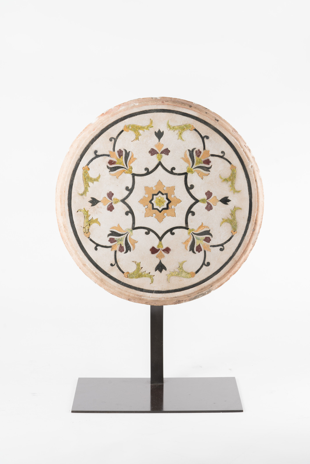India, dinastia Moghul, XVII secolo . . Cm 35,00 x 54,00. Di forma circolare, intarsiato con pietre di diversi colori, a formare un decoro con stella centrale ad otto punte, da ciascuna delle quale nasce un fiore terminante con mezze palmette.