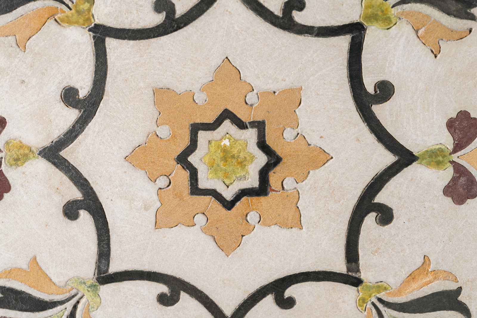 La decorazione del marmo con pietre dure è una tecnica italiana, fiorentina (commesso di pietre dure) ma largamente utilizzata anche negli edifici Moghul. Questo elemento in particolare è probabile facesse parte della decorazione di un dado (parte inferiore del muro) o, più probabilmente della struttura di una fontana, elemento principale dei giardini Moghul che richiama i giardini del paradiso, così come gli intarsi dell'elemento qui proposto.