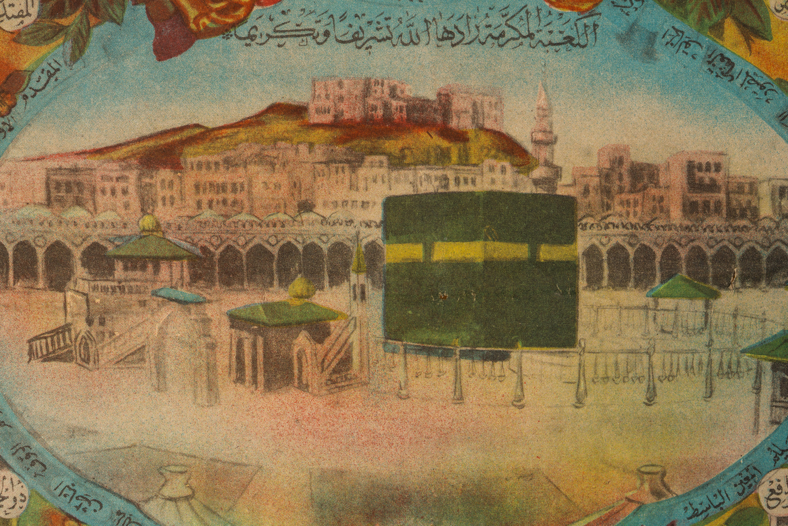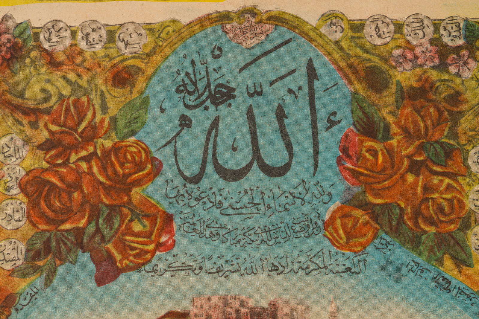 Arte Islamica Certificato di pellegrinaggio decorato con cornice barocca...