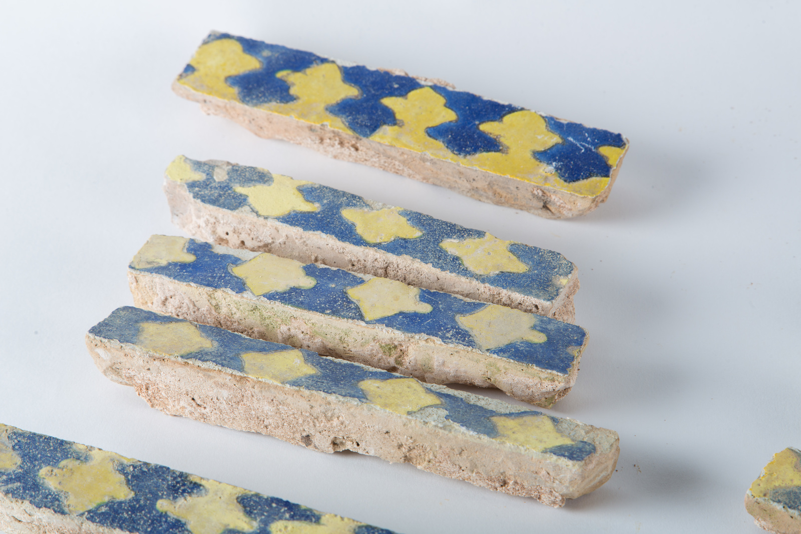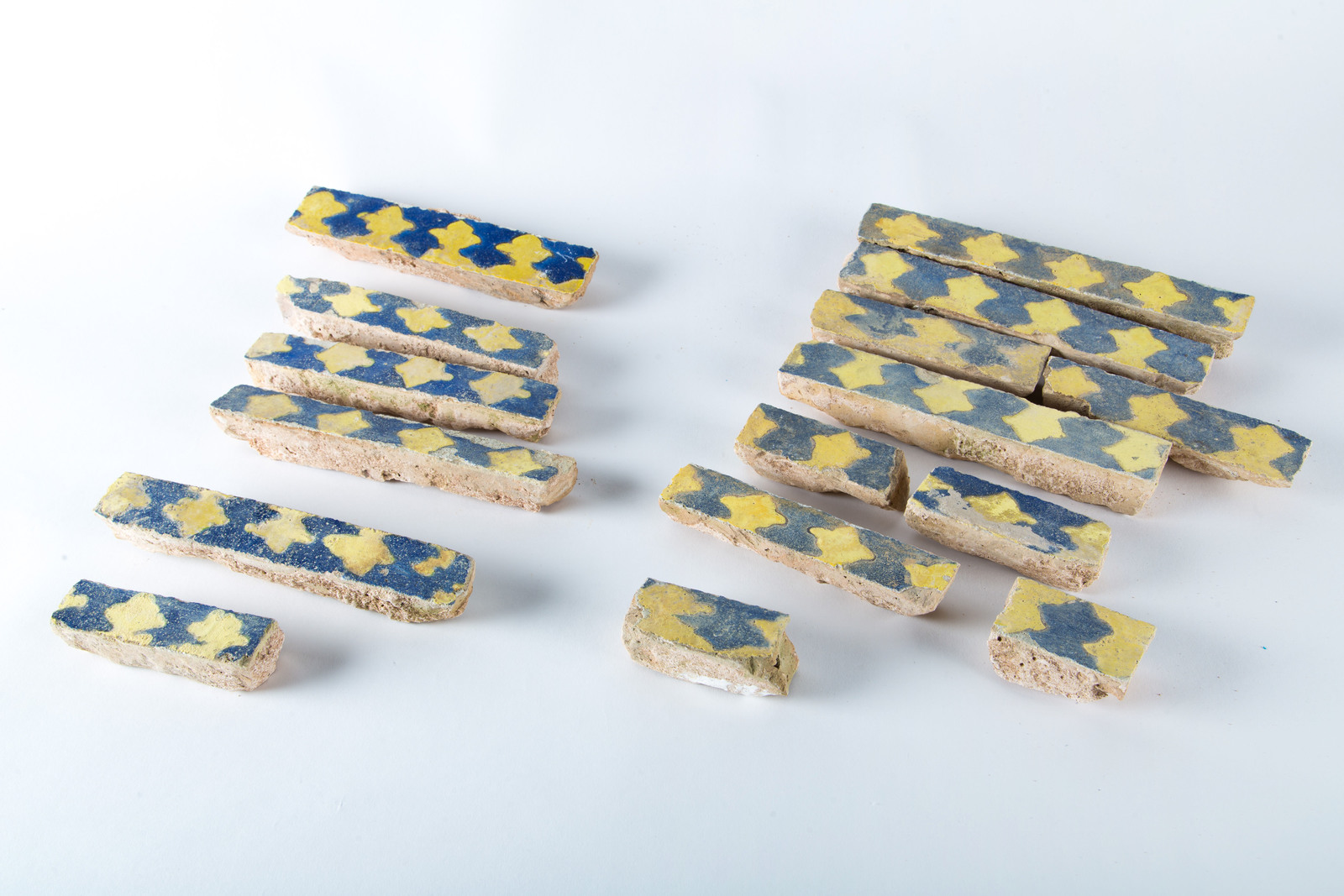 Islamic Art A pottery group of 15 border tiles decorated with yellow hamsa over blu ground
