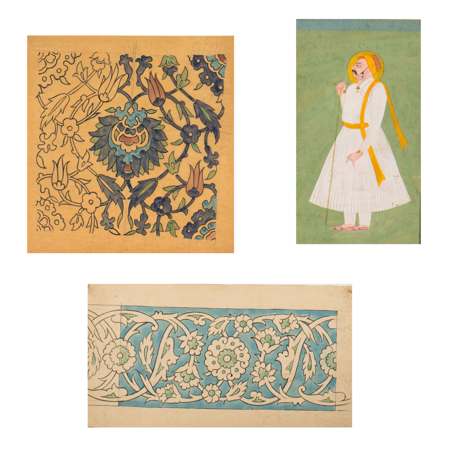 Islamic Art An Indian miniature painting depicting a standing man and two floral stencils on paper