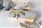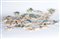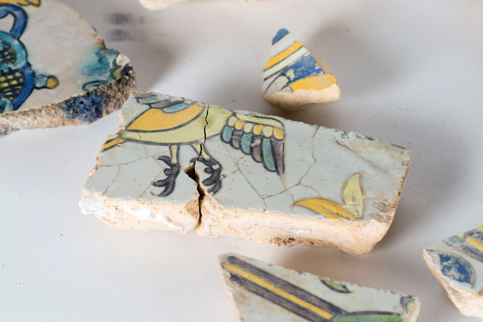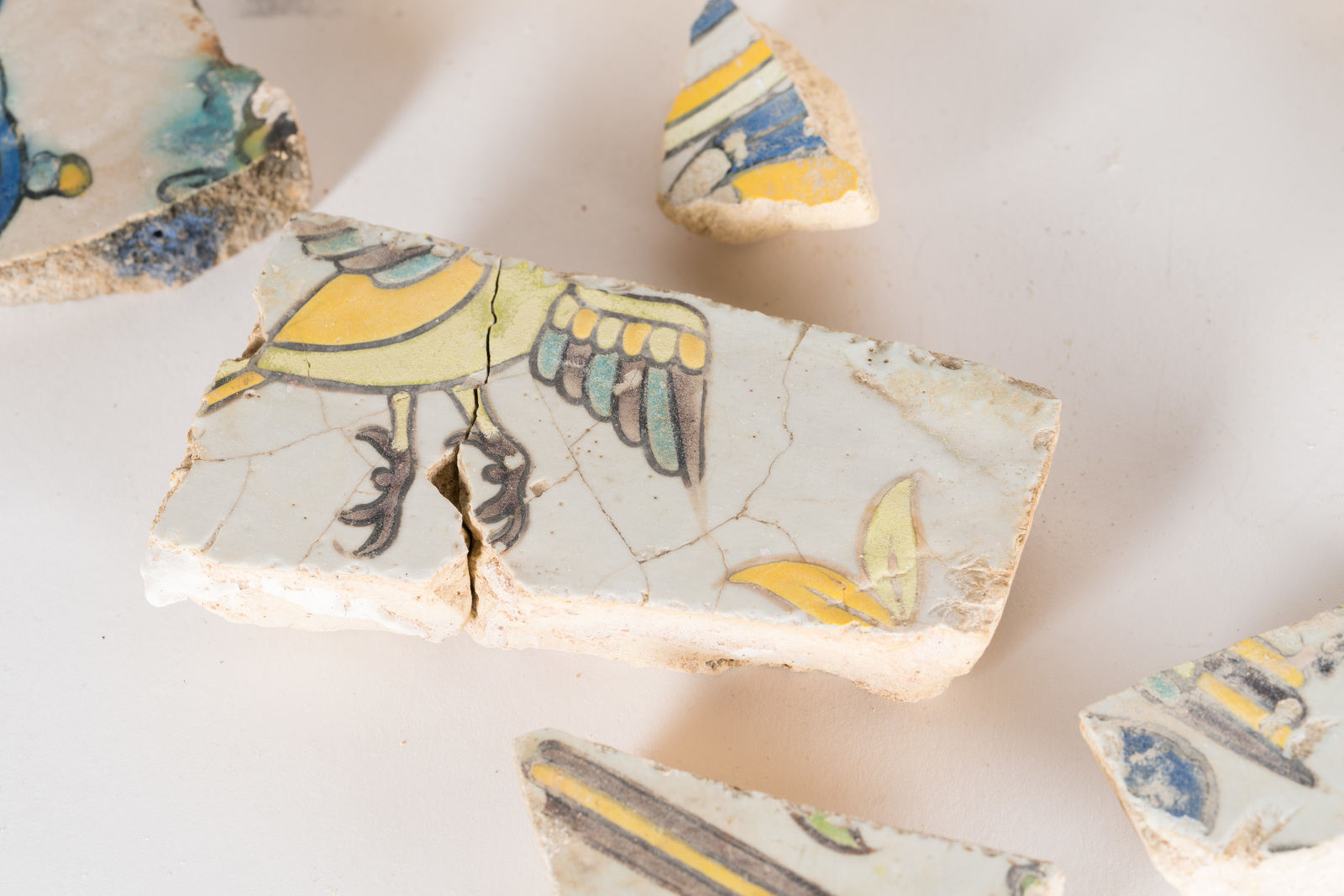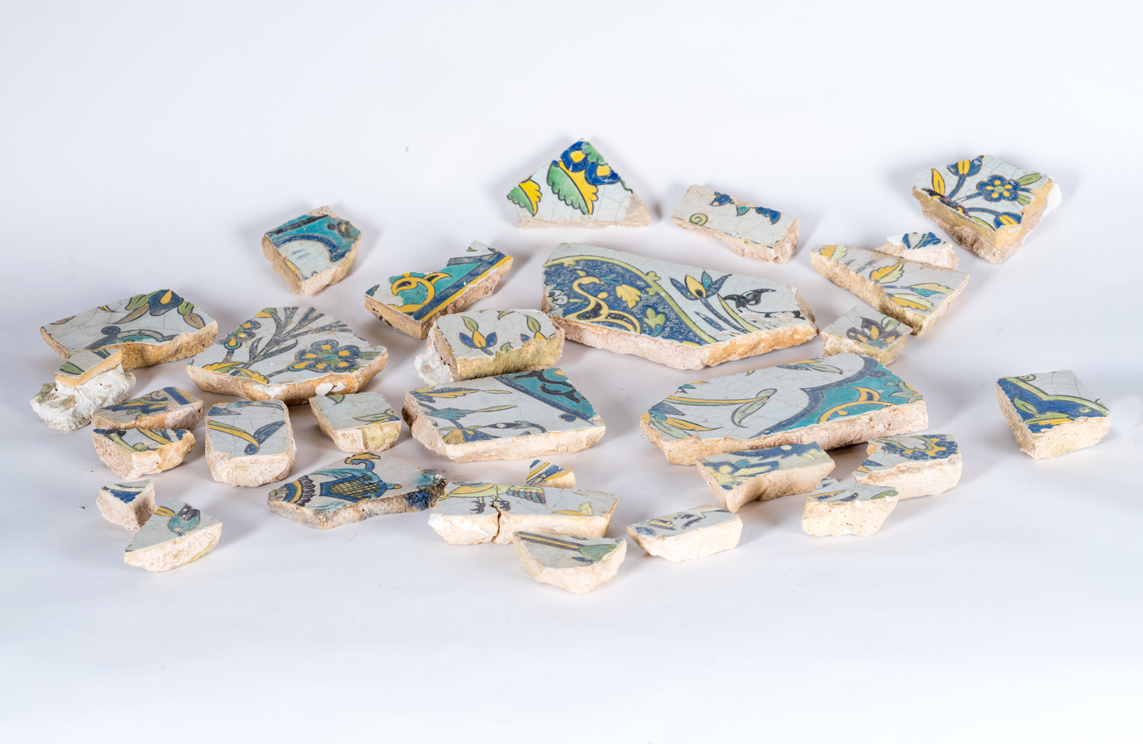 Iran safavide, XVII secolo . . . Frammenti di varie misure decorati con fiori gialli, blu e verdi su sfondo bianco. Quattro frammenti mostrano parti di un uccellino.