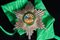 Iran, dinastia Qajar, XIX secolo . . Cm 8,00. Montatura a forma di sole, l'interno raffigurante il leone che regge la spada nella zampa destra ed il sole sulla sua schiena. Sole e leone sono entrambi emblemi della Persia Qajar, simboleggianti potere e regalità.