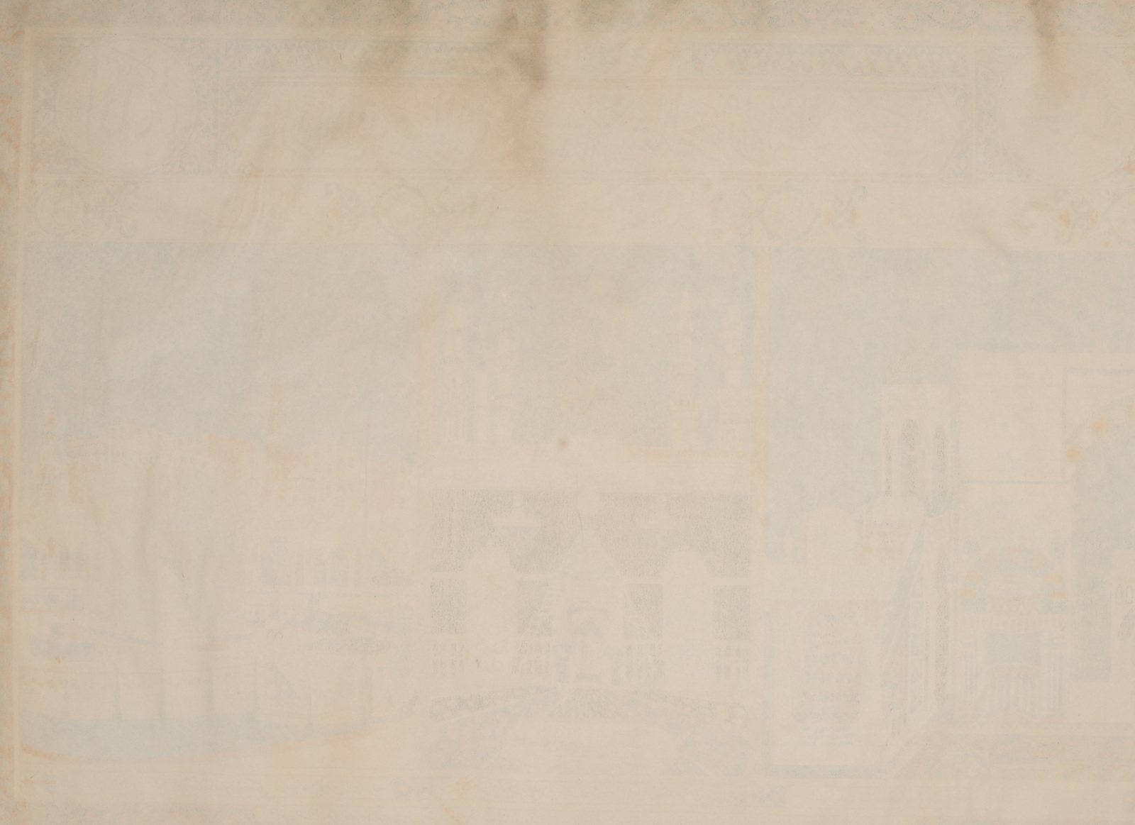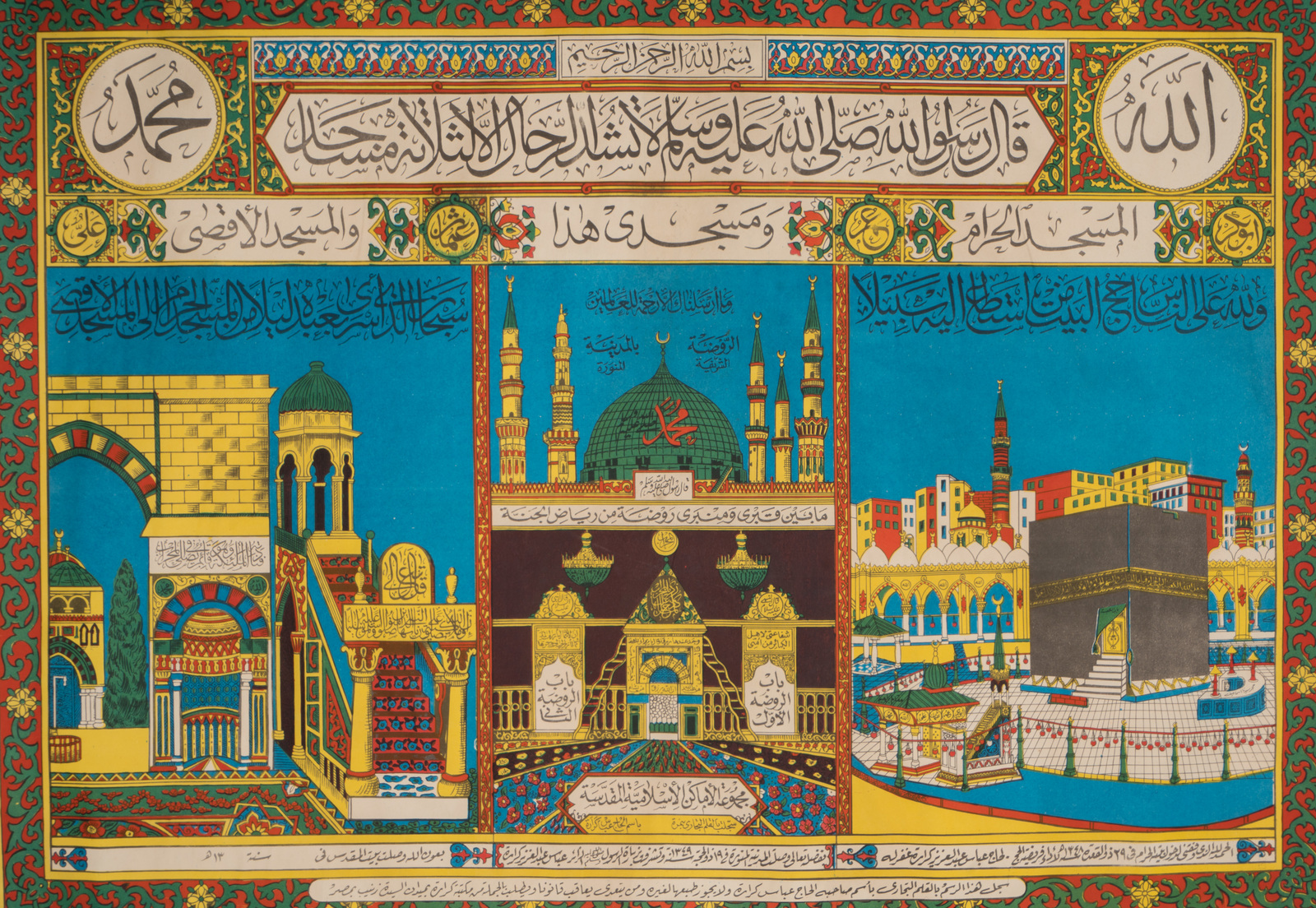 Islamic Art A Hajj certificate decorated with kaaba, mosque and minbar Turkey, 20th century . . Cm 49,50 x 73,50.