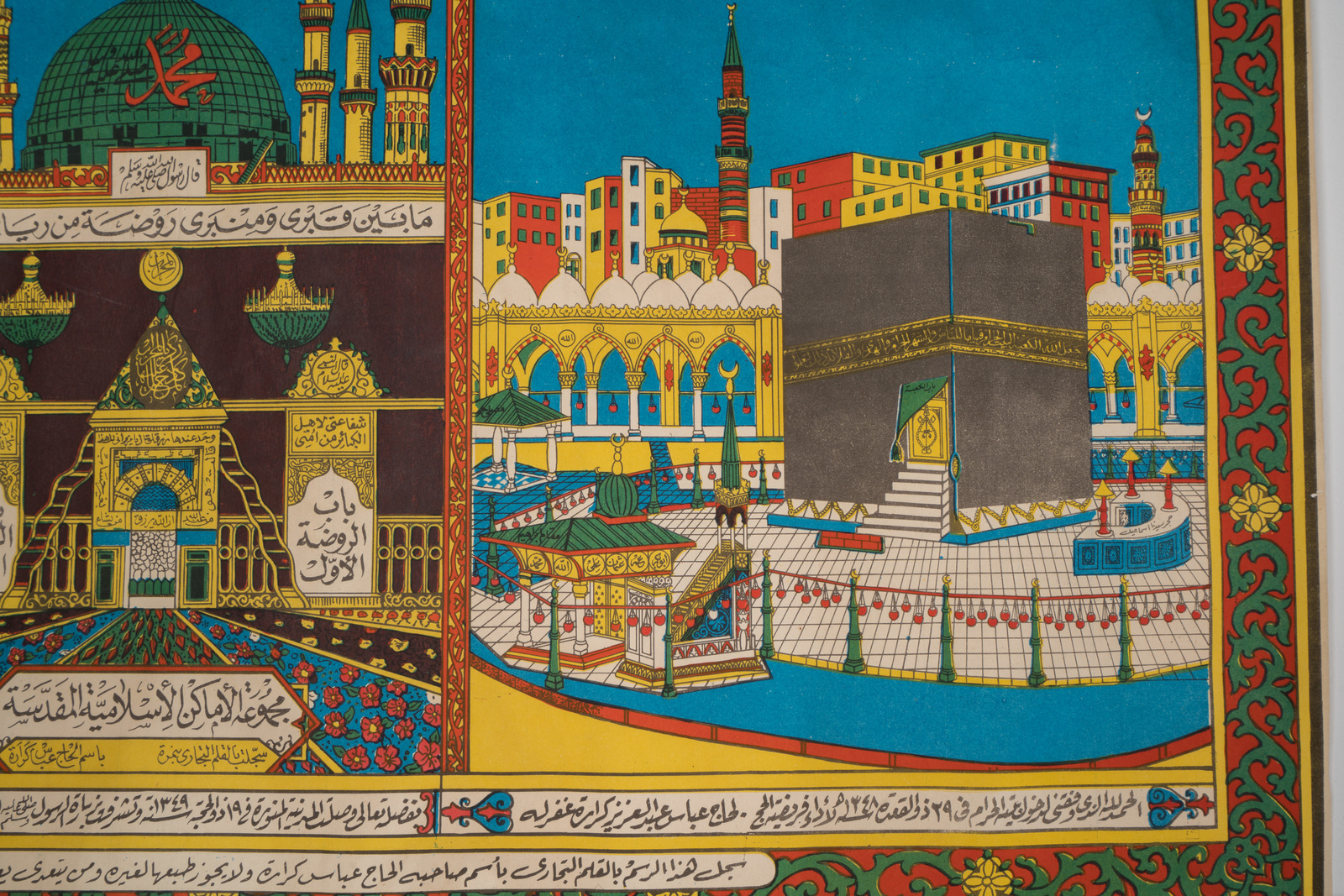Arte Islamica Certificato di pellegrinaggio decorato con kaaba, moschea e minbar Turchia, XX secolo . -. Cm 49,50 x 73,50.