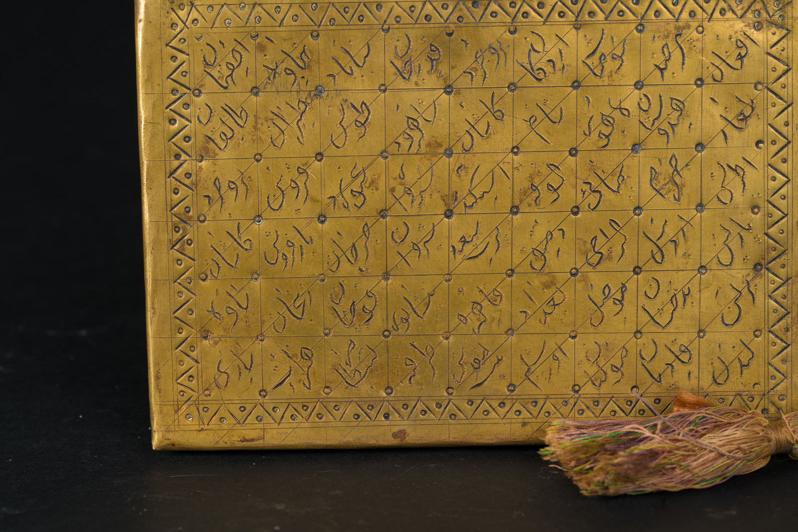 Arte Islamica Astrolabio in ottone Iran, XIX secolo . -. Cm 10,00 x 14,50 x 1,50. di forma rettangolare, il fronte mostra una bussola ed incisioni di carattere astrologico con un marcatore zoomorfo. Il retro è inciso con un diagramma iscritto.
