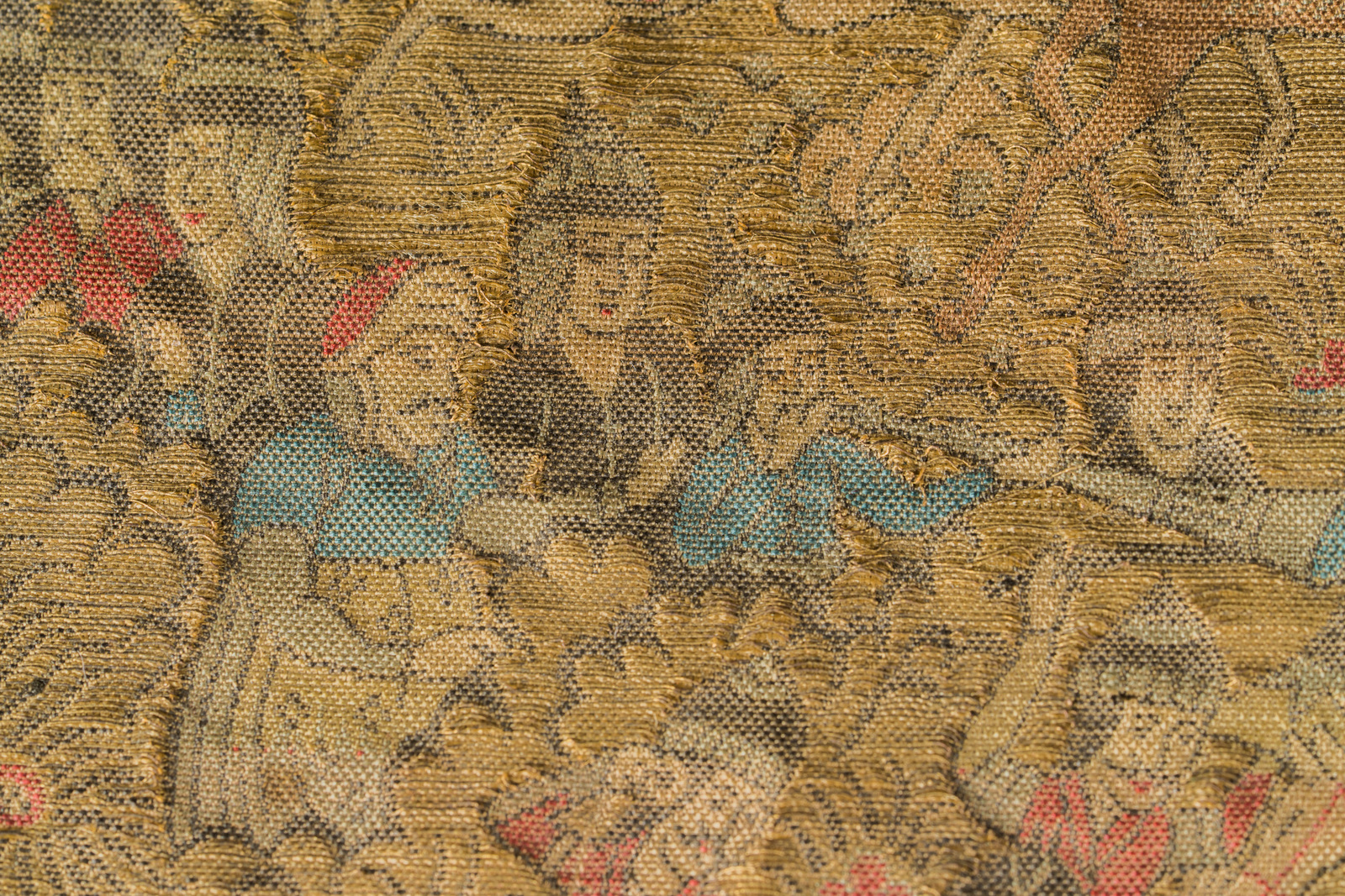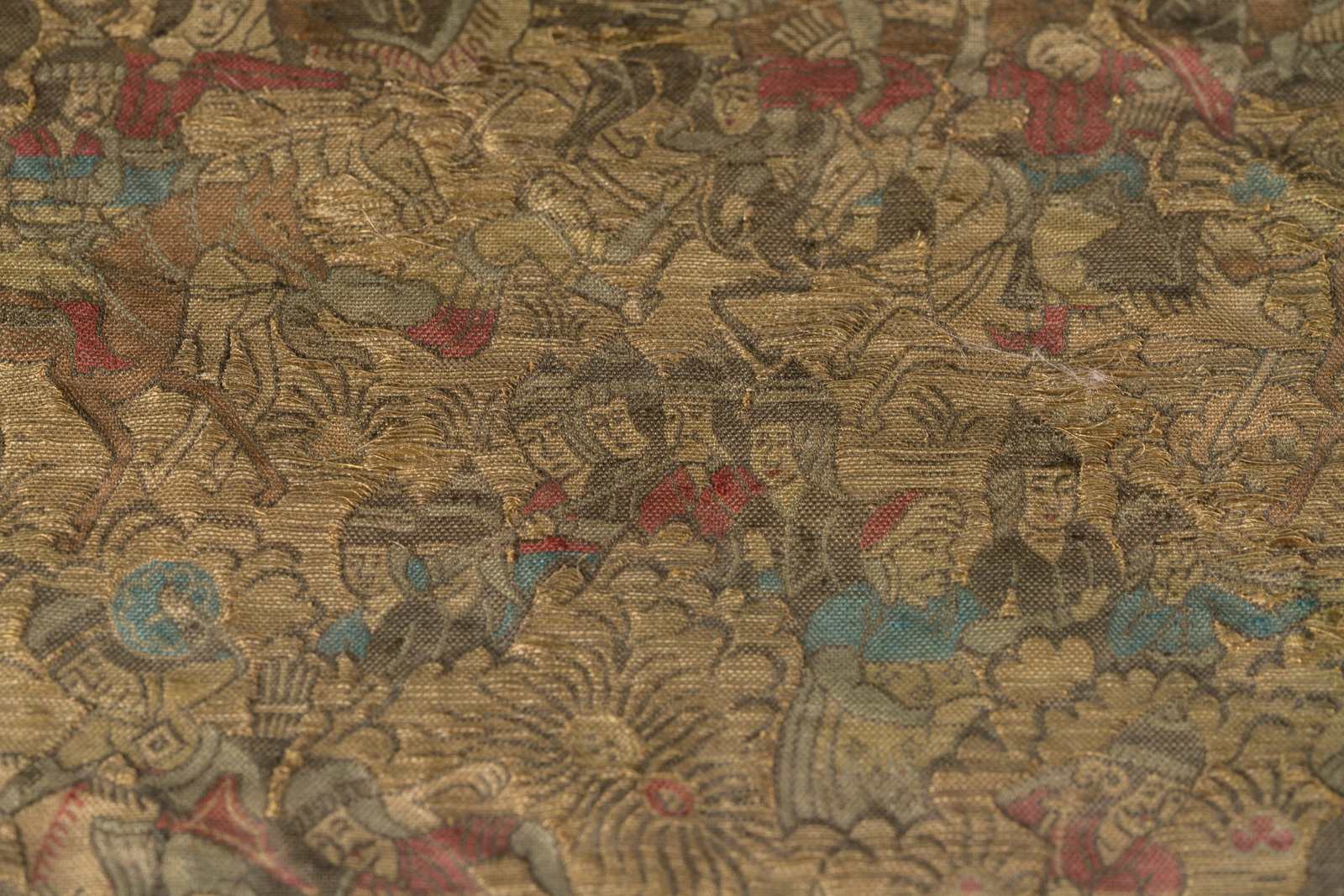 Arte Islamica Tessuto circolare ricamato a filo d'oro decorato con concitate scene di battaglia