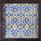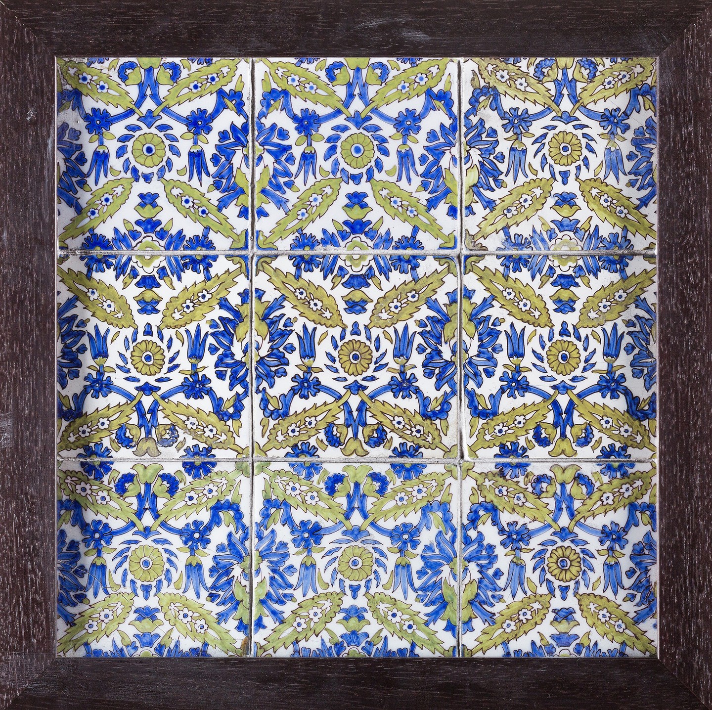 Turchia Ottomana, Kutahya, XVIII secolo . . Cm 46,00 x 46,00. Pannello composto da 9 mattonelle 13 X 13 cm montate in cornice. Ogni mattonella è smaltata con motivo floreale nei classici toni del verde salvia e del blu.