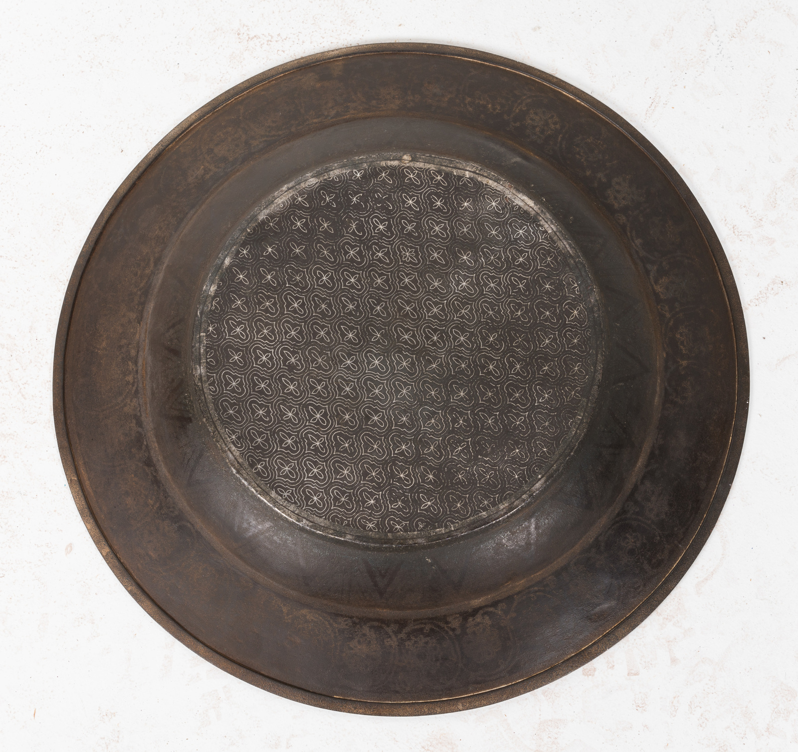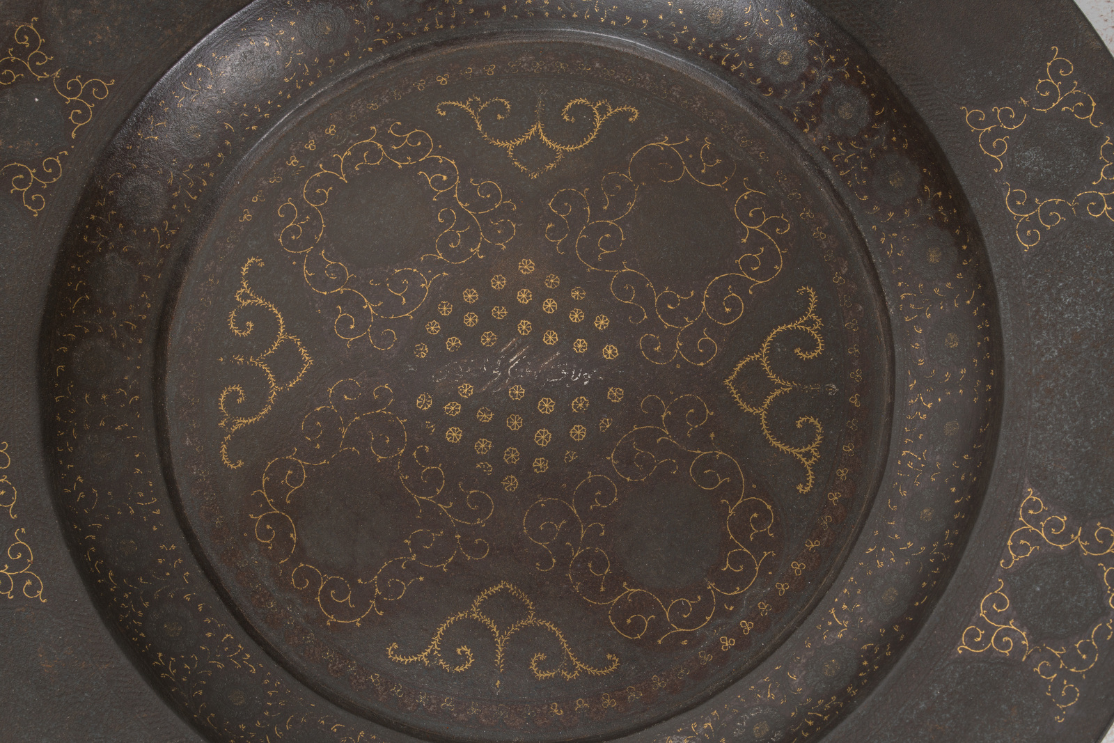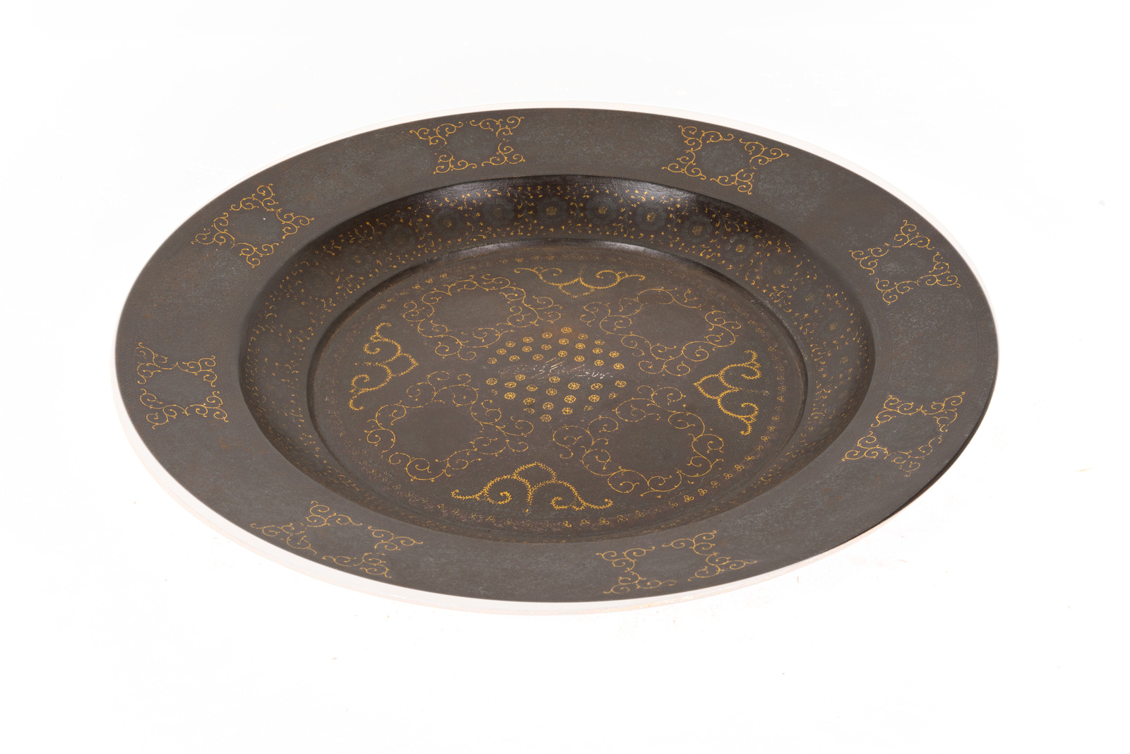 India, XIX secolo. . Cm 40,00 x 4,00. Grande vassoio a pianta circolare damaschinato con la tecnica koftghari con filo dorato ed argentato a formare arabeschi intrecciati. Breve iscrizione calligrafica nel centro.