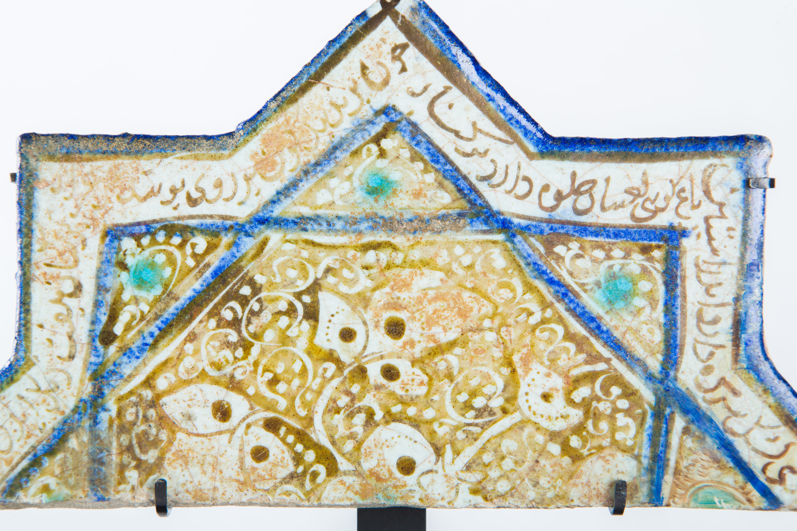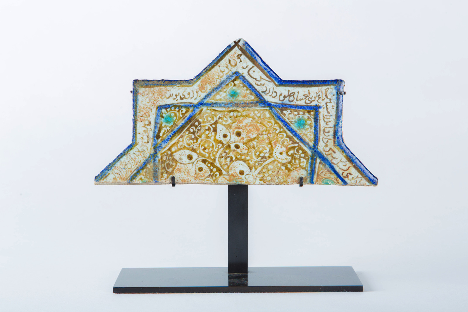 Iran, Kashan, tardo XIII - XIV secolo . . Cm 21,50 x 11,00. Frammento di mattonella in pasta silicea, la parte centrale decorata con elementi floreali in riserva su lustro, la decorazione a stella sottolineata in blu cobalto, il bordo esterno ulteriormente decorato con iscrizione dipinta a lustro su fondo chiaro.