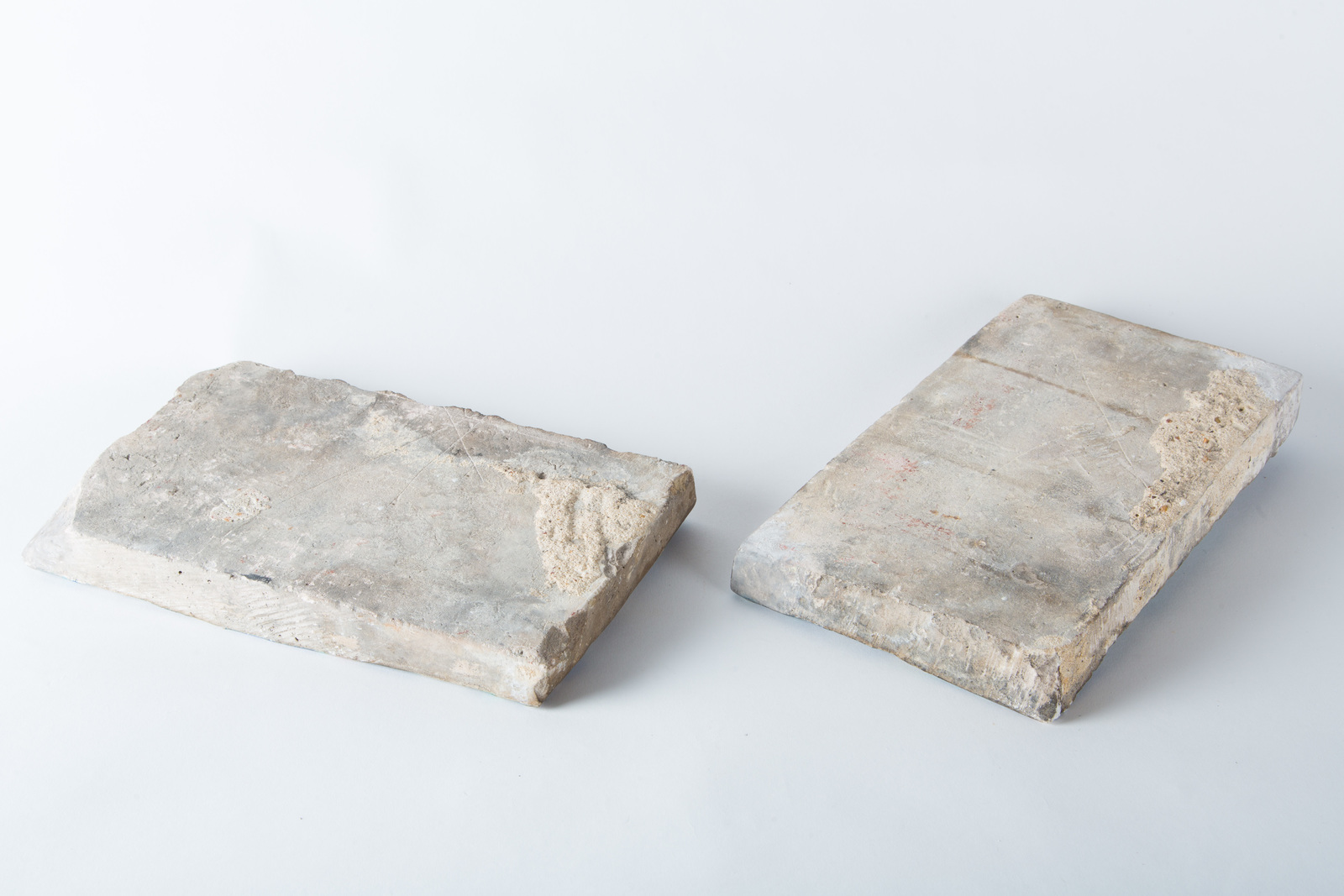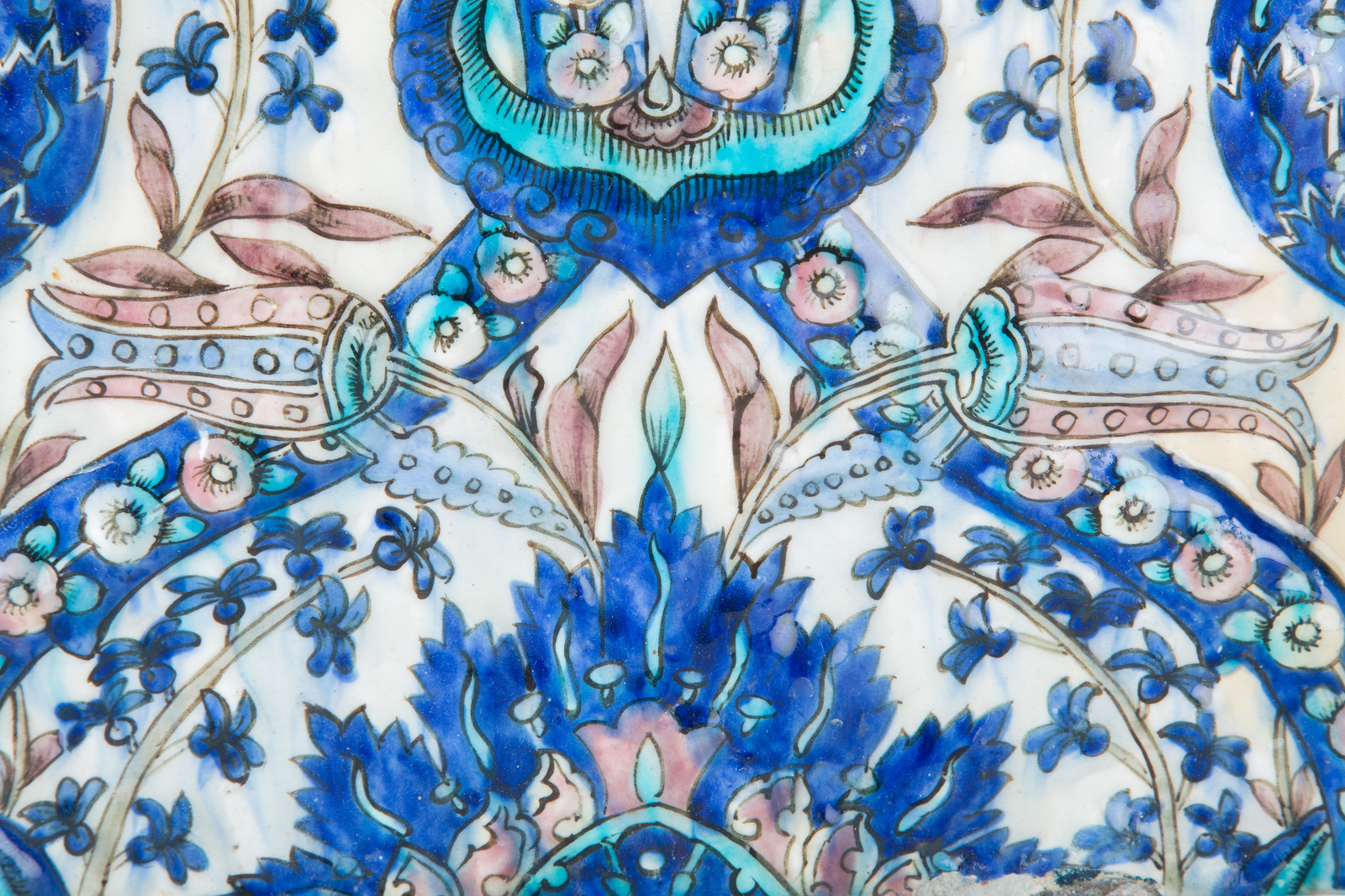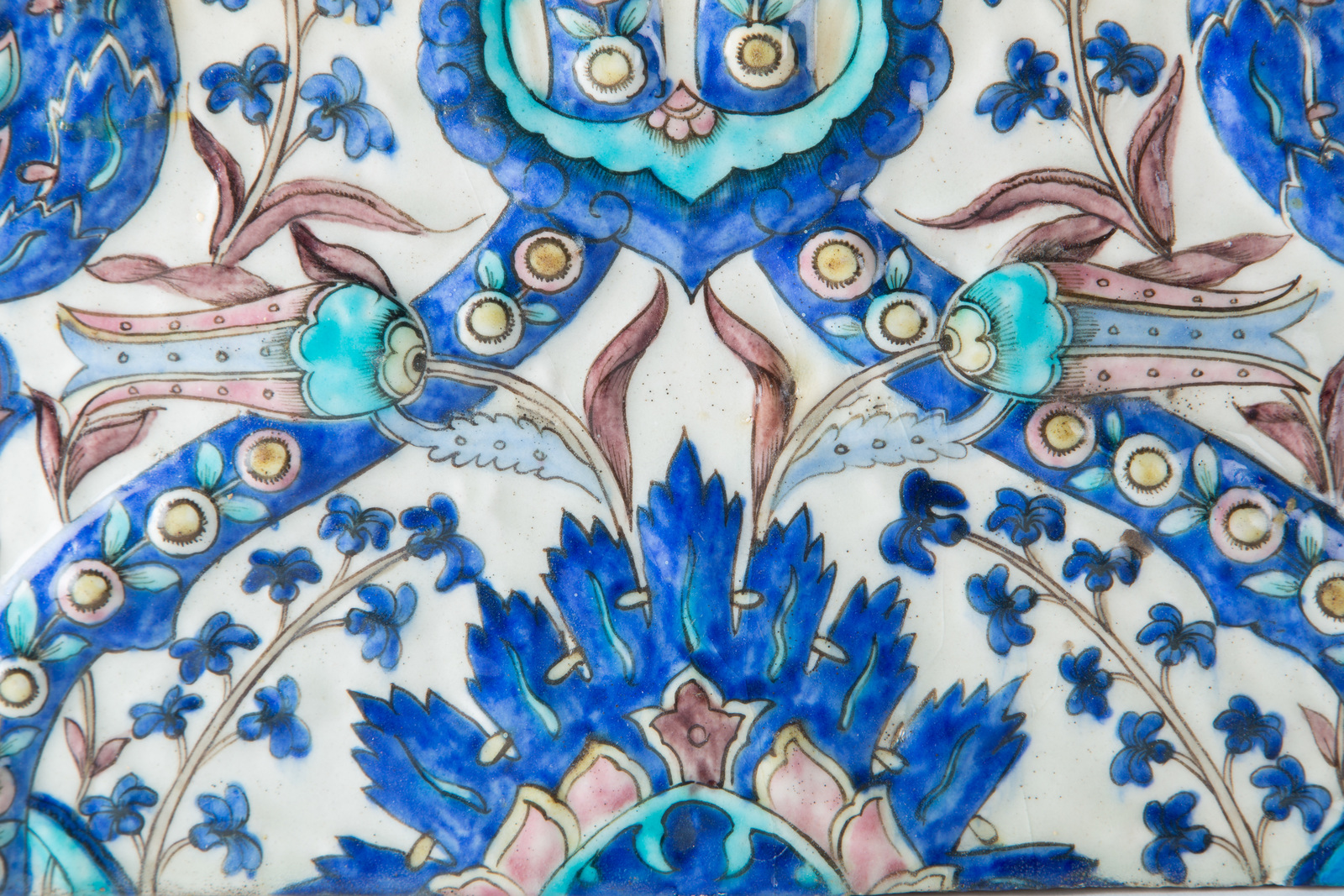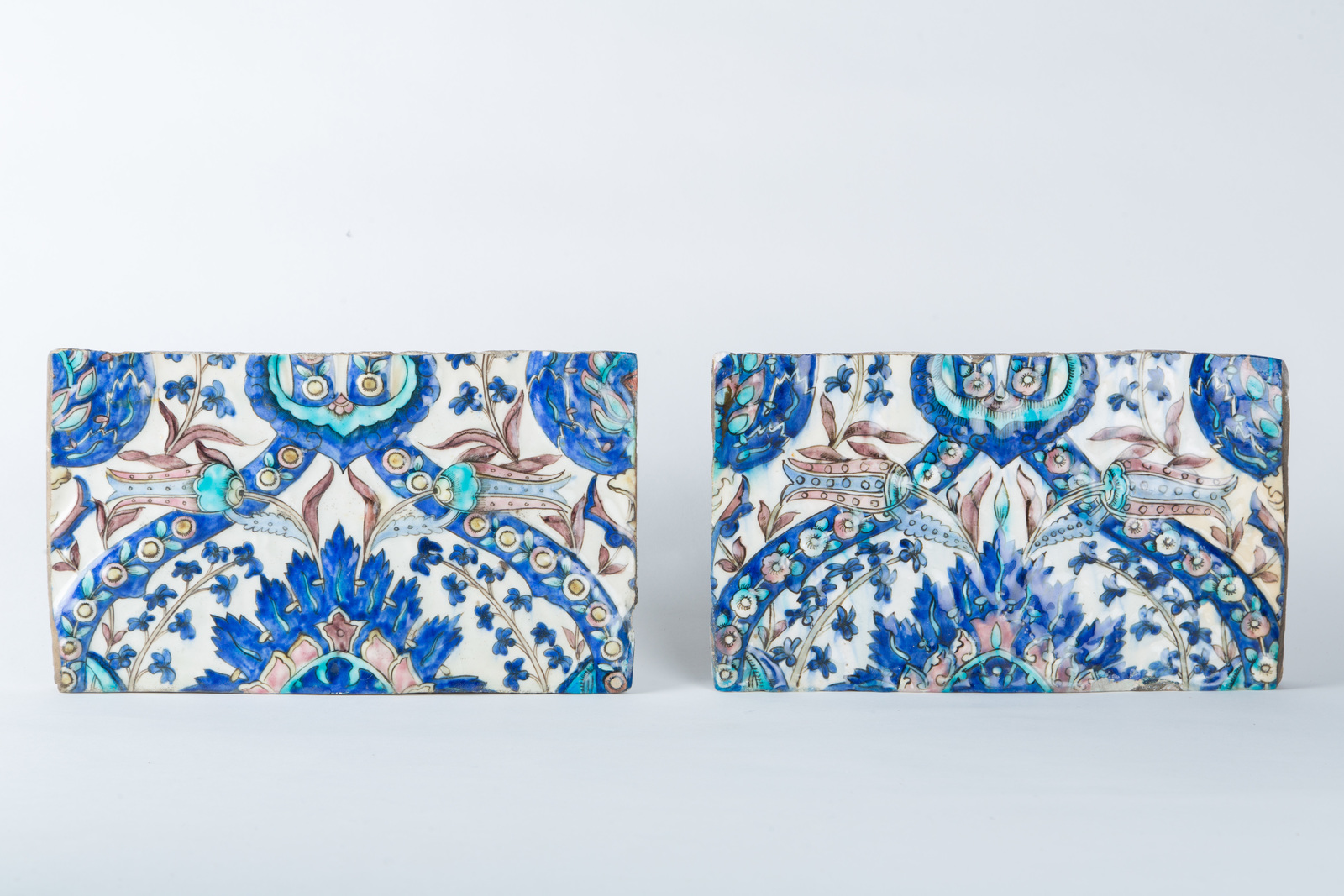 Iran, dinastia Qajar, XIX secolo . . Cm 30,00 x 18,00. Parte dello stesso pannello, le due mattonelle ( 18 X 30 cm X 2 cm) sono stampate in rilievo e smaltate con motivi floreali intrecciati nei classici toni del blu e del rosa.