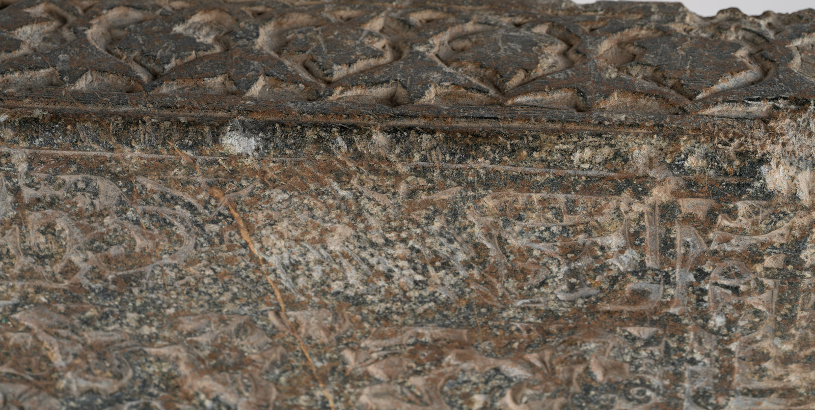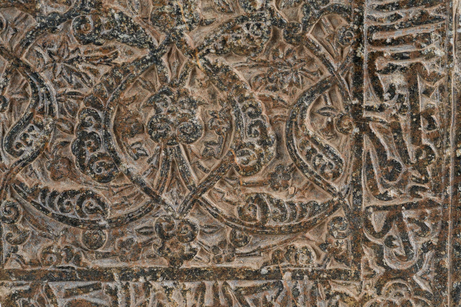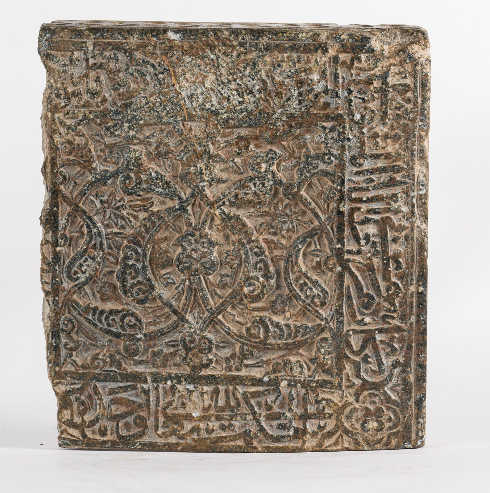 Islamic Art A dark stone sculpted with palmettes and inscriptions