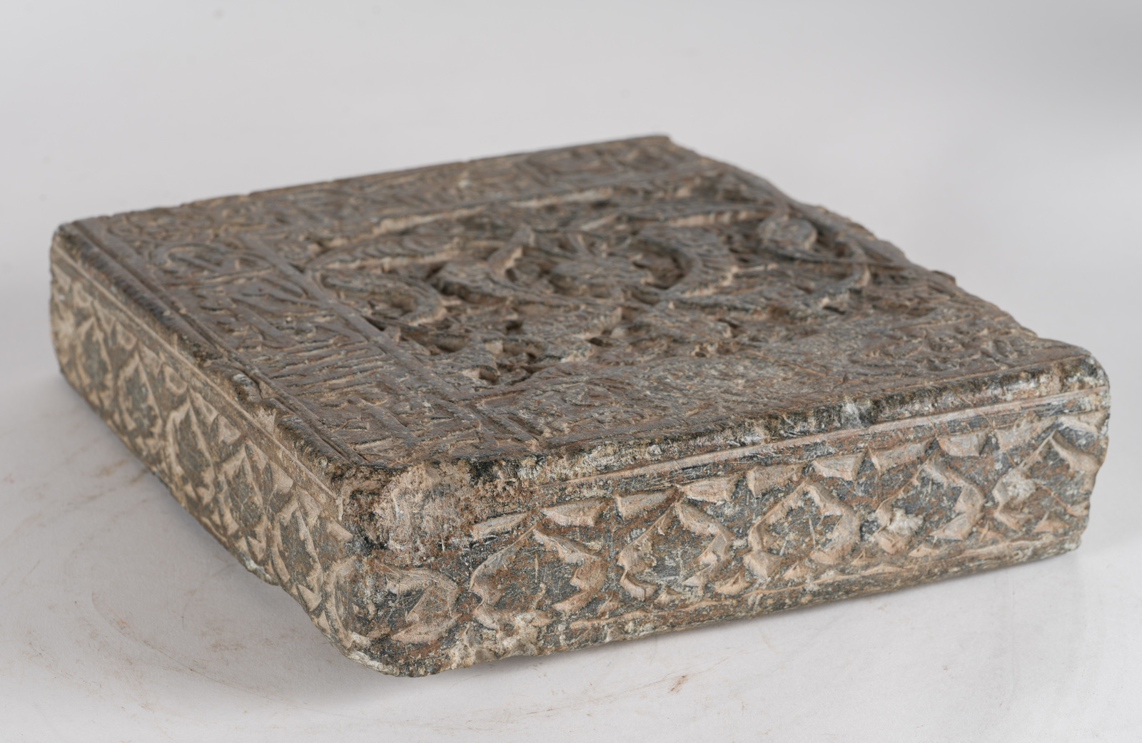 Attuale Afghanistan, Ghazni. periodo ghaznavide, XI-XII secolo . . Cm 23,00 x 25,30 x 5,50. finemente scolpita con arabeschi intrecciati entro cornice calligrafica.