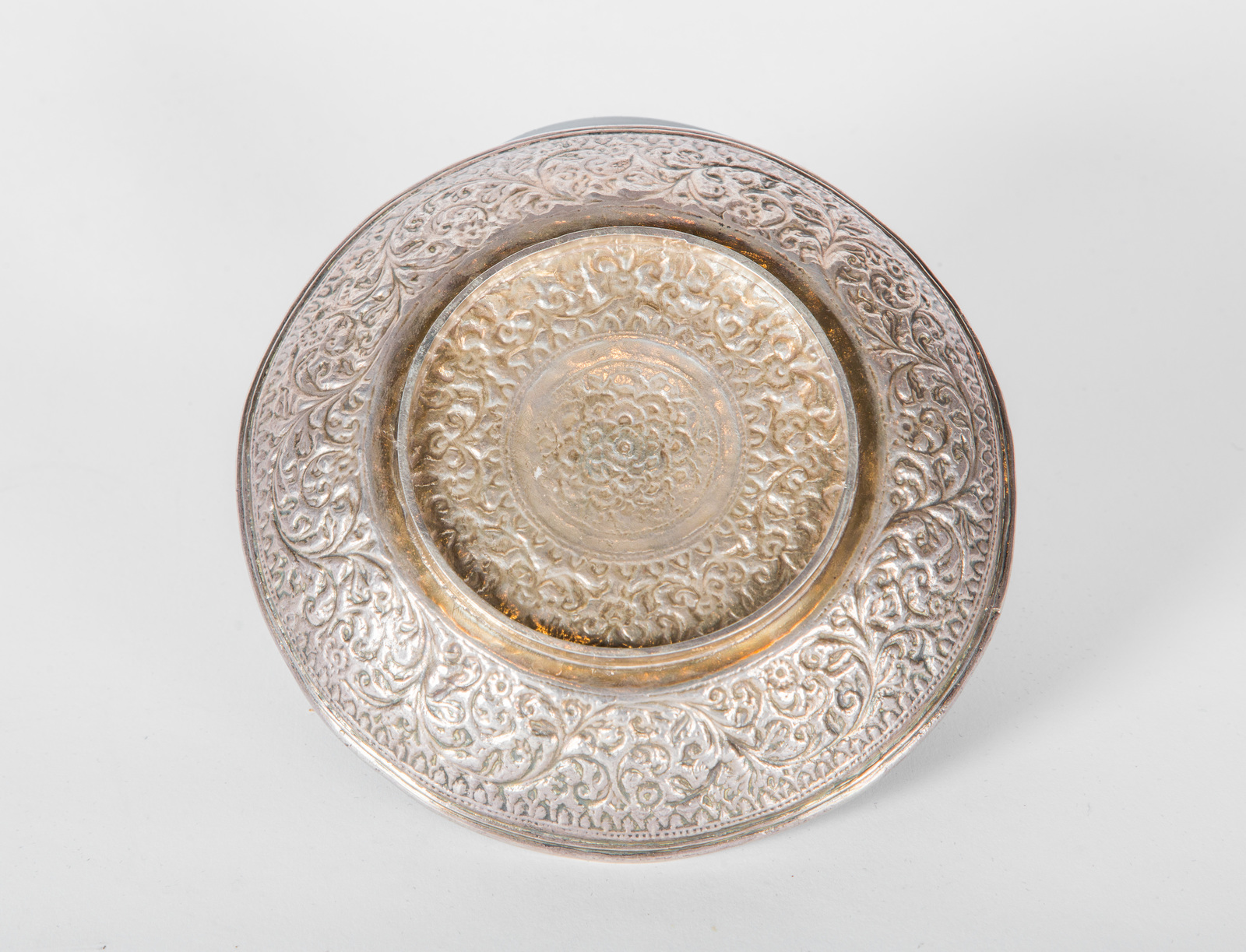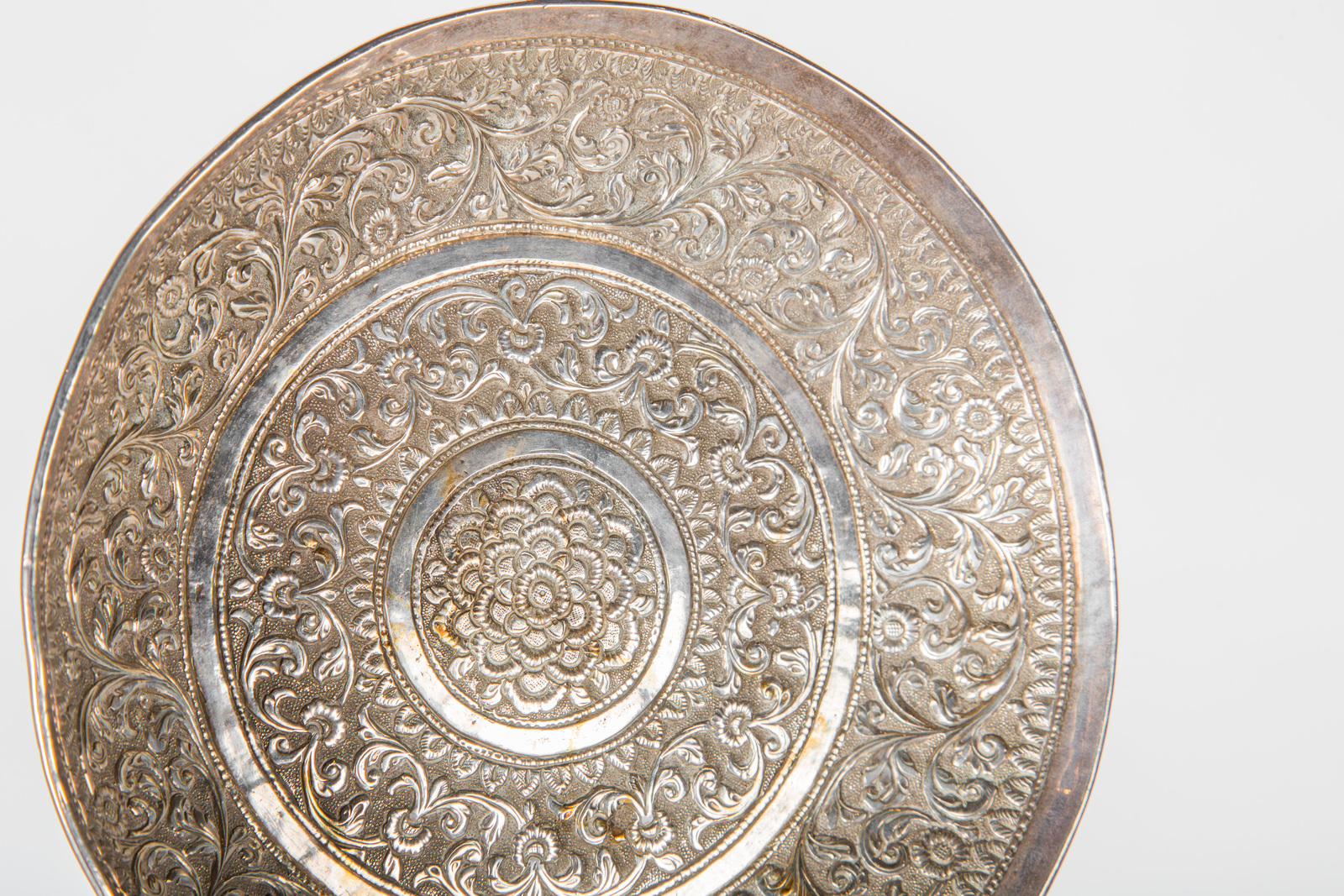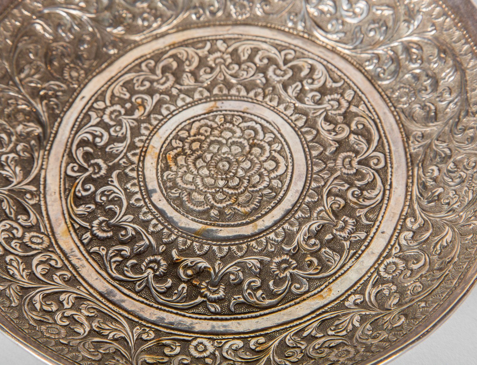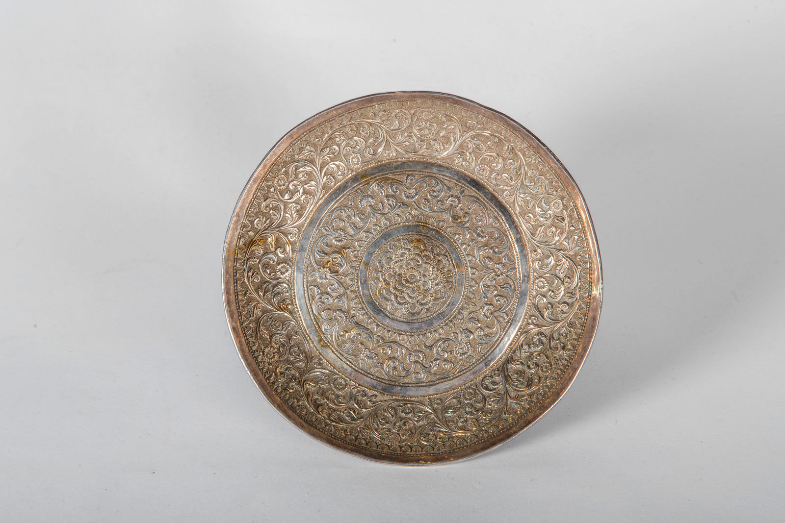 Arte Indiana Piccolo piatto in argento finemente sbalzato a motivi vegetali intrecciati