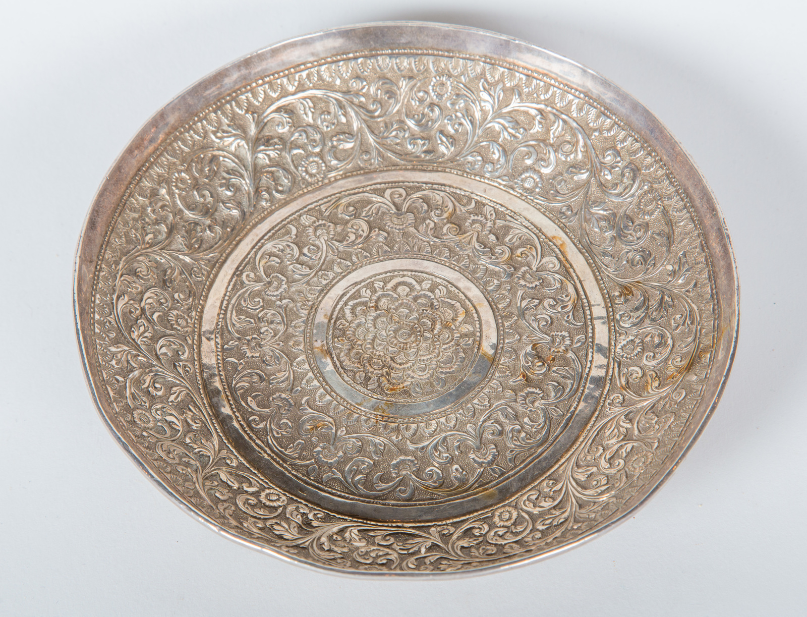 Indian Art A silver small dish finely embossed with interlaced vegetal motifs