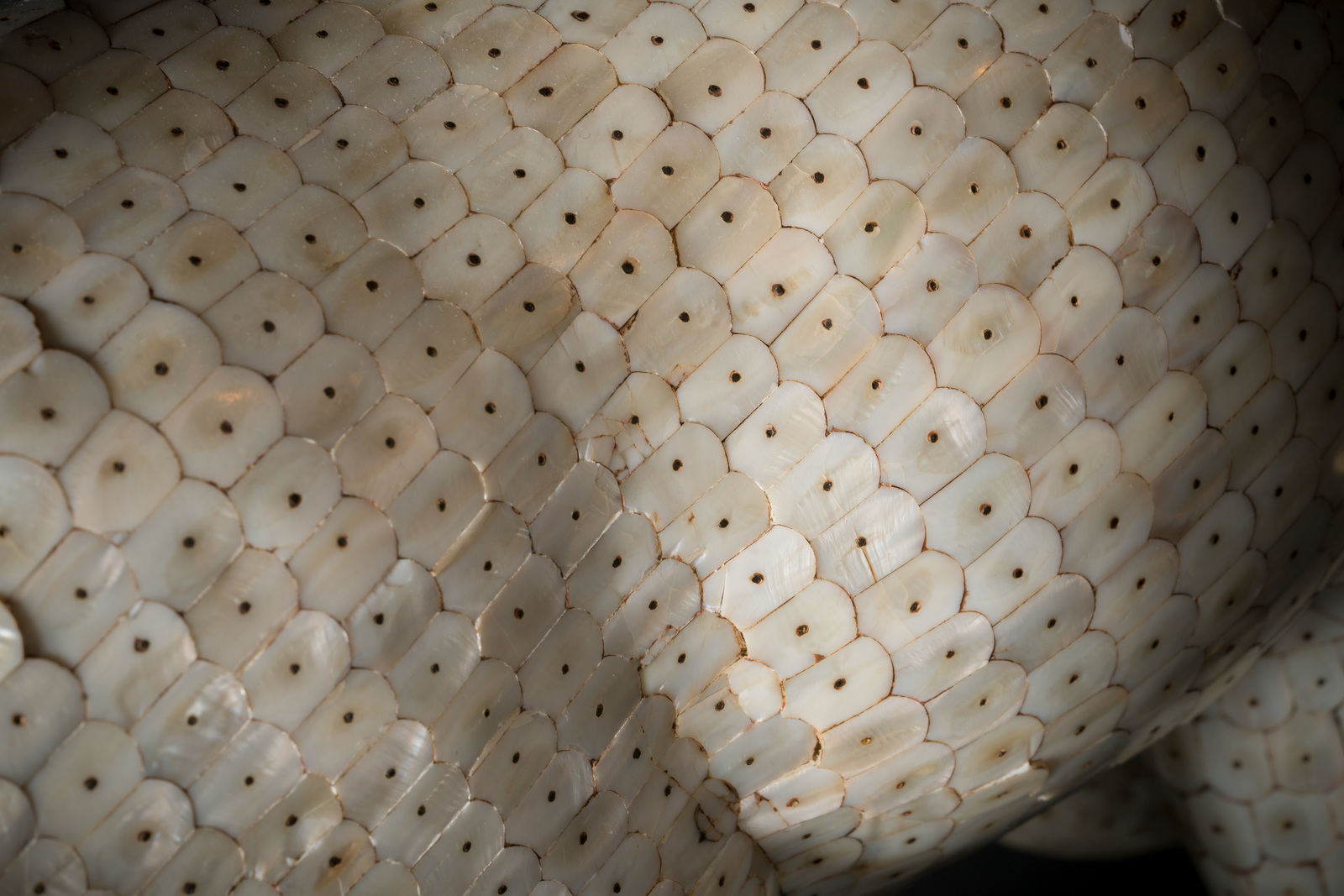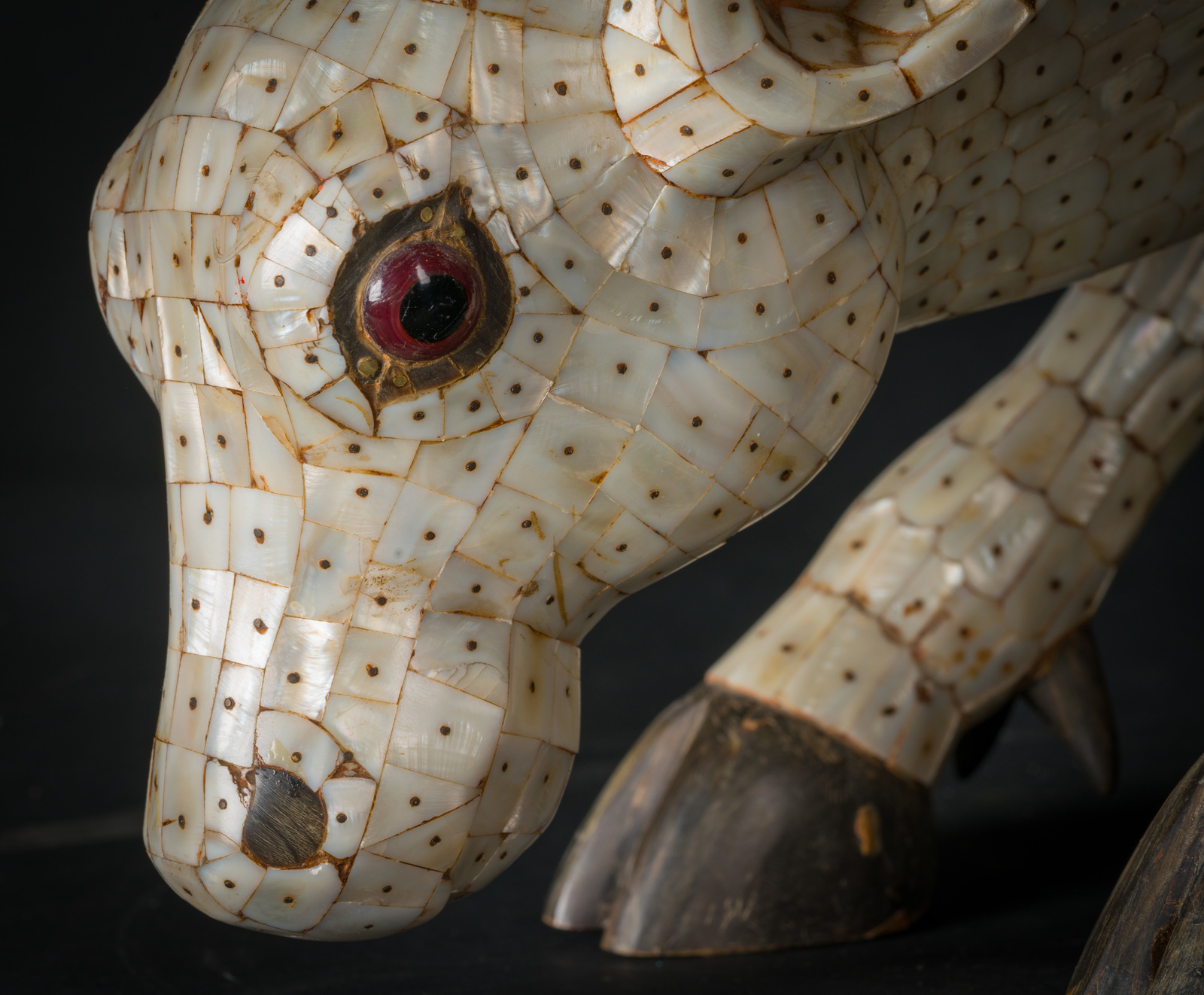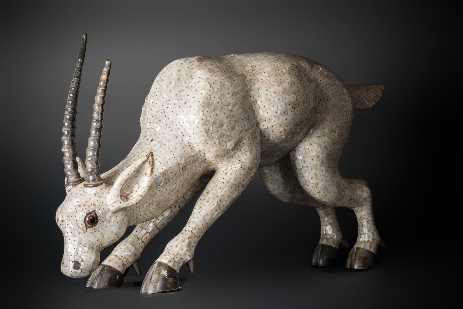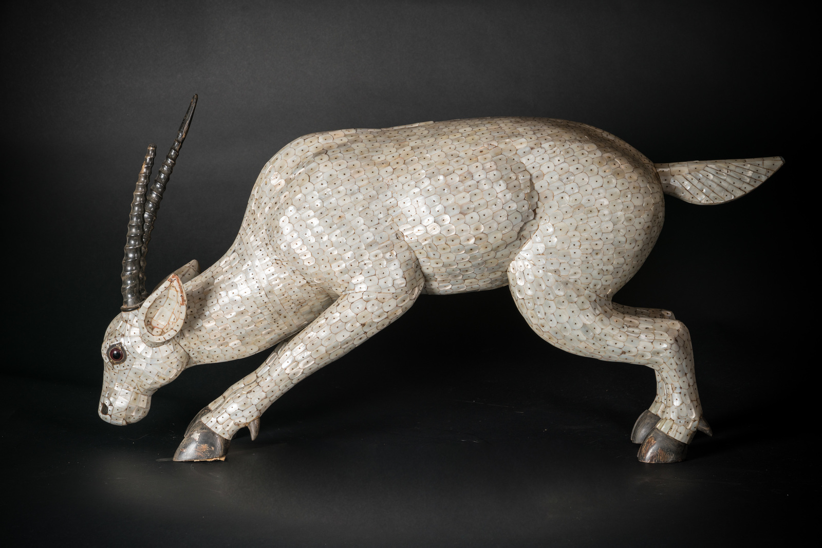 Indian Art A wooden sculpture depicting an antelope covered with mother-of-pearl scales India, possibly Gujarat, late 19th-early 20th century . . Cm 80,00 x 40,00.